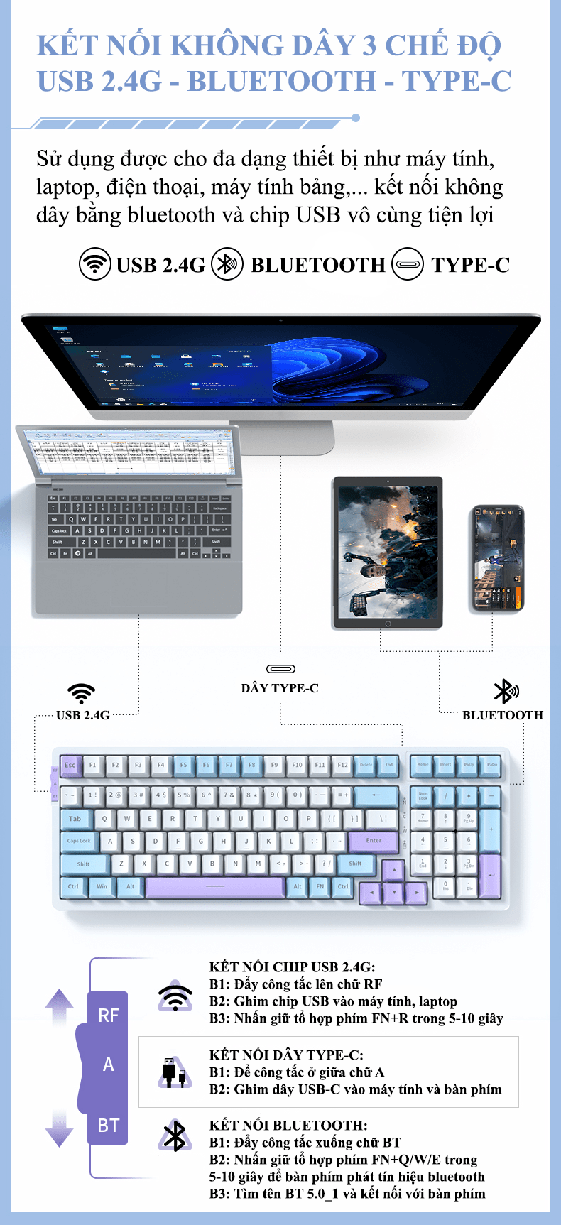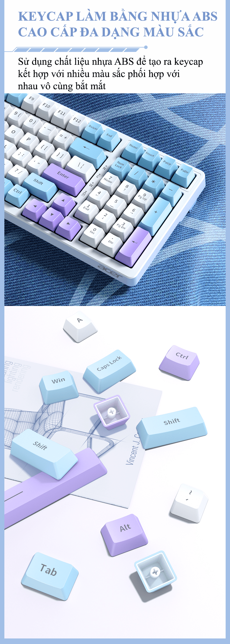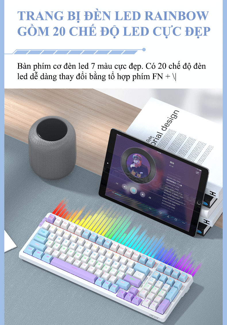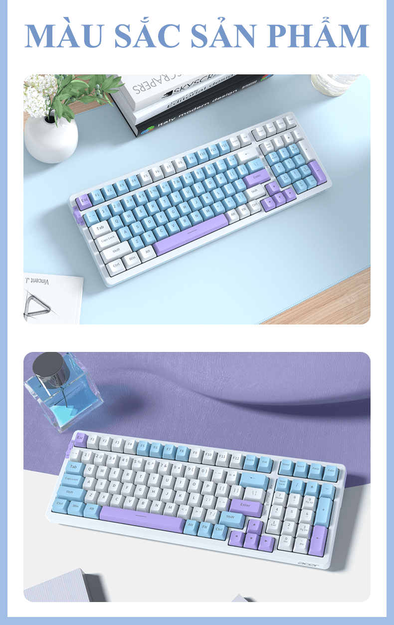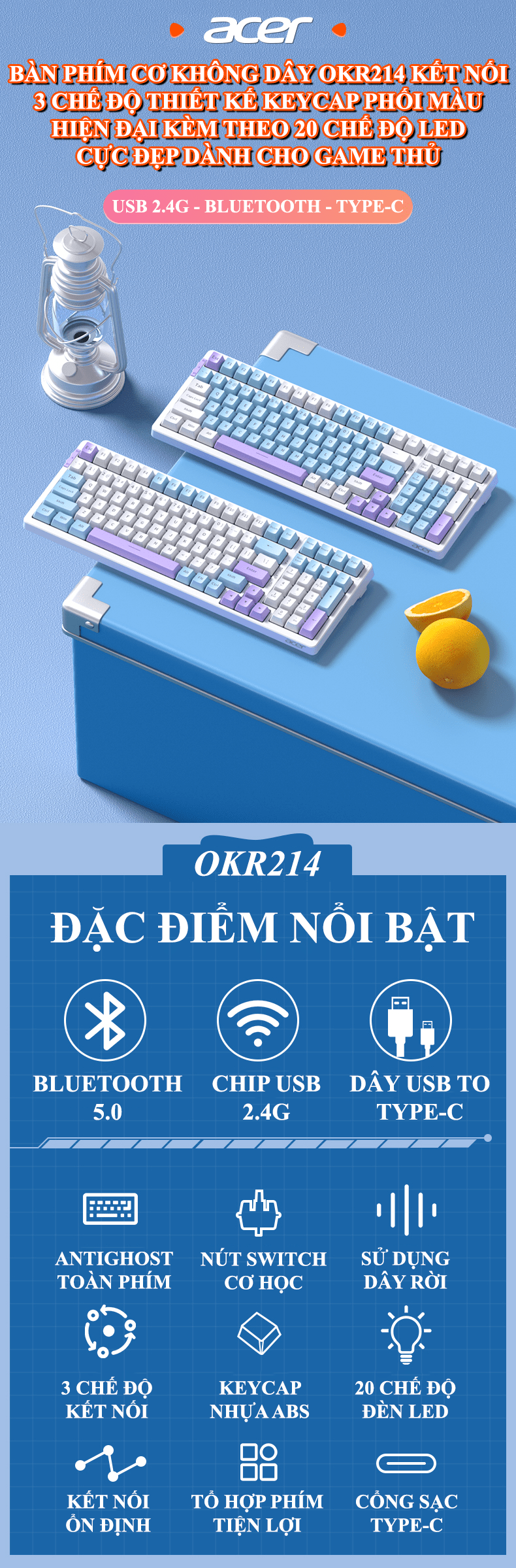 Bàn phím cơ Acer OKR214 kết nối 3 chế độ Bluetooth - 2.4G - Dây Type-C thiết kế 100 phím phối màu đẹp mắt kèm theo 20 chế độ led dành cho game thủ