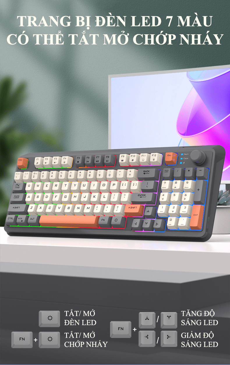 Đèn led nền và led phím với 7 màu và tắt mở, chớp nháy.