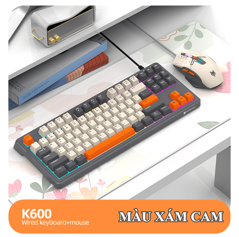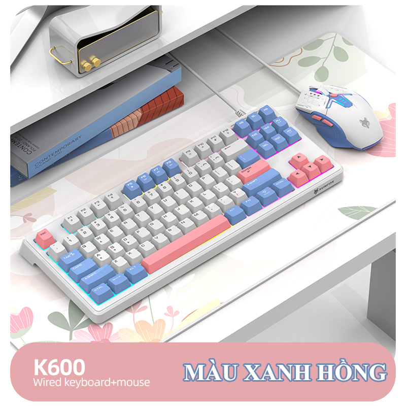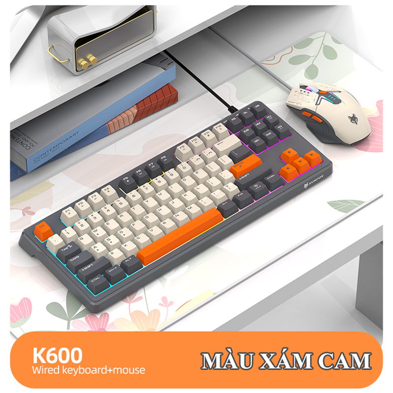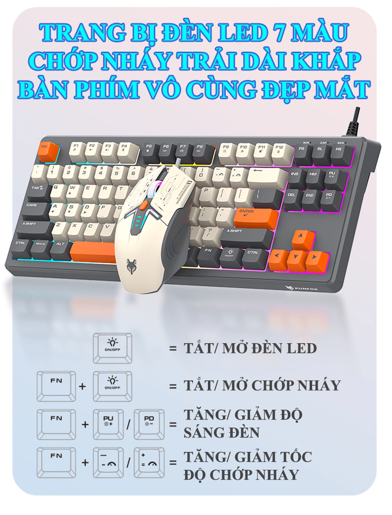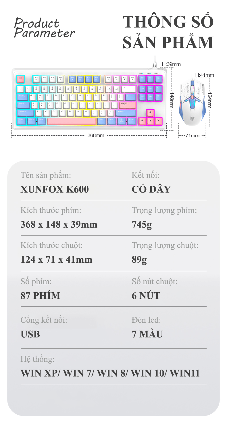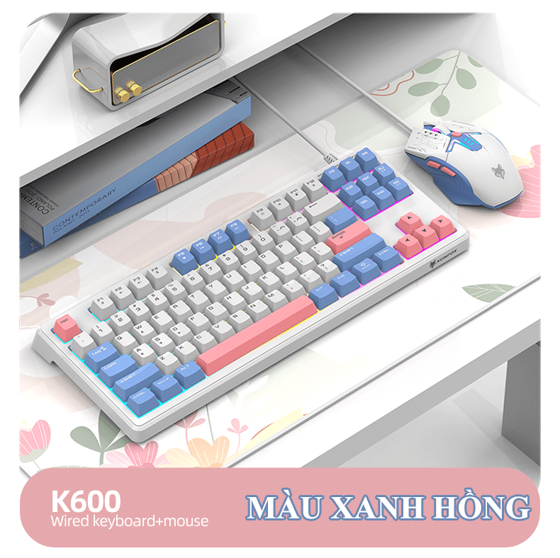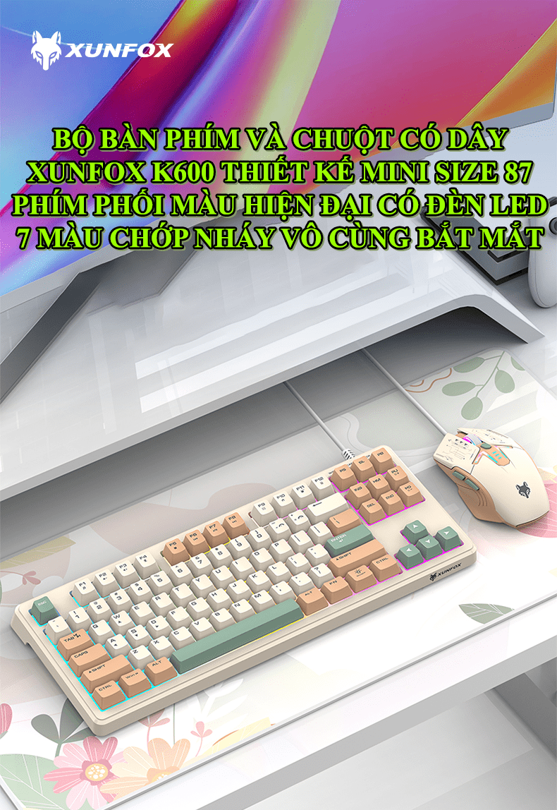 Bộ bàn phím và chuột có dây chơi game XUNFOX K600 thiết kế phím mini size 87 phím có đèn led 7 màu chớp nháy cực đẹp