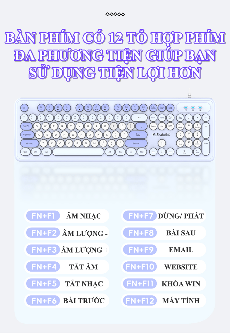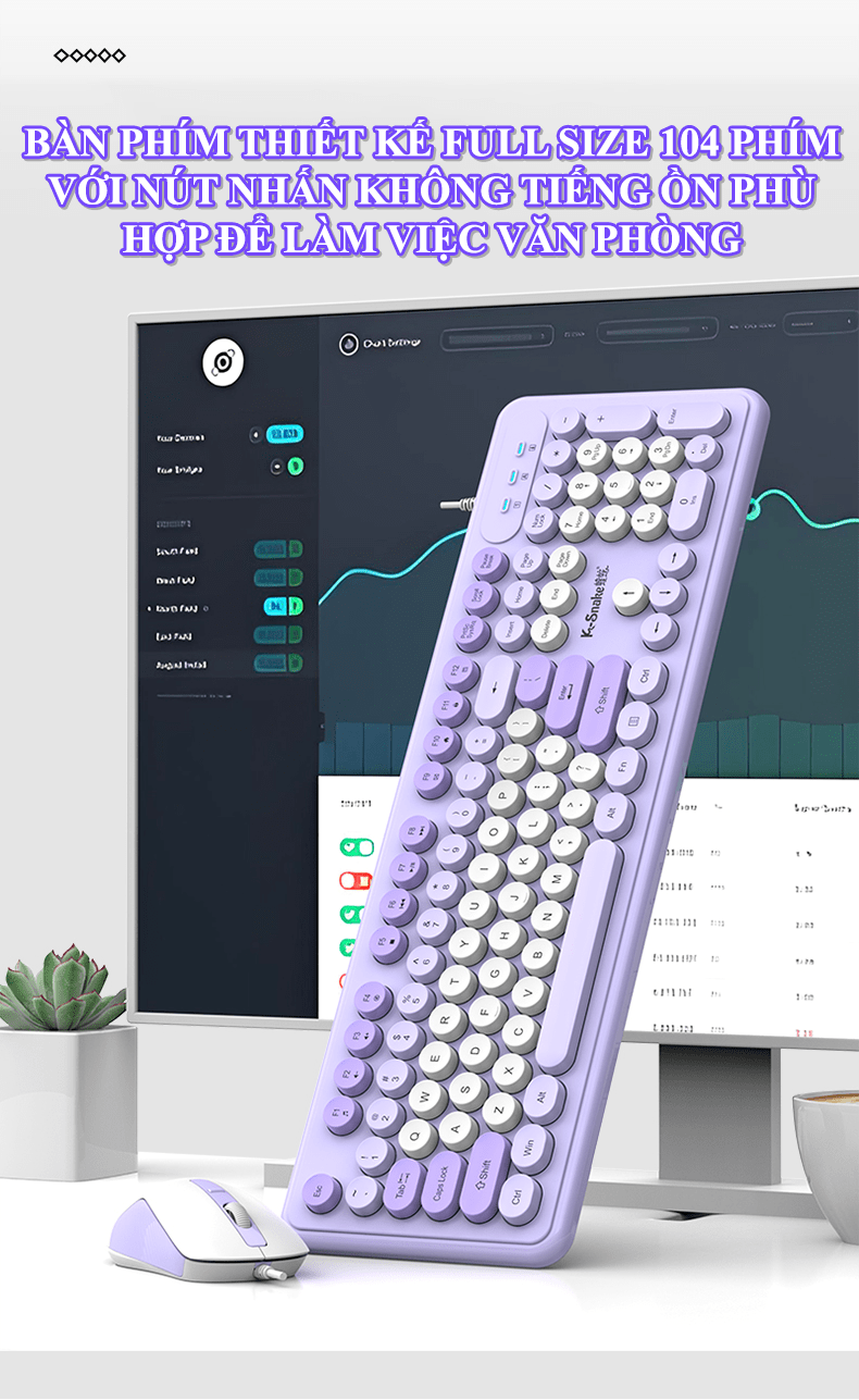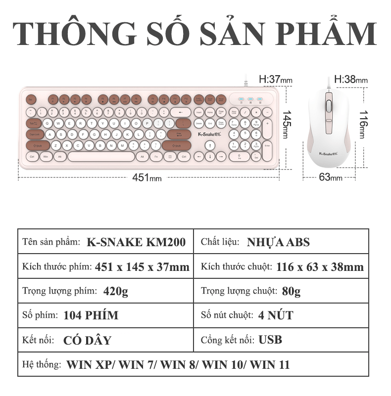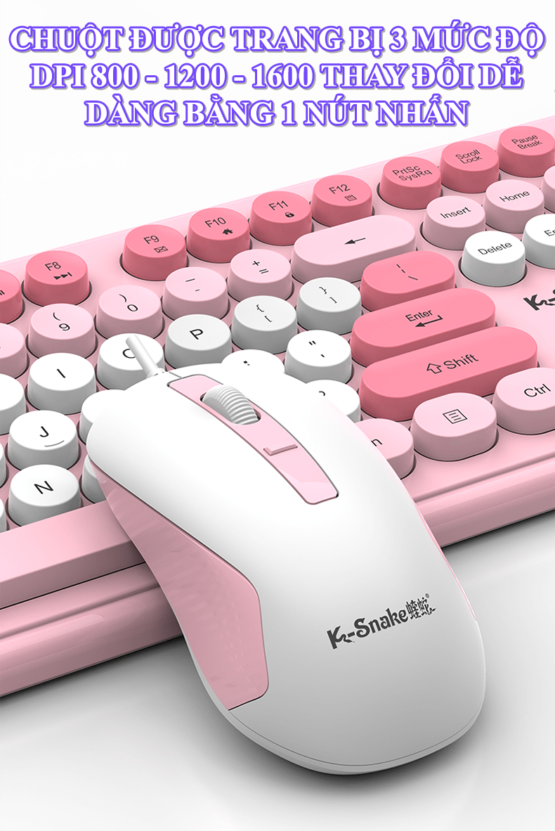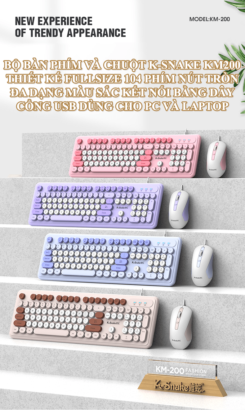Bộ bàn phím và chuột K-SNAKE KM200 kết nối bằng dây cổng USB thiết kế nút tròn fullsize 104 phím đa dạng màu sắc