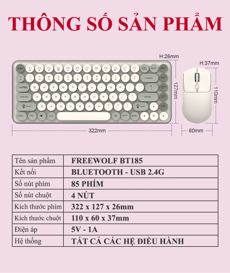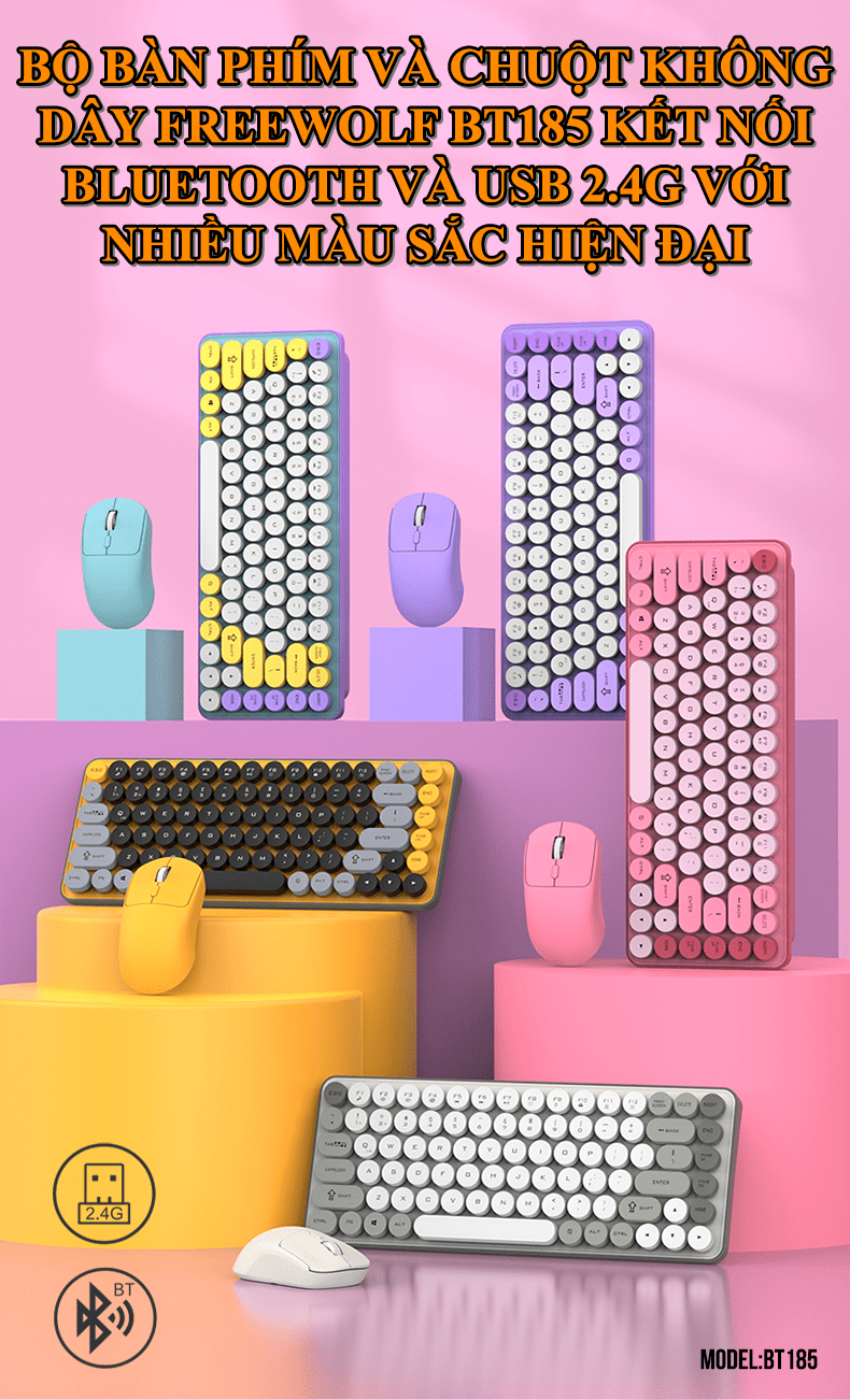 Bộ bàn phím và chuột không dây FREEWOLF BT185 thiết kế mini size 85 nhiều màu sắc kết nối bằng Bluetooth và USB 2.4G