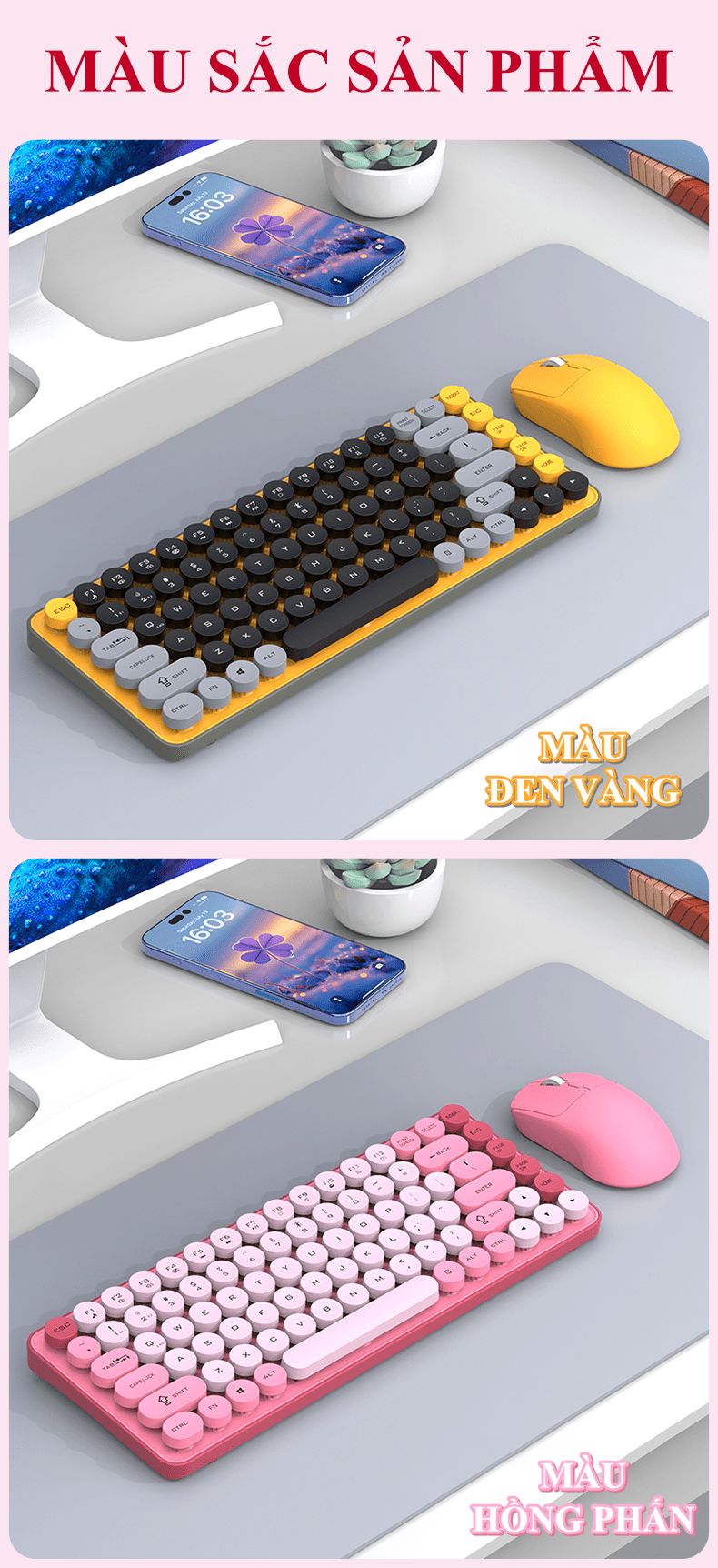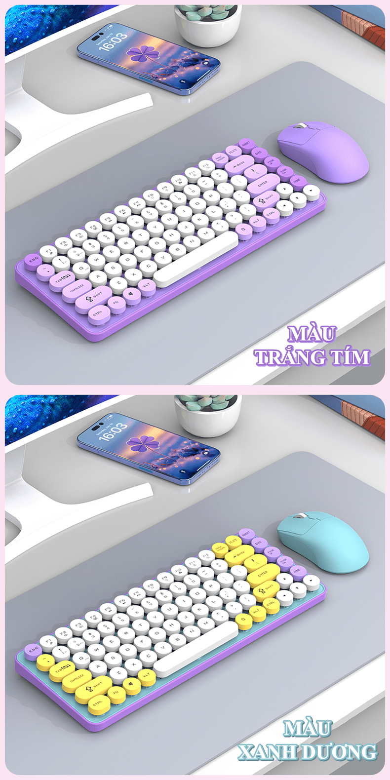 - Thiết kế thời trang hiện đại, nhiều màu sắc: Thường có các phiên bản phối màu pastel nhẹ nhàng (như hồng, xanh mint, trắng, tím) hoặc các màu sắc tươi sáng, rất phù hợp với xu hướng setup bàn làm việc đẹp (desktop setup).