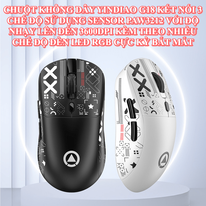 Chuột không dây YINDIAO G18 kết nối 3 chế độ sử dụng sensor PAW3212 độ nhạy lên đến 3600DPI kèm theo nhiều chế độ led RGB cực đẹp