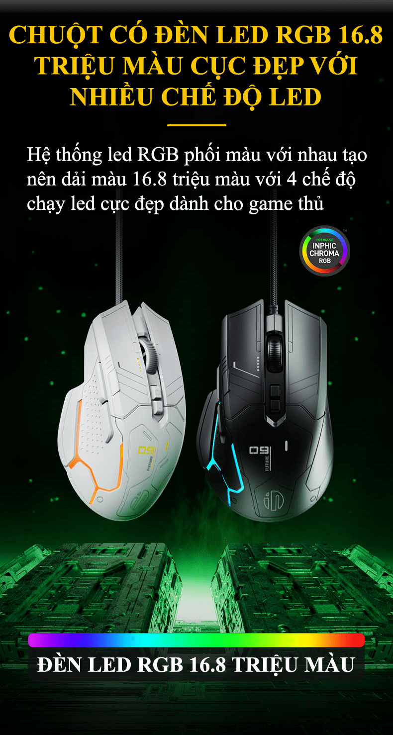 Chuột chơi game có dây INPHIC PG9 đèn led RGB 16.8 triệu màu với độ nhạy lên đến 12800DPI có app điều chỉnh marco chuyên game dành cho game thủ