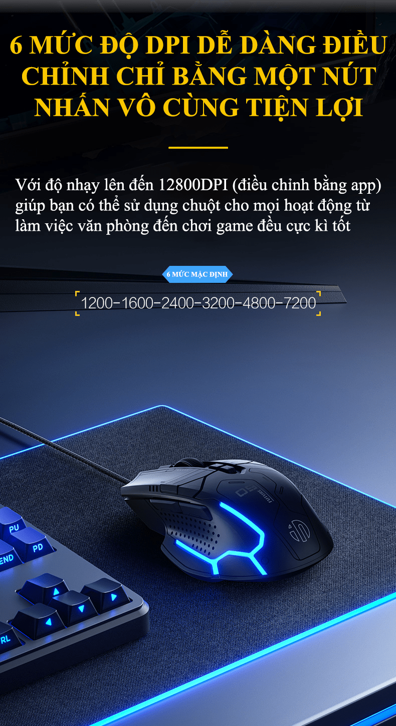 DPI: 1200/ 1600/ 2400/ 3200/ 4800/ 7200 (dùng app để chỉnh từ 200-12800DPI)