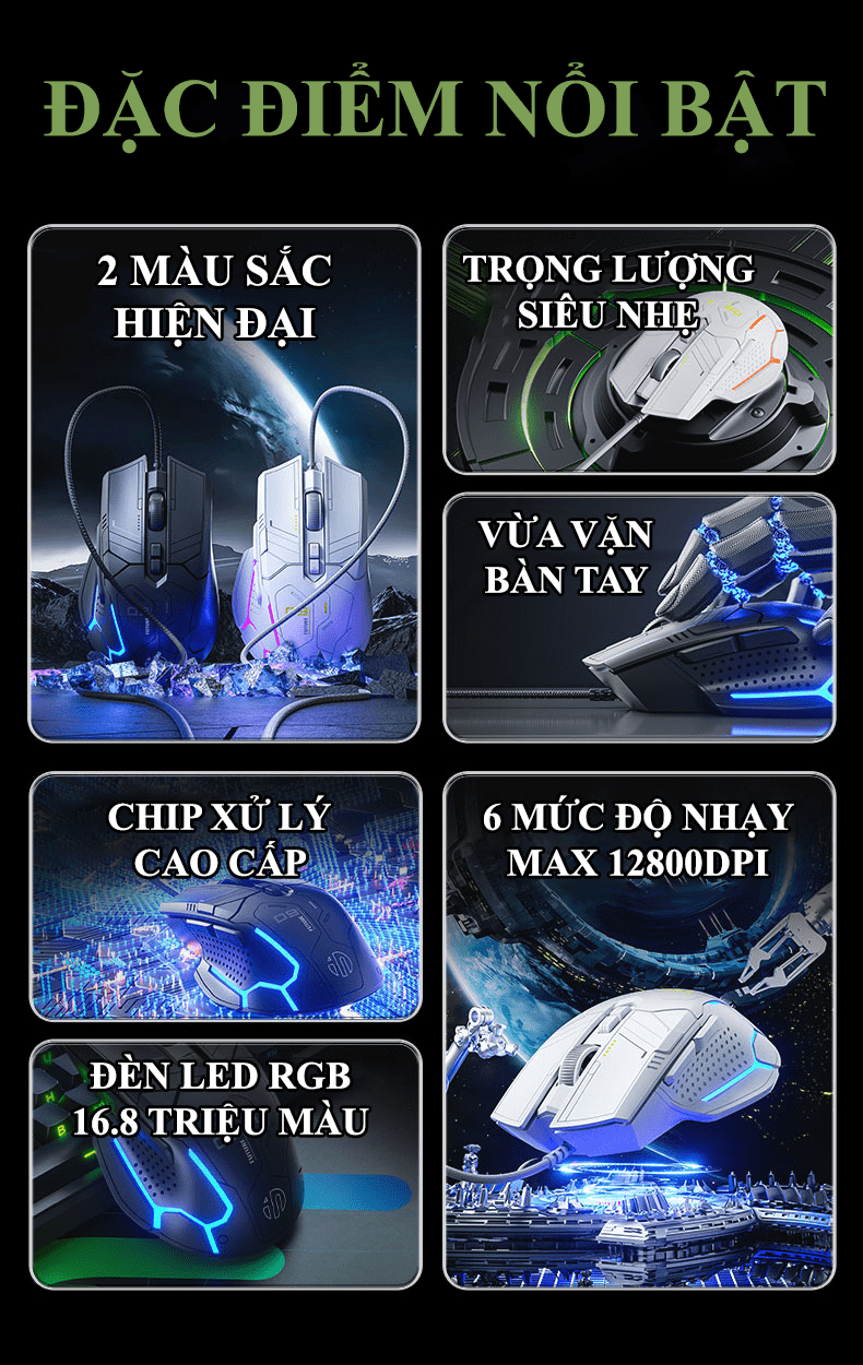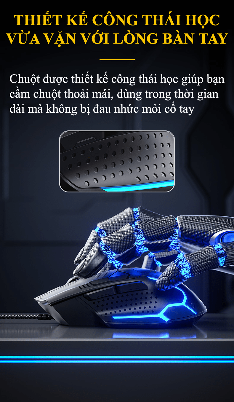 Tính năng nổi bật: chống mỏi tay, LED RGB, app marco