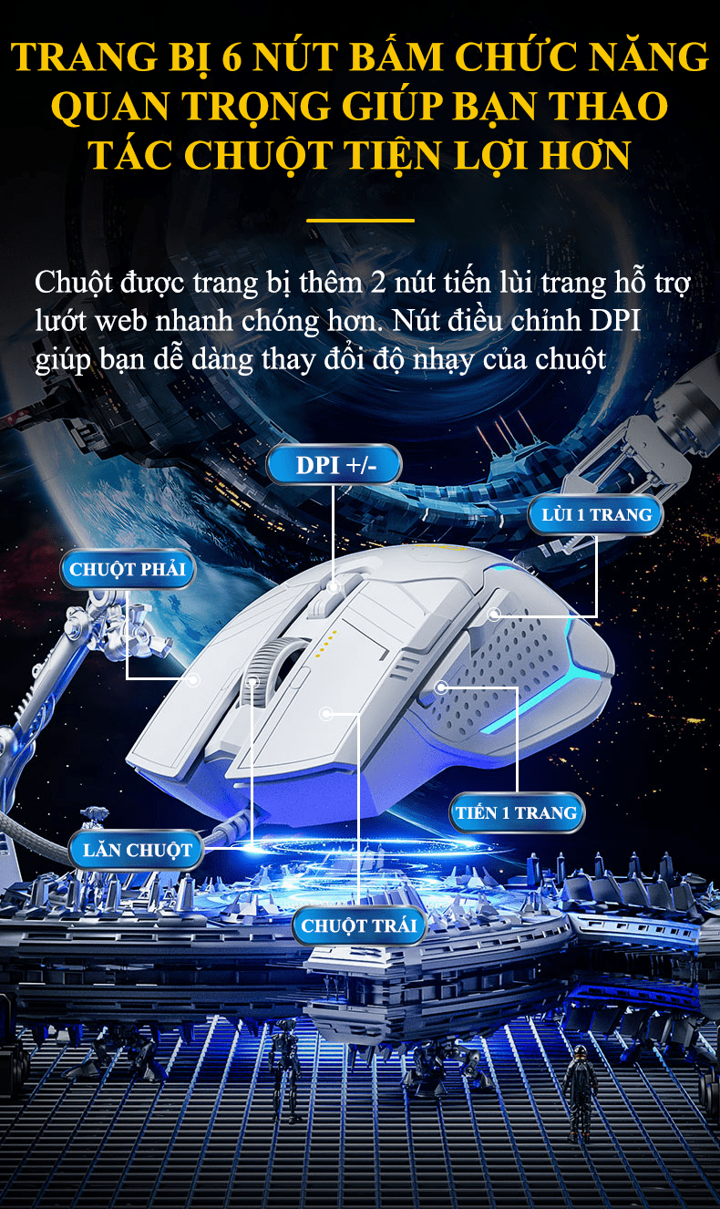 Có 6 phím bấm: Chuột trái, chuột phải, con lăn, nút DPI, tiến trang, lùi trang