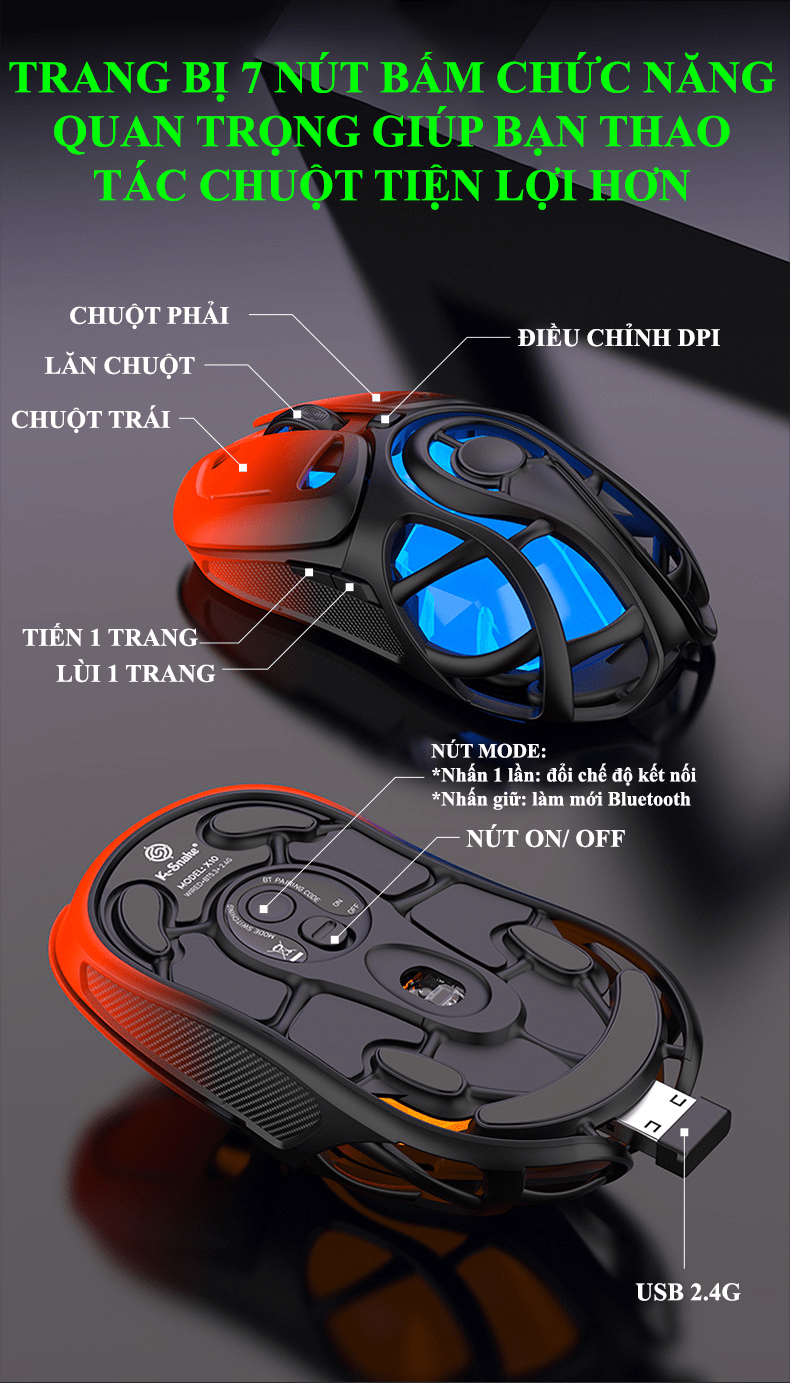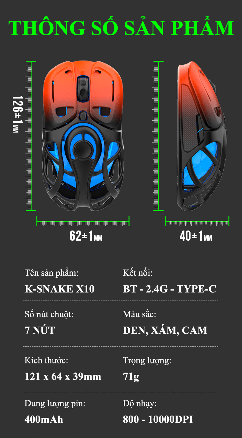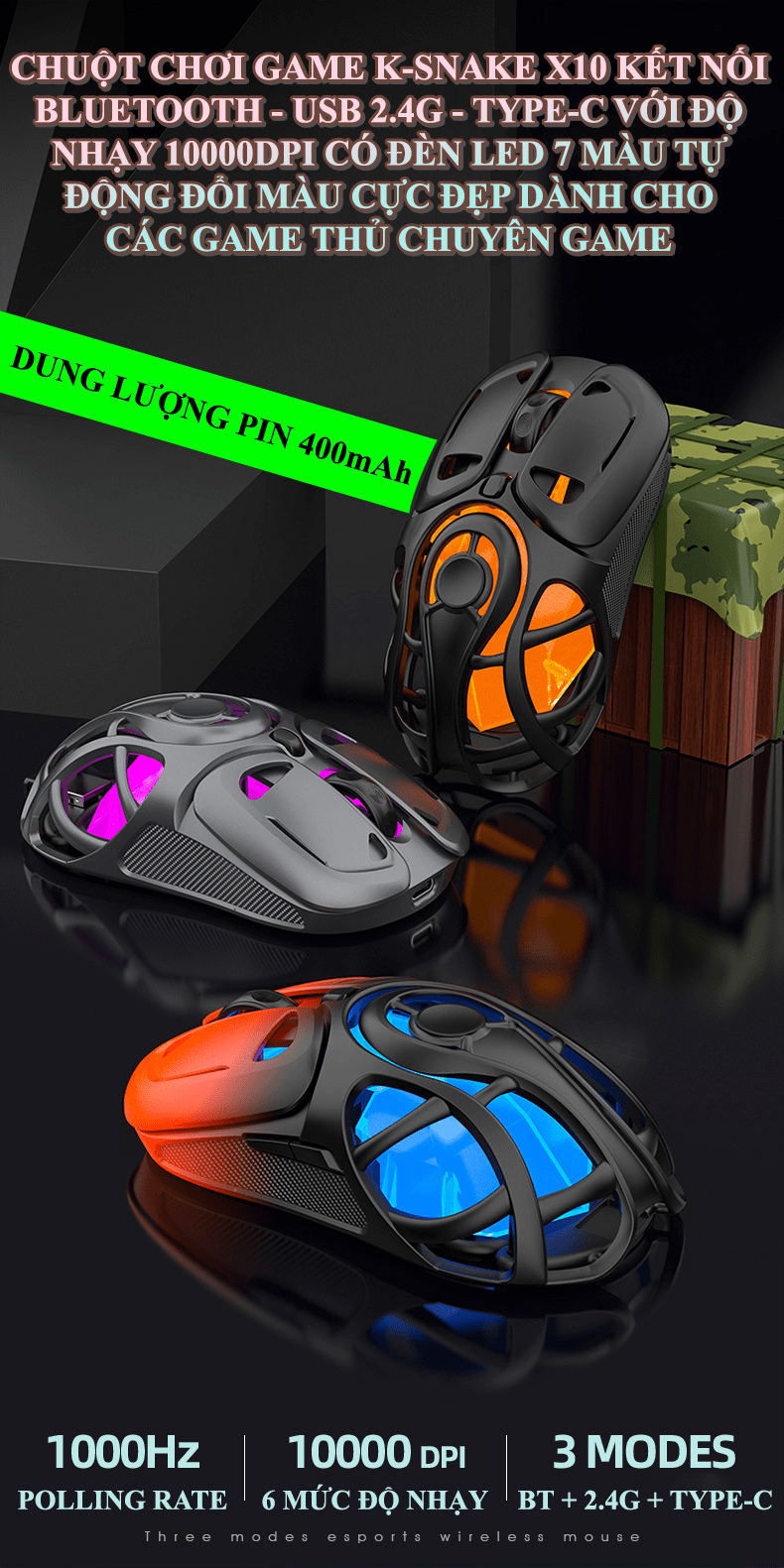 Chuột chuyên game K-SNAKE X10 kết nối 3 chế độ BT - 2.4G - TYPE-C độ nhạy lên đến 10000DPI có đèn led 7 màu cực đẹp kèm theo dung lượng pin lớn 400mAh