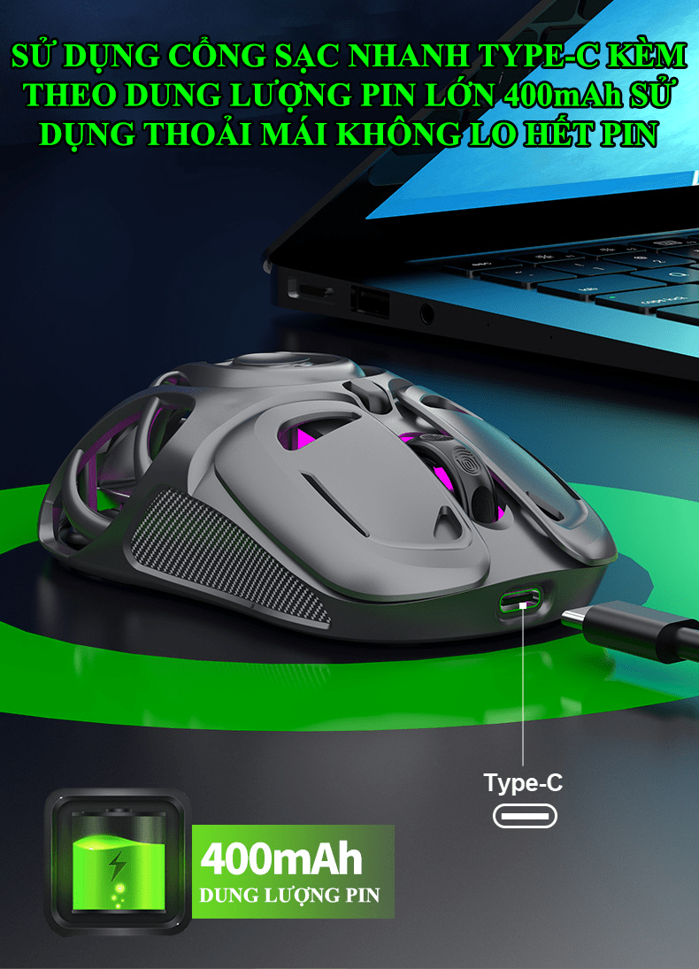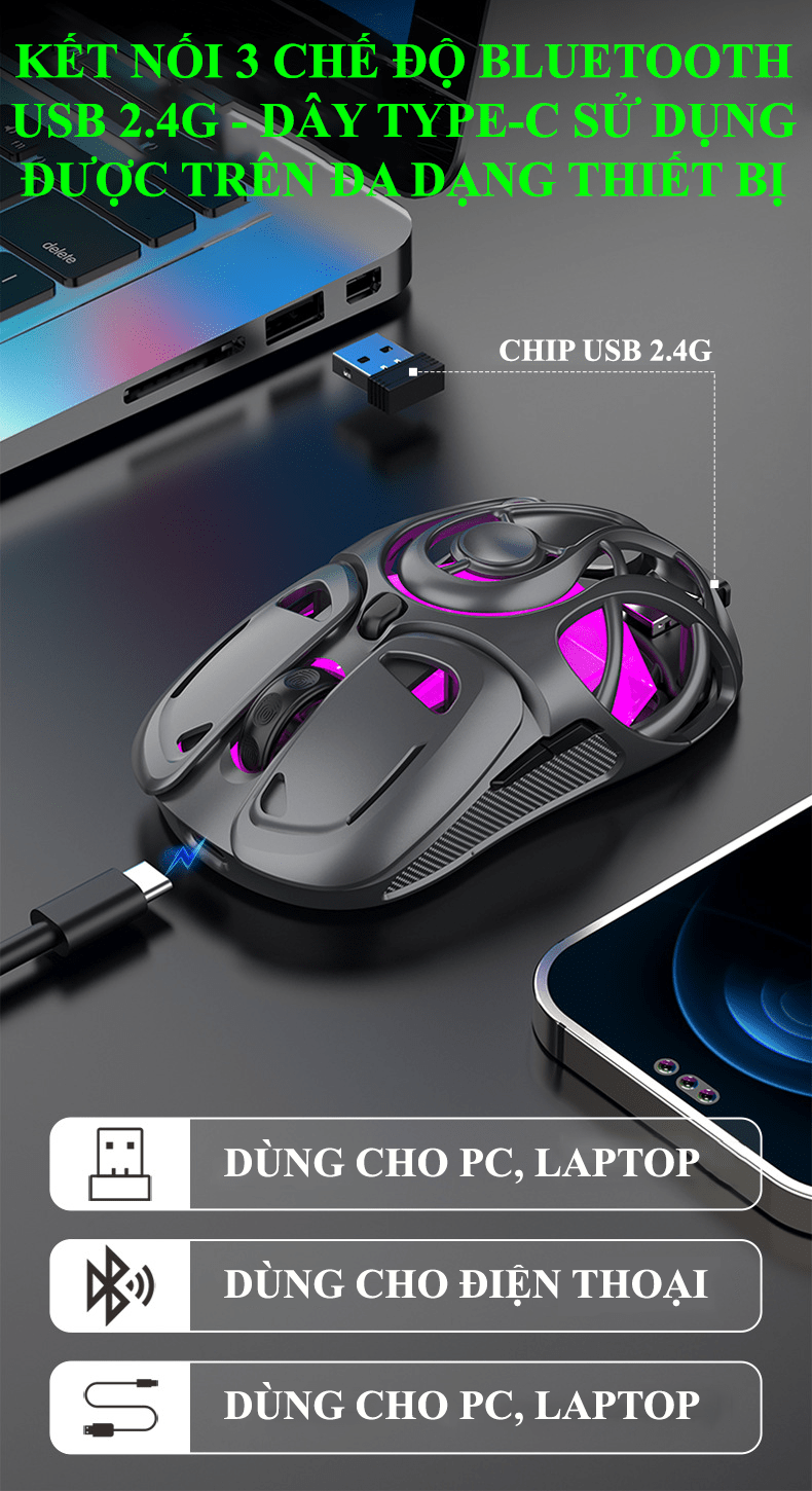 Kết nối đa chế độ: Bluetooth (BT) tiện lợi khi sử dụng không dây với nhiều thiết bị, 2.4G (USB Receiver) độ trễ thấp, ổn định, phù hợp cho game, TYPE-C (Có dây) Vừa sạc vừa sử dụng, đảm bảo không gián đoạn.
