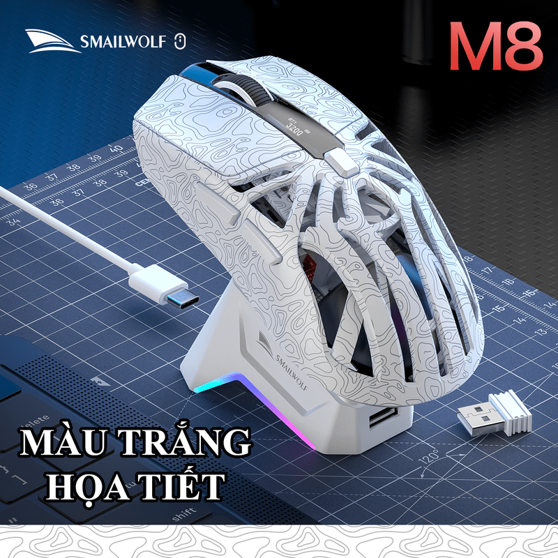Chuột chuyên game SMAILWOLF M8 kết nối không dây 3 chế độ với mắt đọc sensor PAW3311 độ nhạy 12000DPI kèm theo đế sạc cảm ứng đèn led RGB cực đẹp