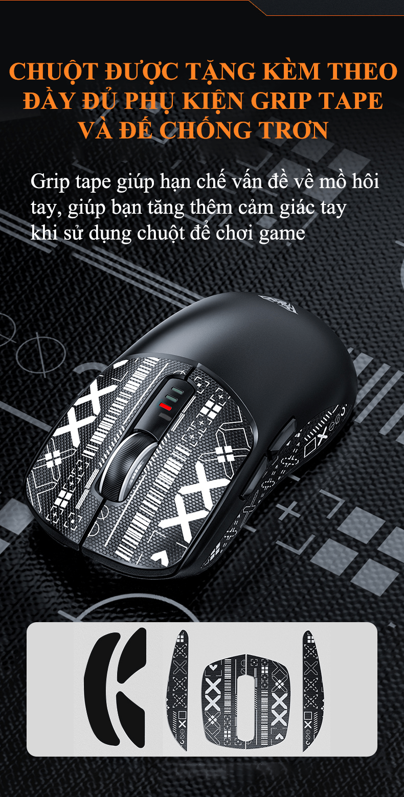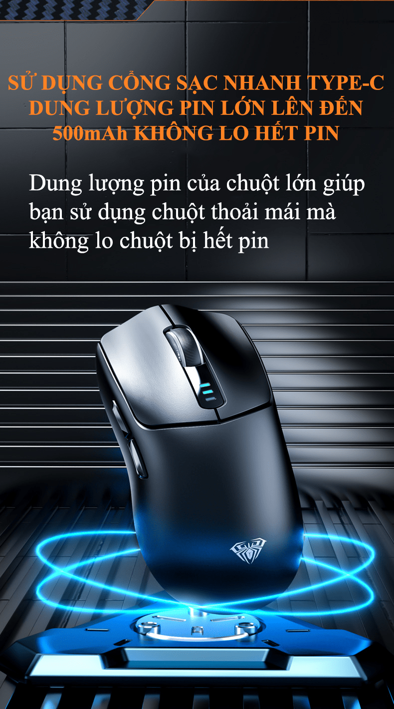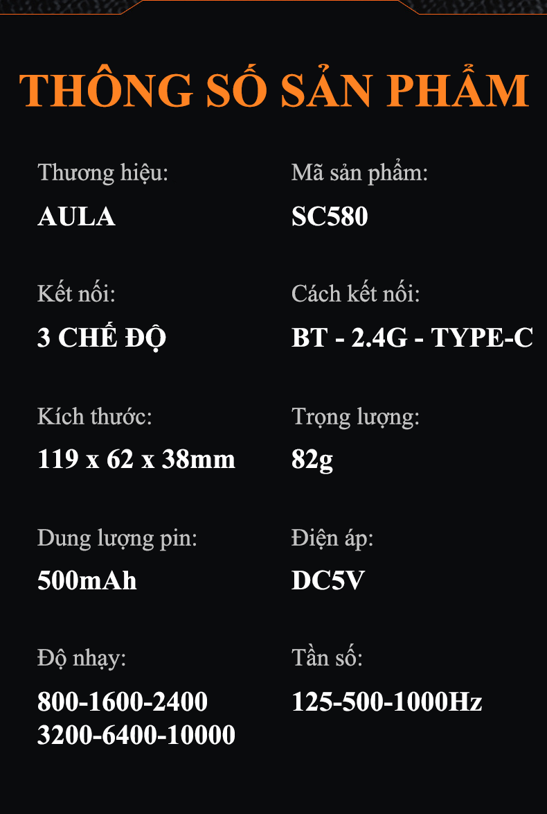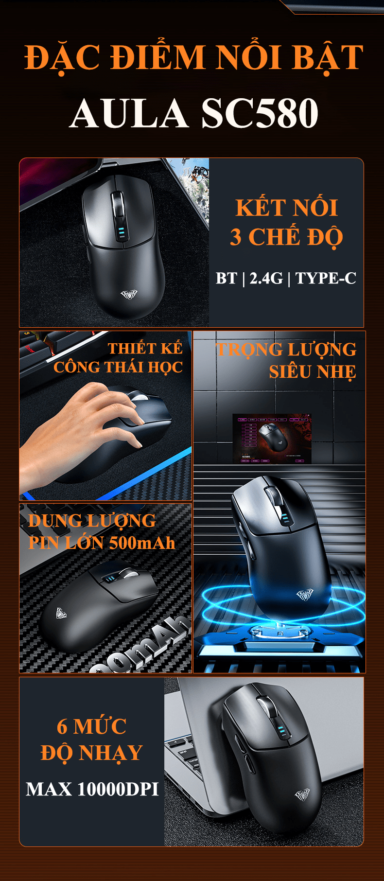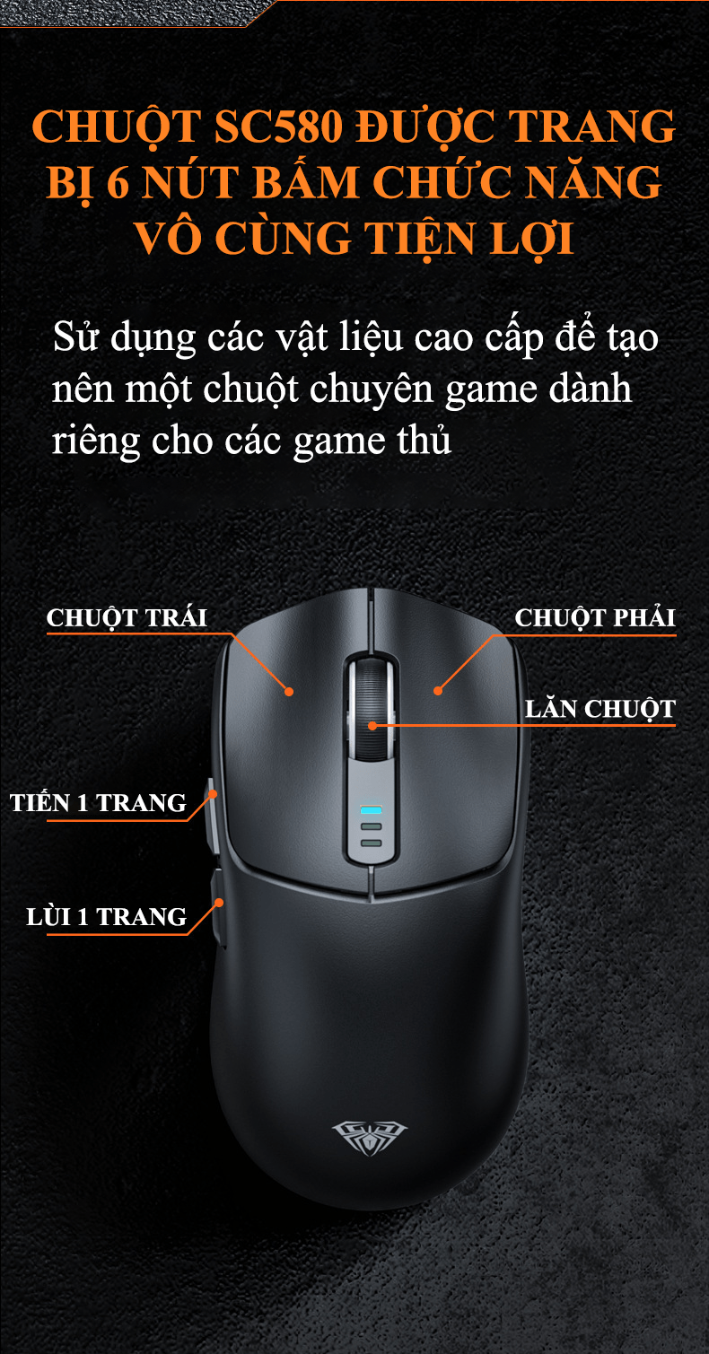 - Chuột không dây AULA SC580 được làm từ nhựa nhám chống mồ hôi, trơn trượt, bám vân tay