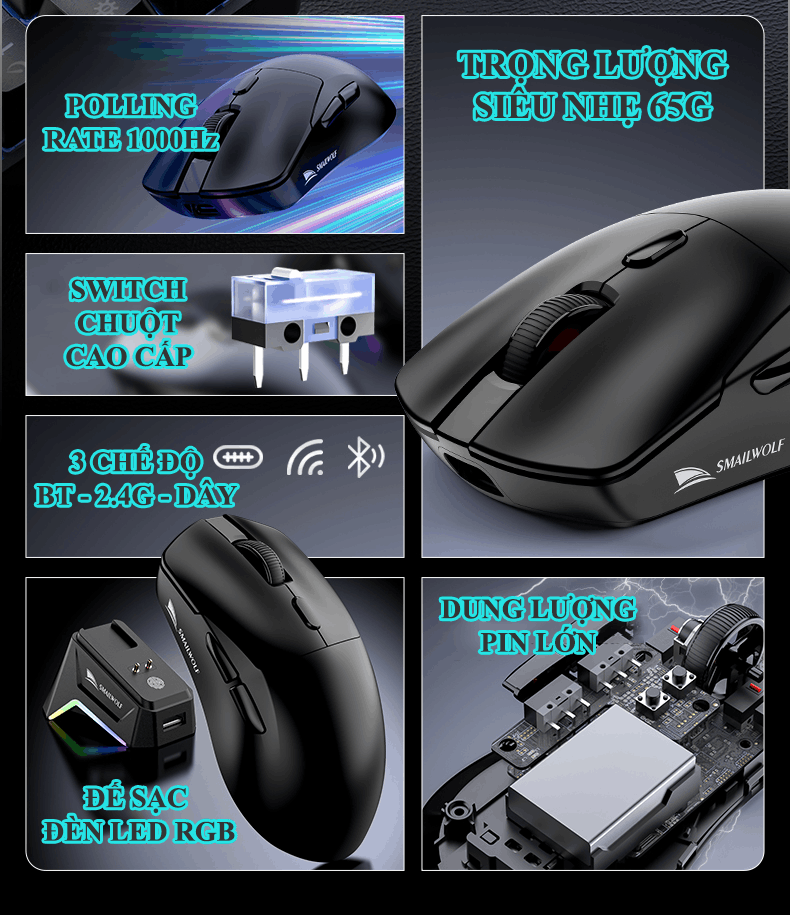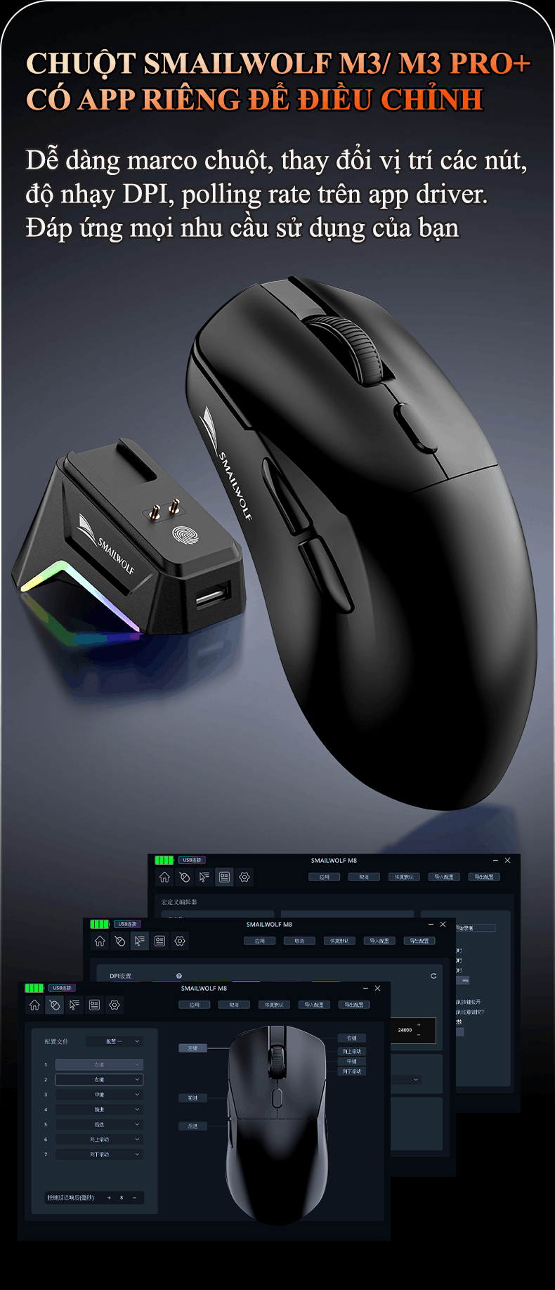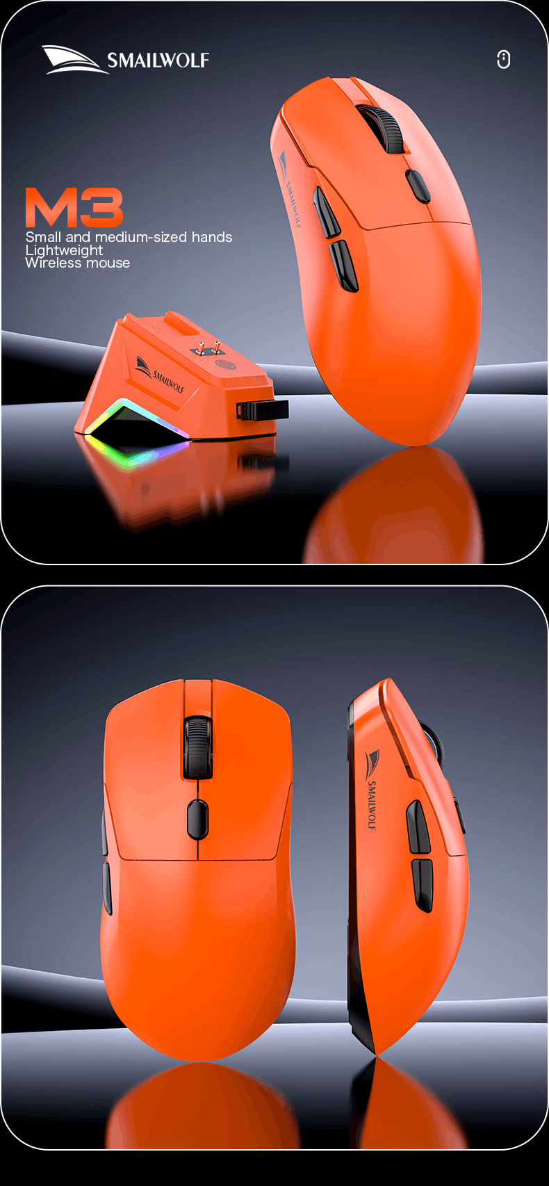 Chuột không dây chuyên game SMAILWOLF M3/ M3 PRO+ kết nối 3 chế độ BT - 2.4G - TYPE-C với độ nhạy lên đến 12000DPI kèm theo đế sạc không dây đèn led RGB