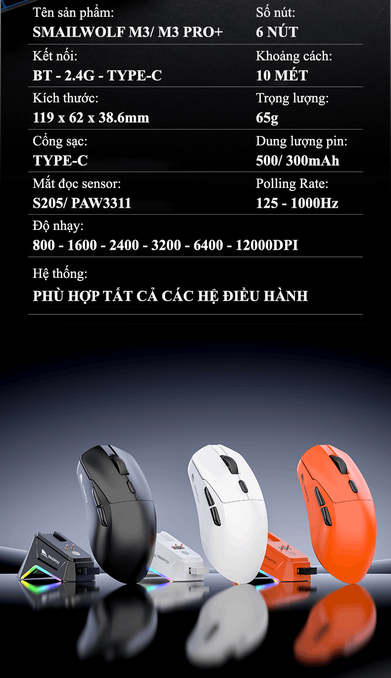Tổng Quan Chuột Không Dây Smailwolf M3/ M3 PRO+ Dựa trên các thông số, đây là một chiếc chuột chơi game với những ưu điểm nổi bật sau:
