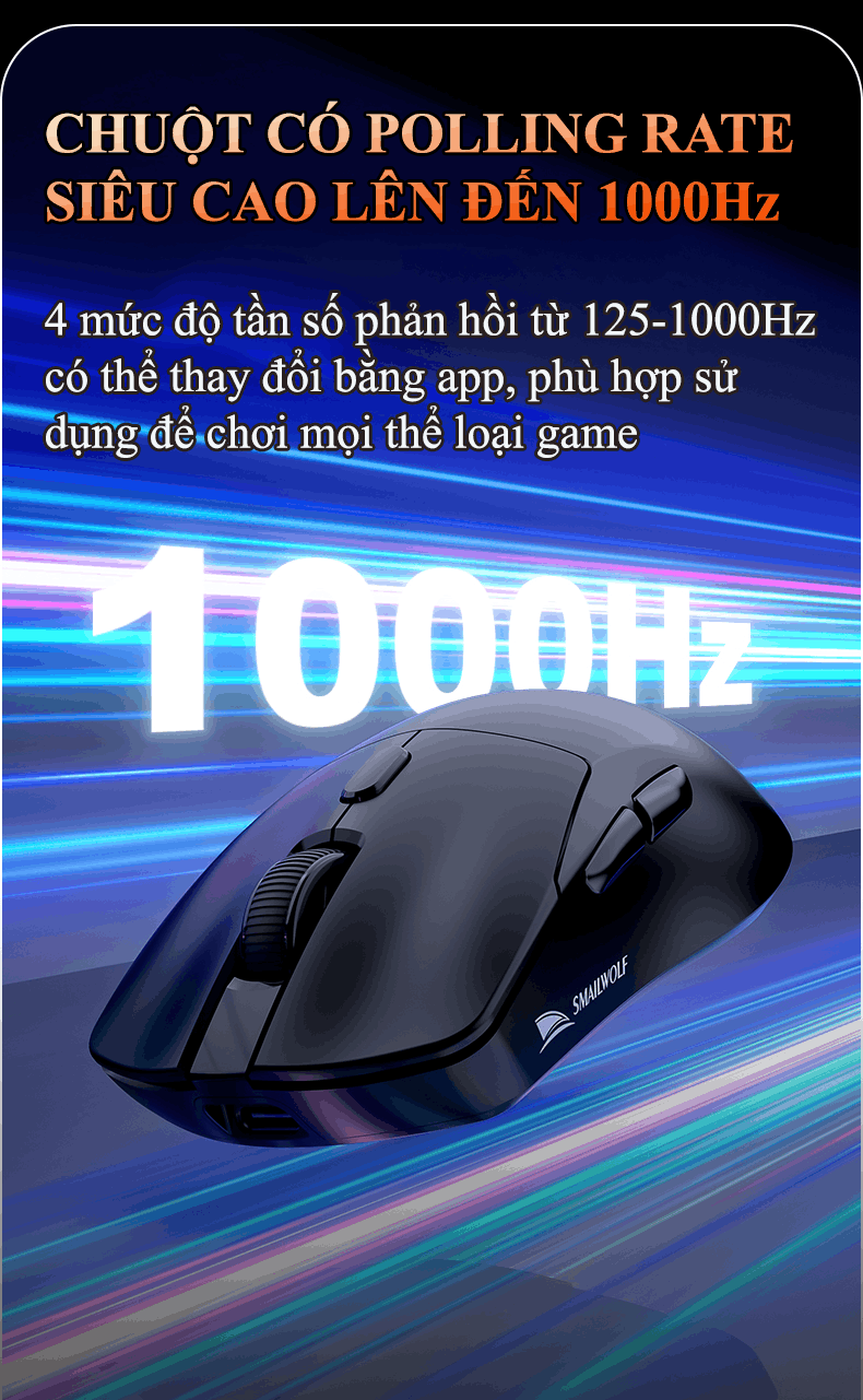 + Polling Rate (1000Hz): số lần chuột báo cáo vị trí của nó về máy tính trong một giây. 1000Hz có nghĩa là chuột gửi dữ liệu 1000 lần mỗi giây