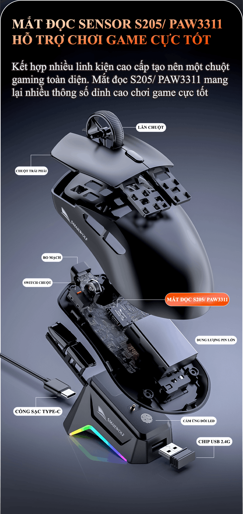 + Hiệu suất ổn định: Cảm biến S205/ PAW3311 là loại quang học hiện đại, cho khả năng theo dõi chính xác, ít trượt, ít treo khi sử dụng.