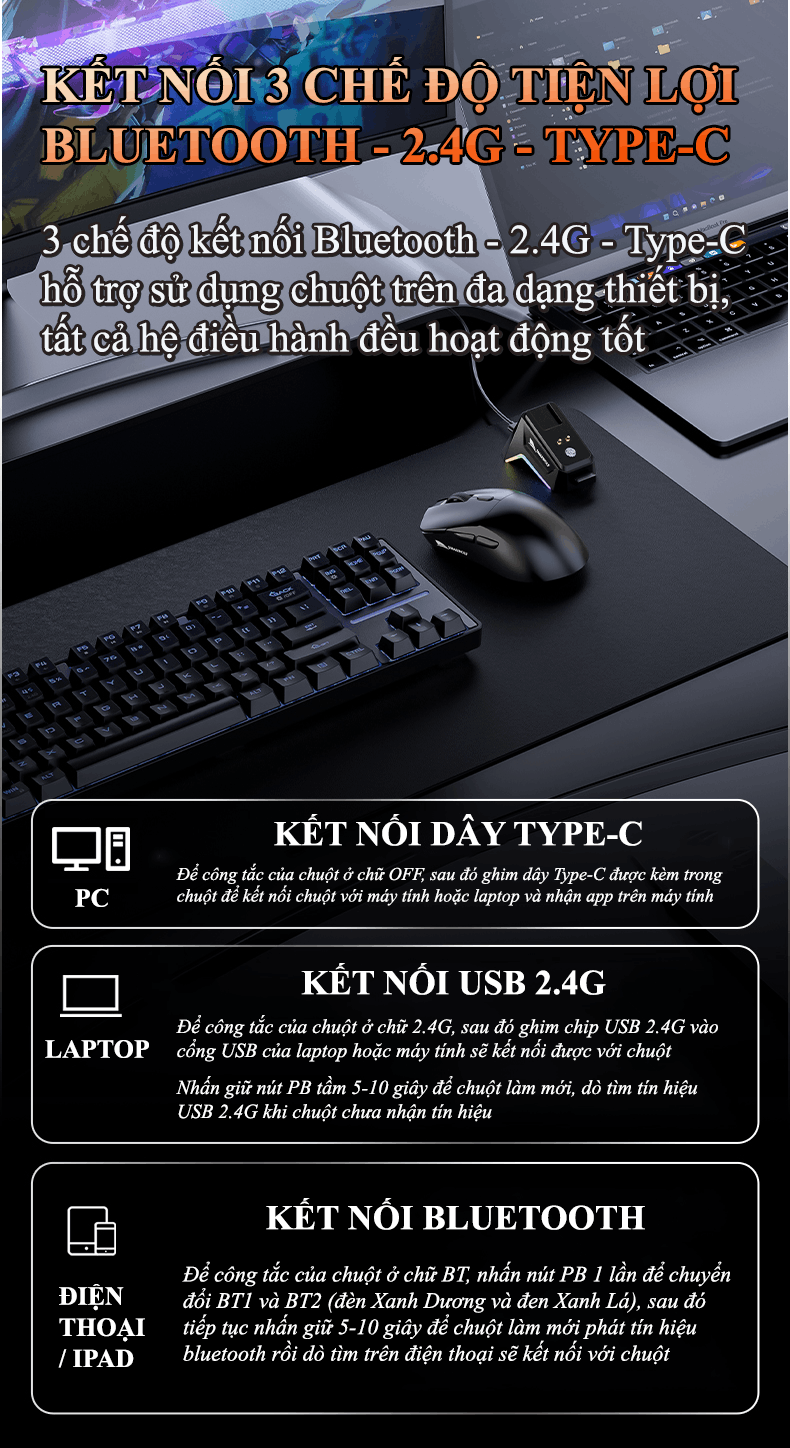 + 2.4GHz Wireless: Kết nối không dây qua cổng USB, cho độ trễ thấp, ổn định, là chế độ lý tưởng nhất để chơi game.