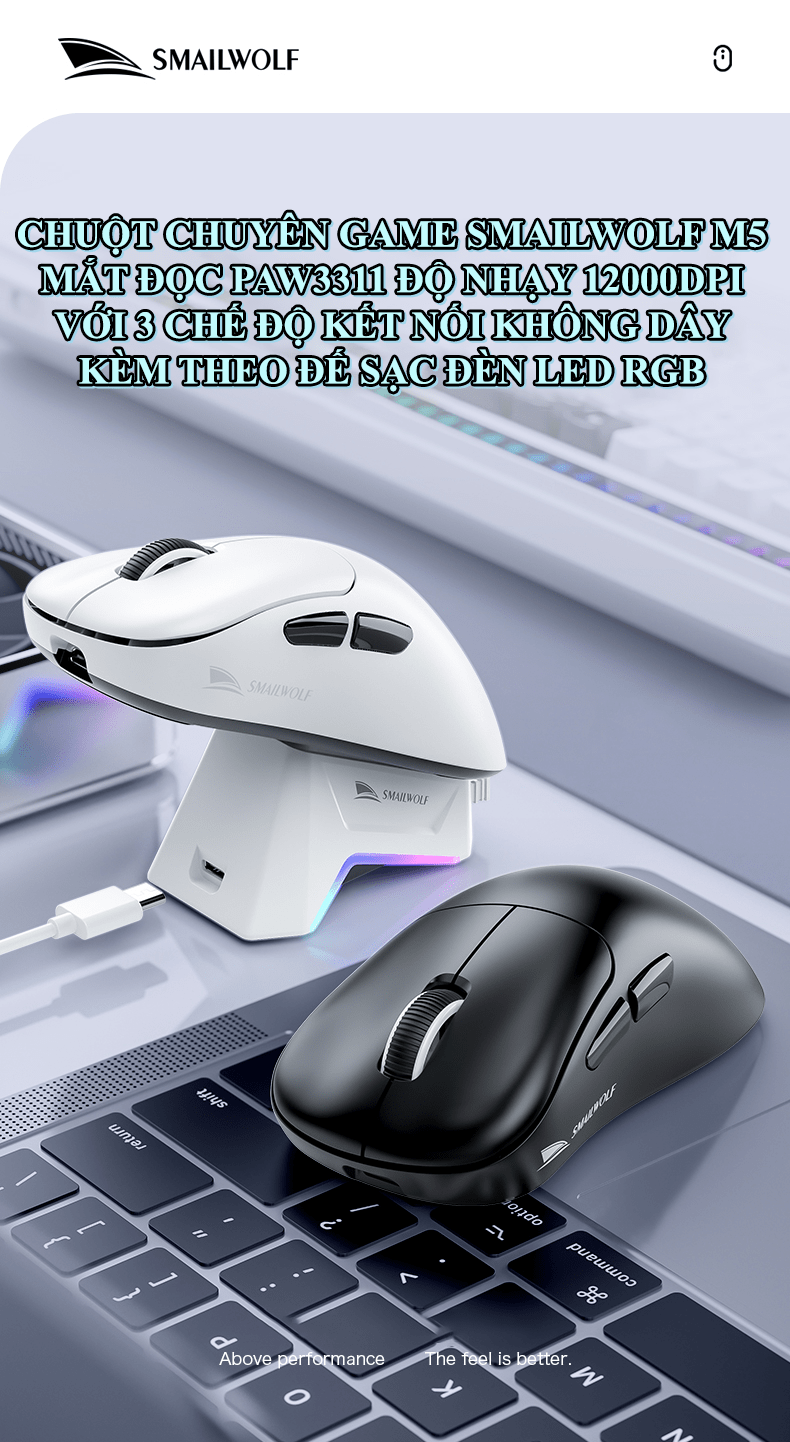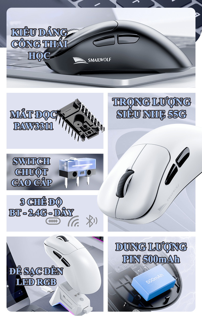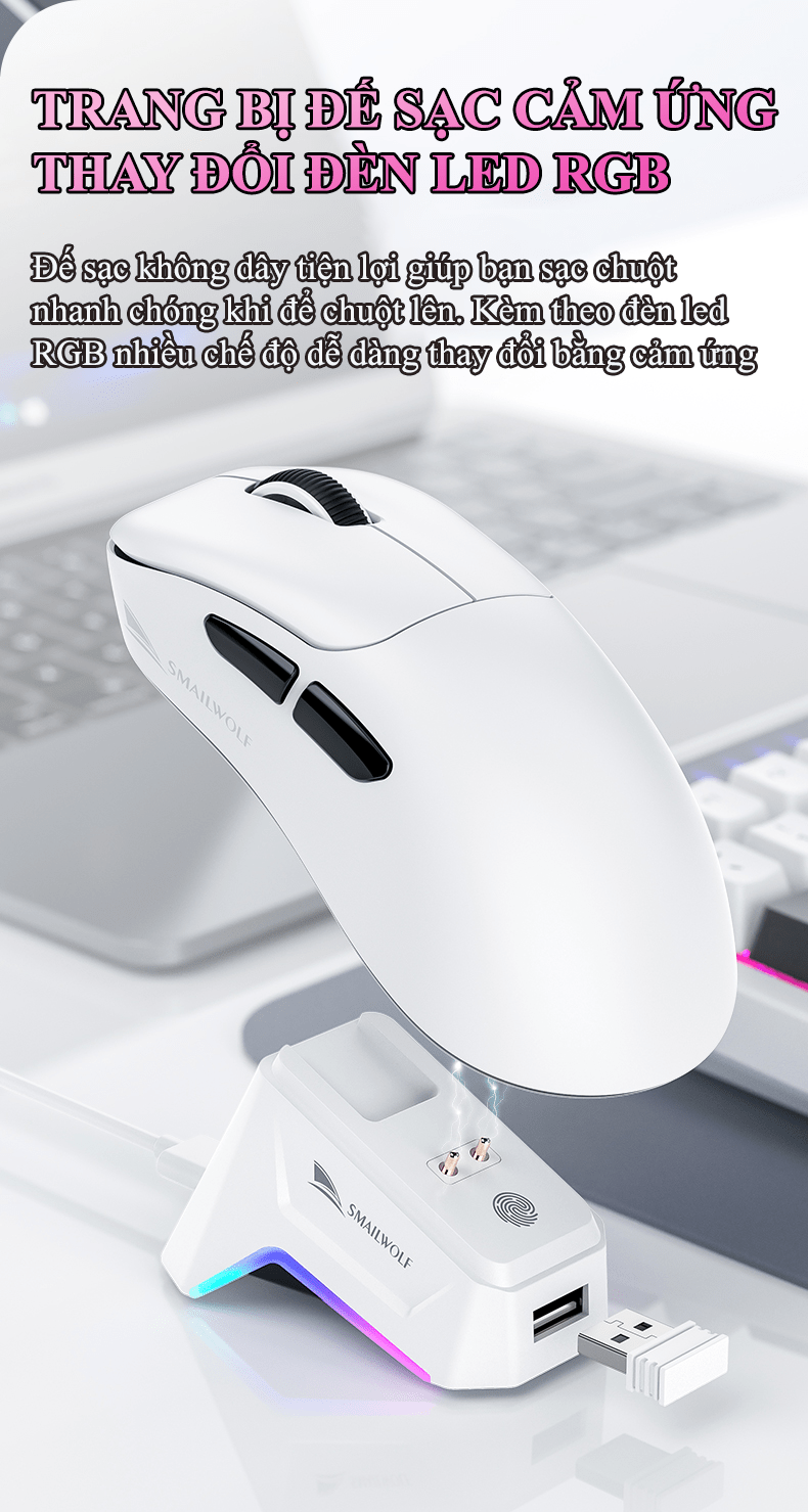 Chuột không dây chuyên game SMAILWOLF M5 kết nối 3 chế độ BLUETOOTH - USB 2.4G - TYPE-C kèm theo đế sạc cảm ứng đèn led RGB cực đẹp với độ nhạy 12000DPI