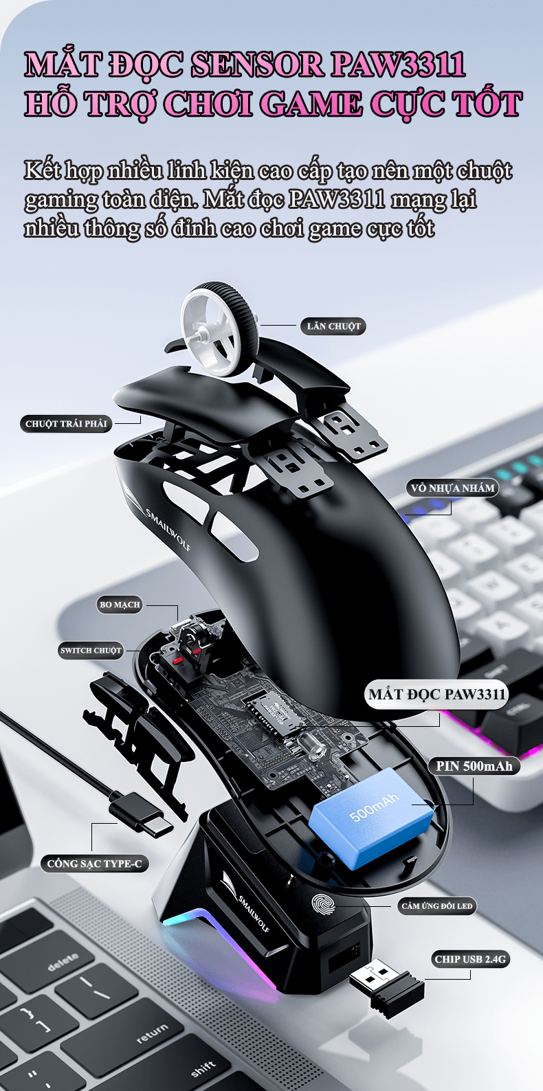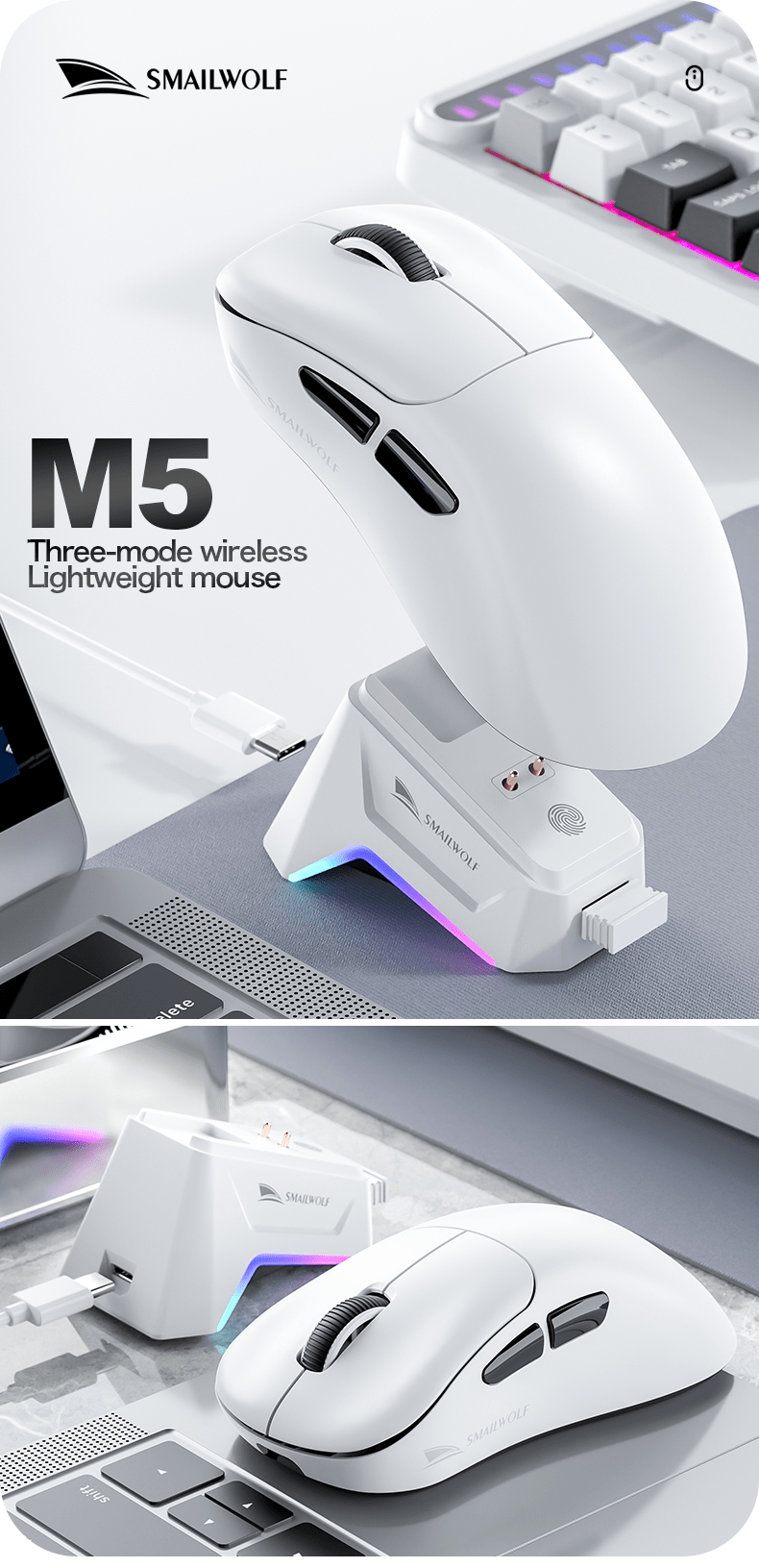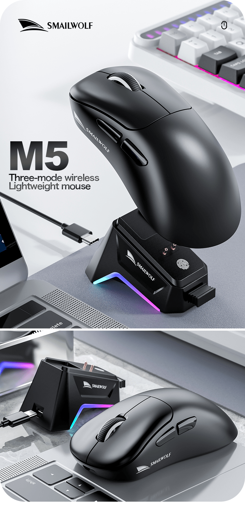 Chuột không dây chuyên game SMAILWOLF M5 kết nối 3 chế độ BLUETOOTH - USB 2.4G - TYPE-C kèm theo đế sạc cảm ứng đèn led RGB cực đẹp với độ nhạy 12000DPI