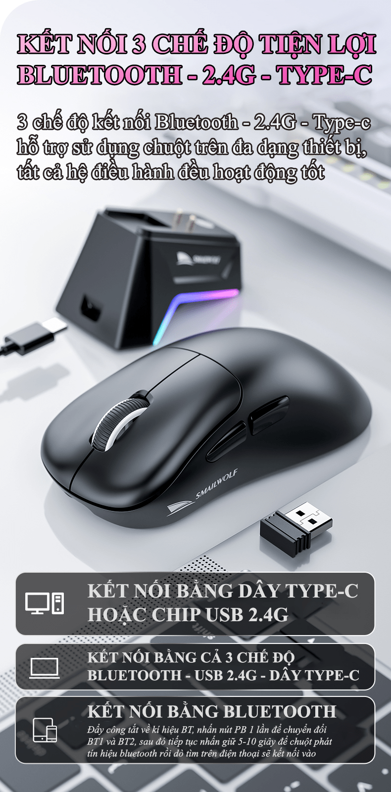 + 2.4GHz Wireless: Kết nối không dây qua cổng USB, cho độ trễ thấp, ổn định, là chế độ lý tưởng nhất để chơi game.
