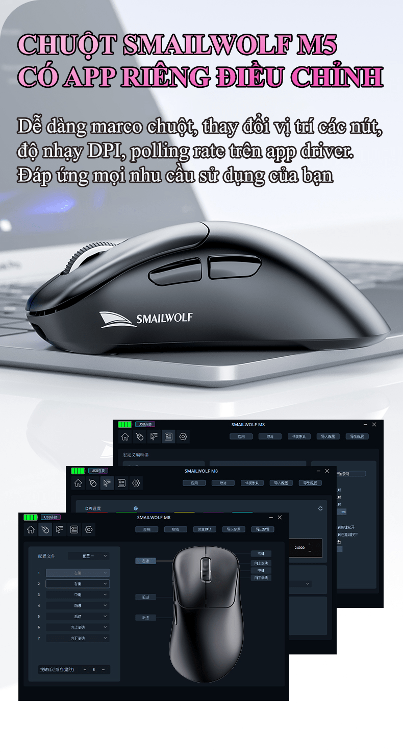 + Phần mềm: Có thể đi kèm phần mềm riêng để tùy chỉnh DPI, macro, tốc độ polling rate và hiệu ứng đèn LED.