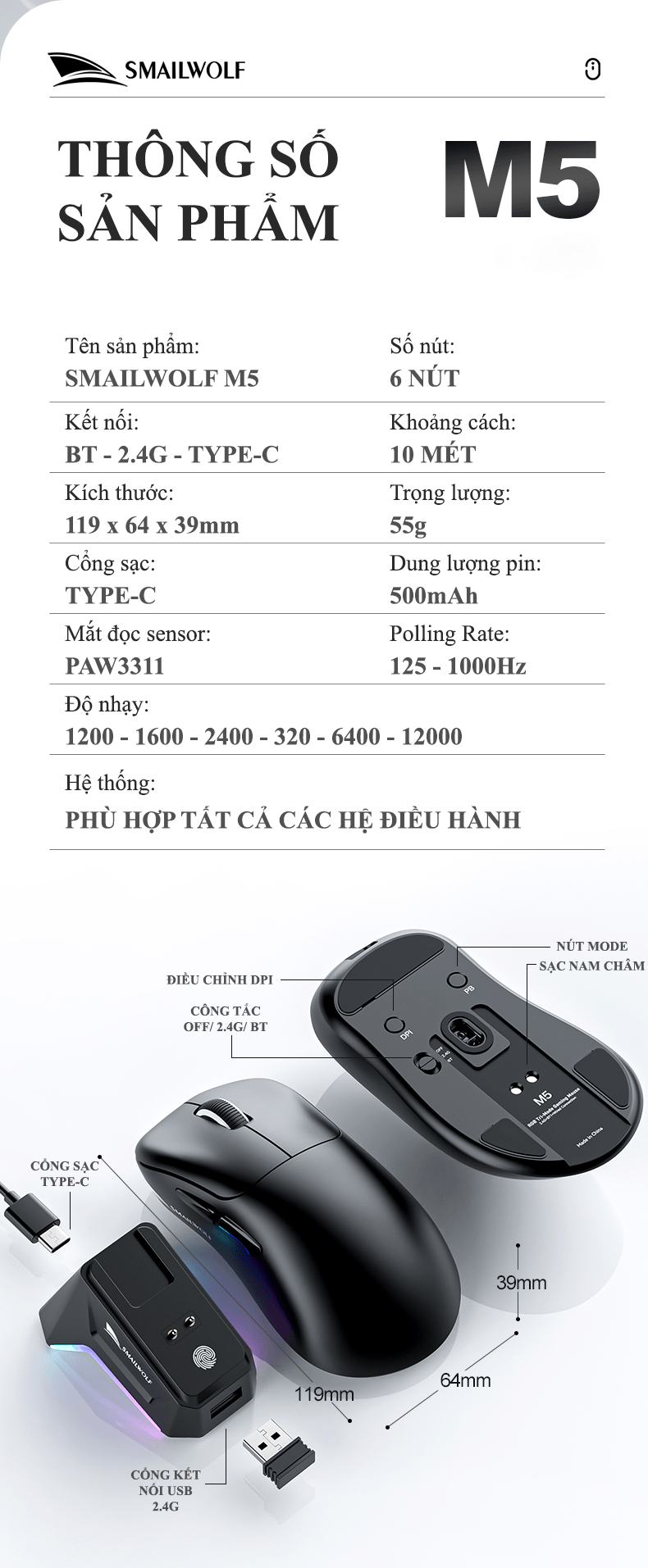 Tổng Quan Chuột Không Dây Smailwolf M5 Dựa trên các thông số, đây là một chiếc chuột chơi game với những ưu điểm nổi bật sau: