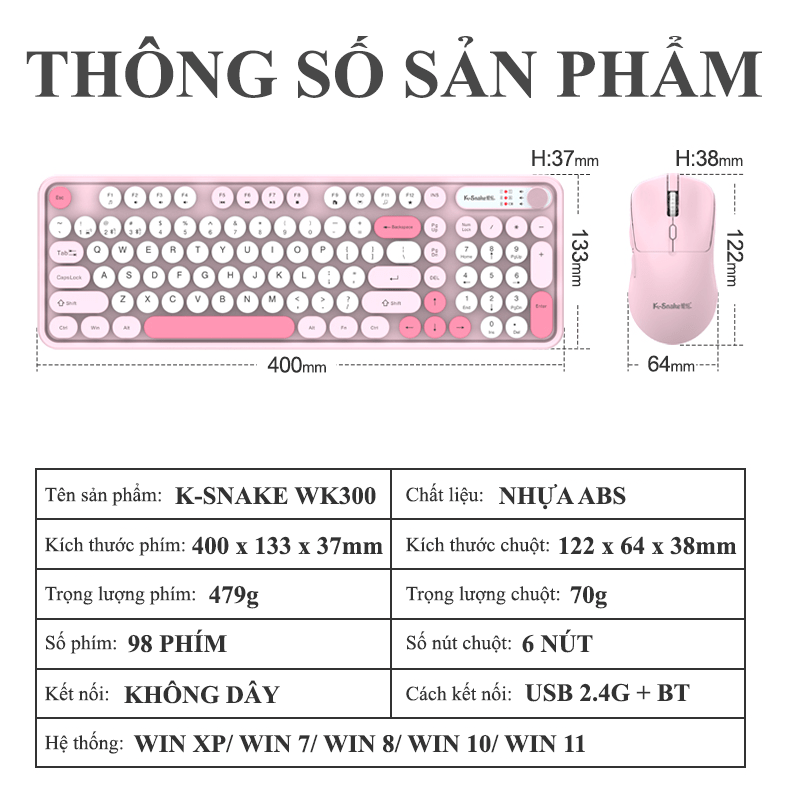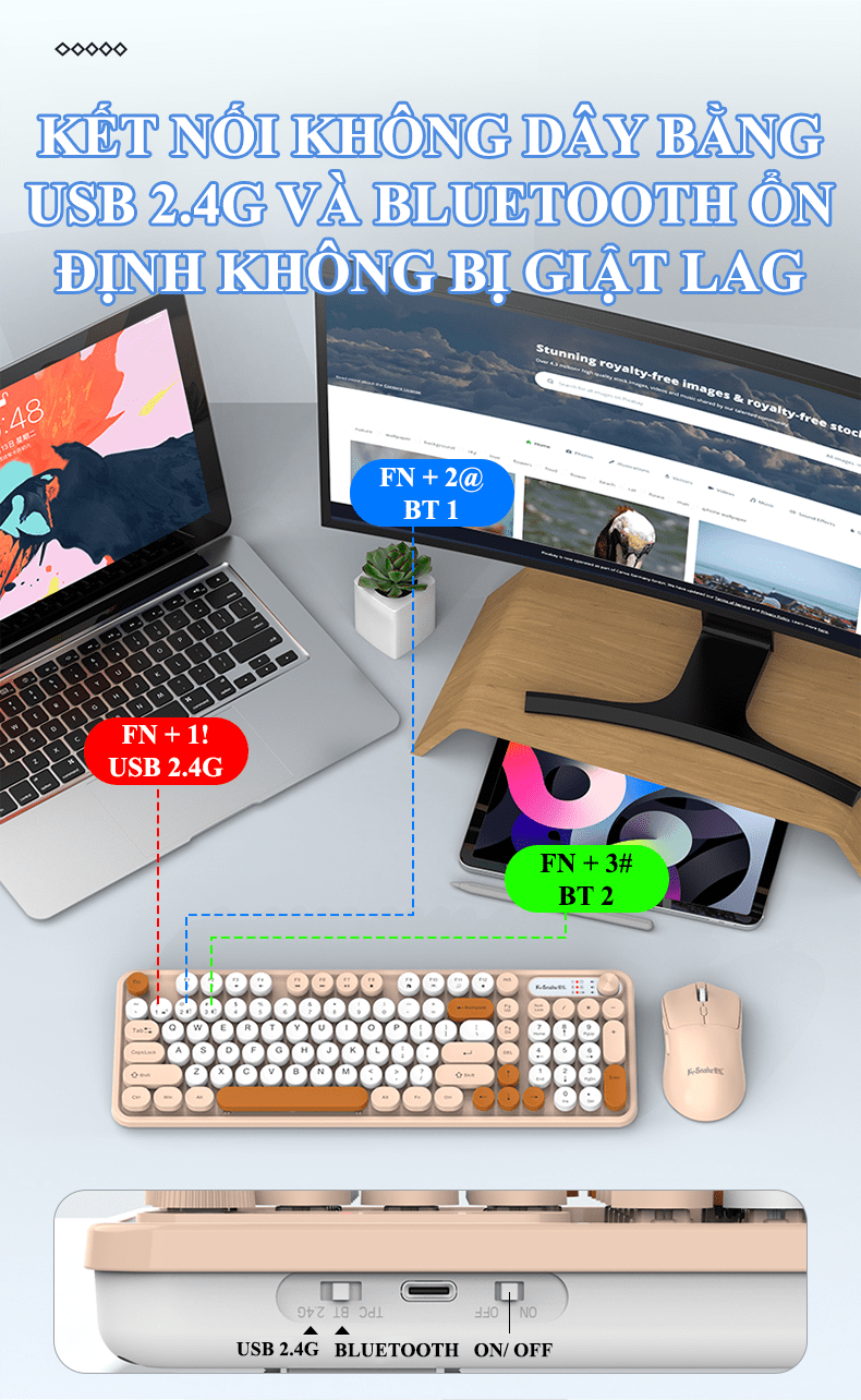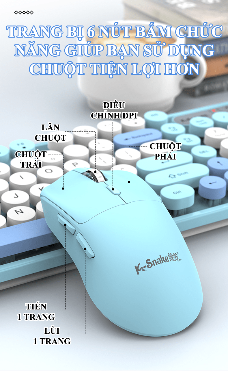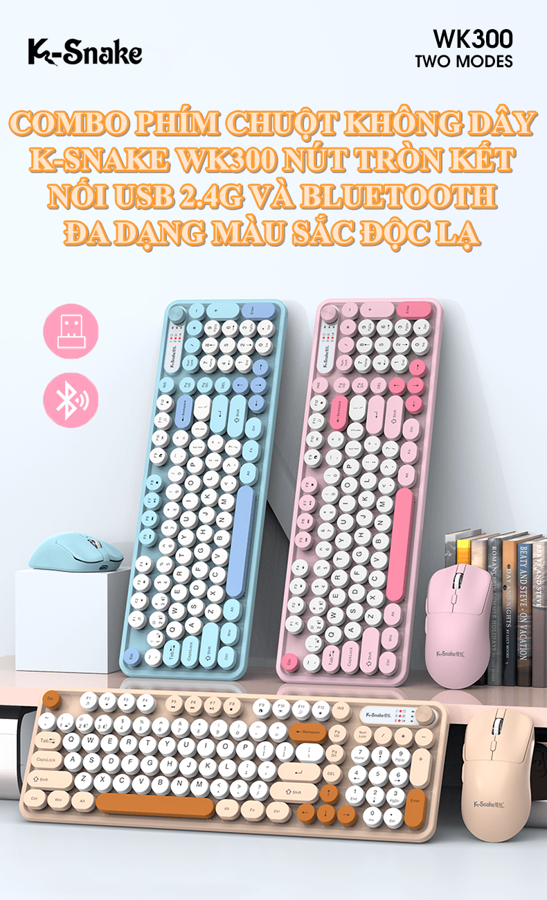 Combo bàn phím và chuột không dây K-SNAKE WK300 thiết kế nút tròn kết nối USB 2.4G và Bluetooth với nhiều màu sắc phối màu hiện đại thời trang