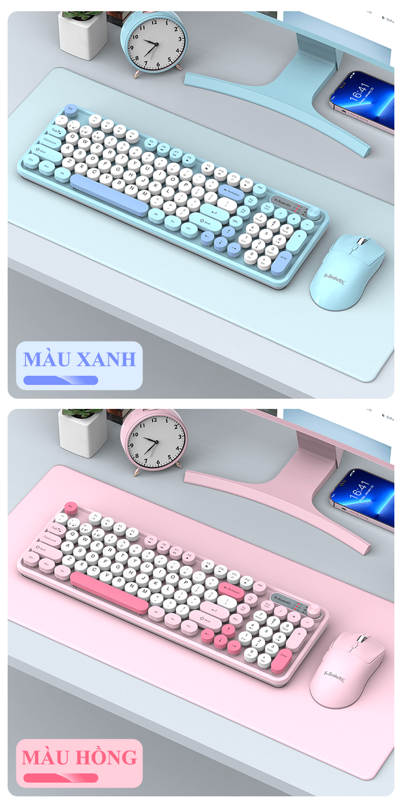 - Thiết kế thời trang hiện đại, nhiều màu sắc: Thường có các phiên bản phối màu pastel nhẹ nhàng (như hồng, xanh mint, trắng, tím) hoặc các màu sắc tươi sáng, rất phù hợp với xu hướng setup bàn làm việc đẹp (desktop setup).
