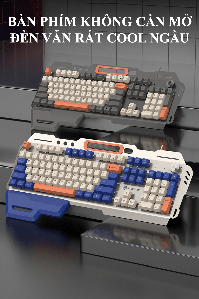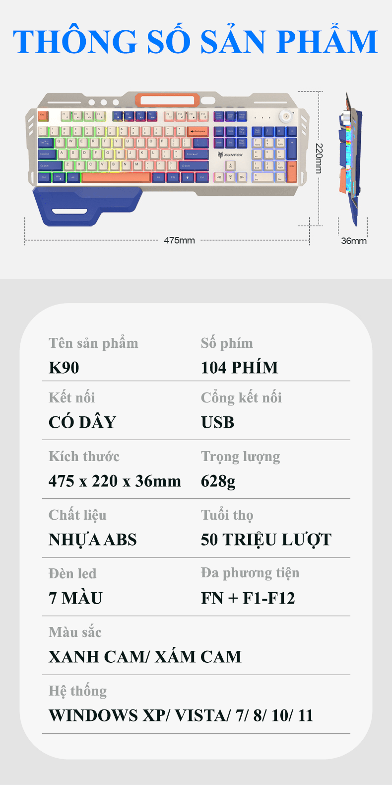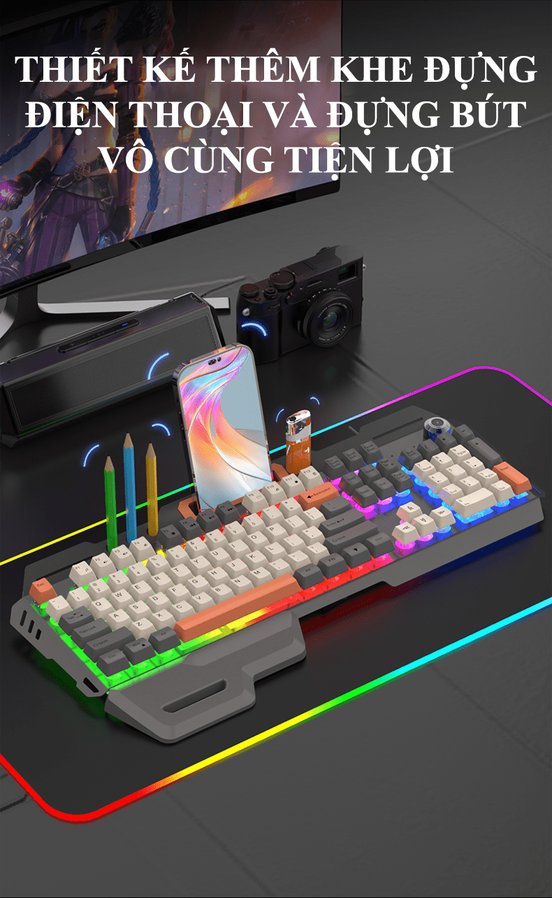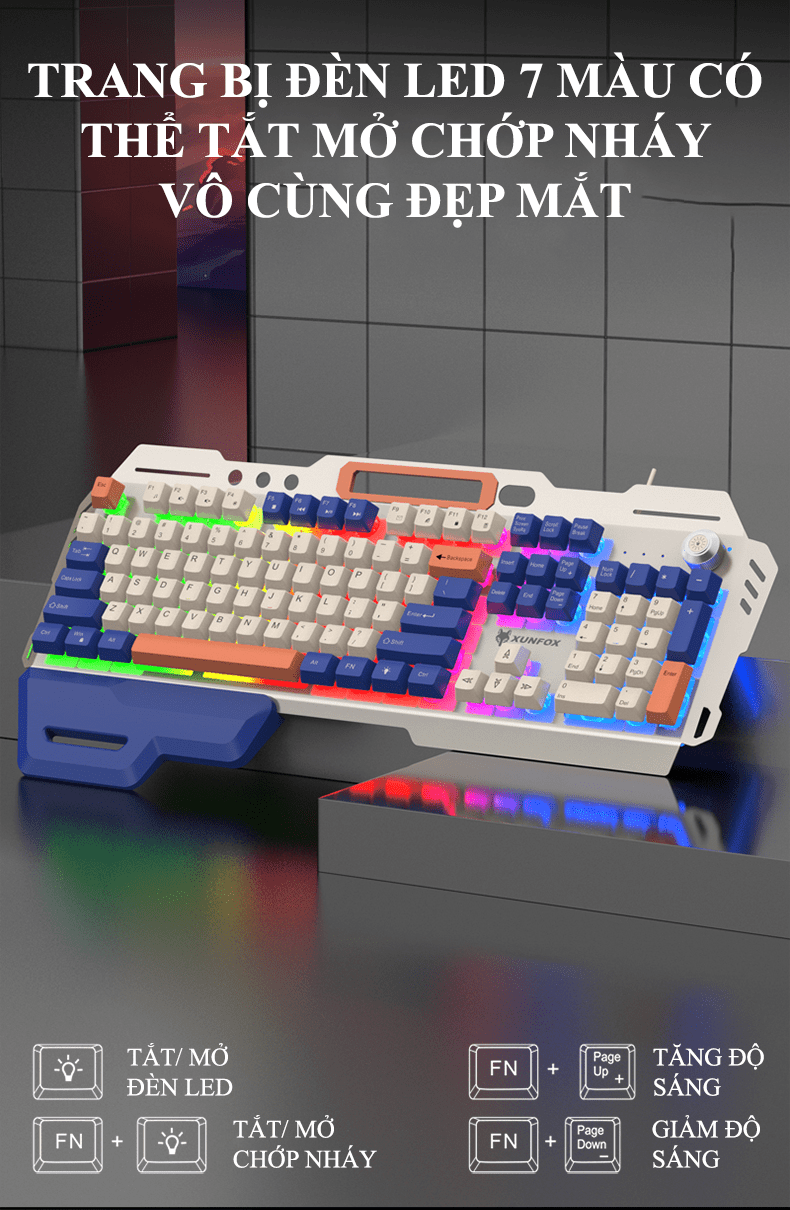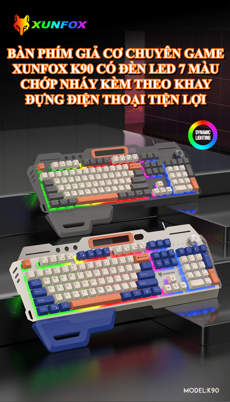 Bàn phím giả cơ chuyên game XUNFOX K90 có đèn led 7 màu chớp nháy cực đẹp kèm theo khay đựng điện thoại tiện lợi