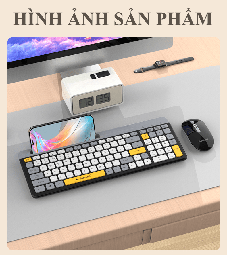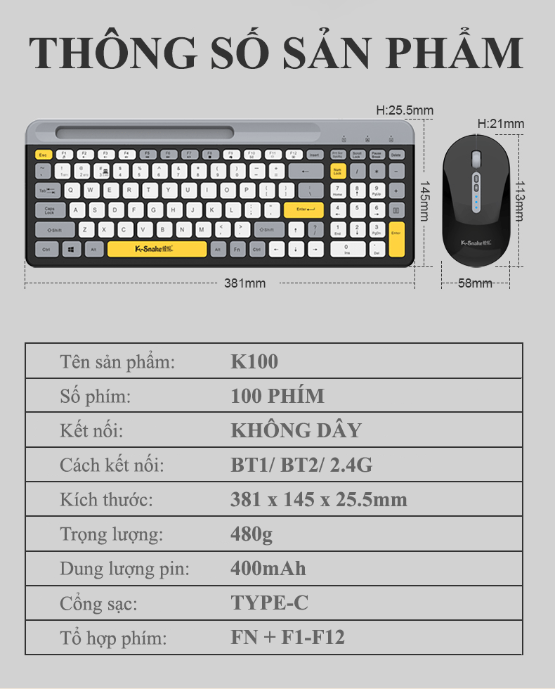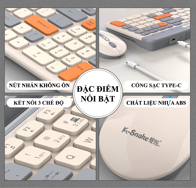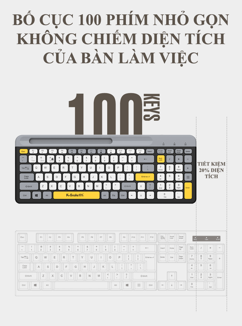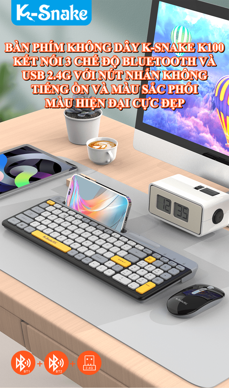 Bàn phím không dây K-SNAKE K100 kết nối không dây 3 chế độ Bluetooth và USB 2.4G thiết kế 100 phím phối màu hiện đại với nút nhấn không tiếng ồn