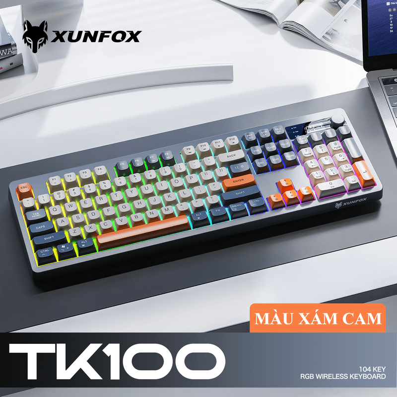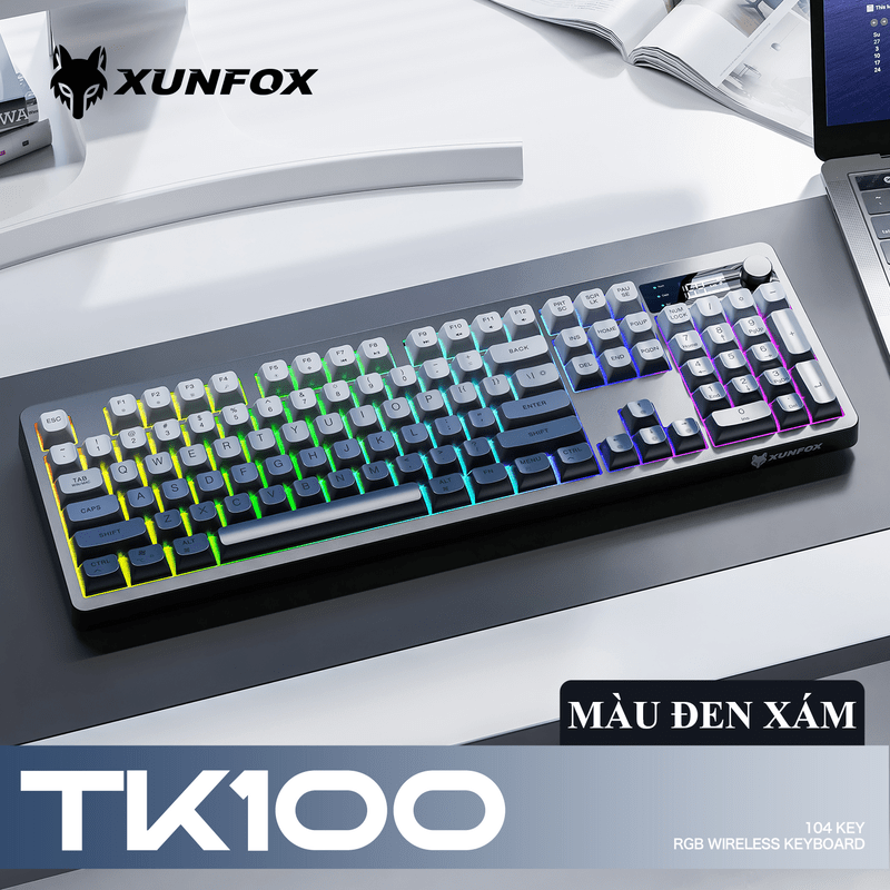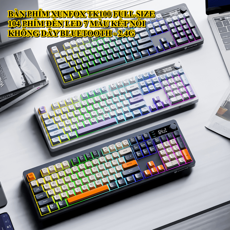 Bàn phím không dây XUNFOX TK100 thiết kế fullsize 104 phím giả cơ đèn led 7 màu kết nối BLUETOOTH và USB 2.4G