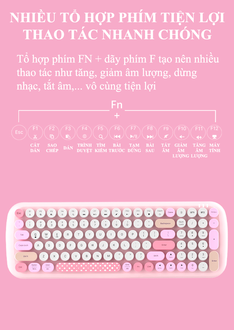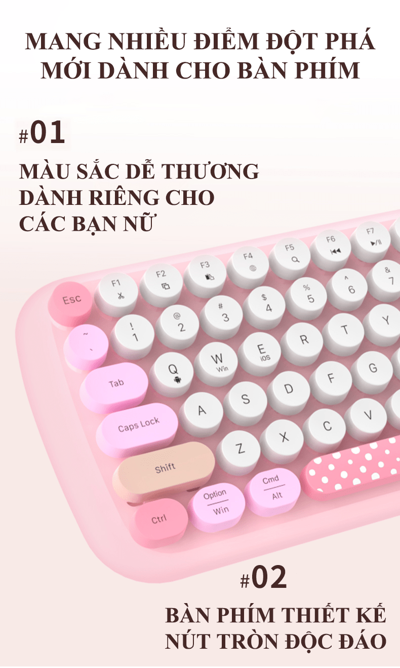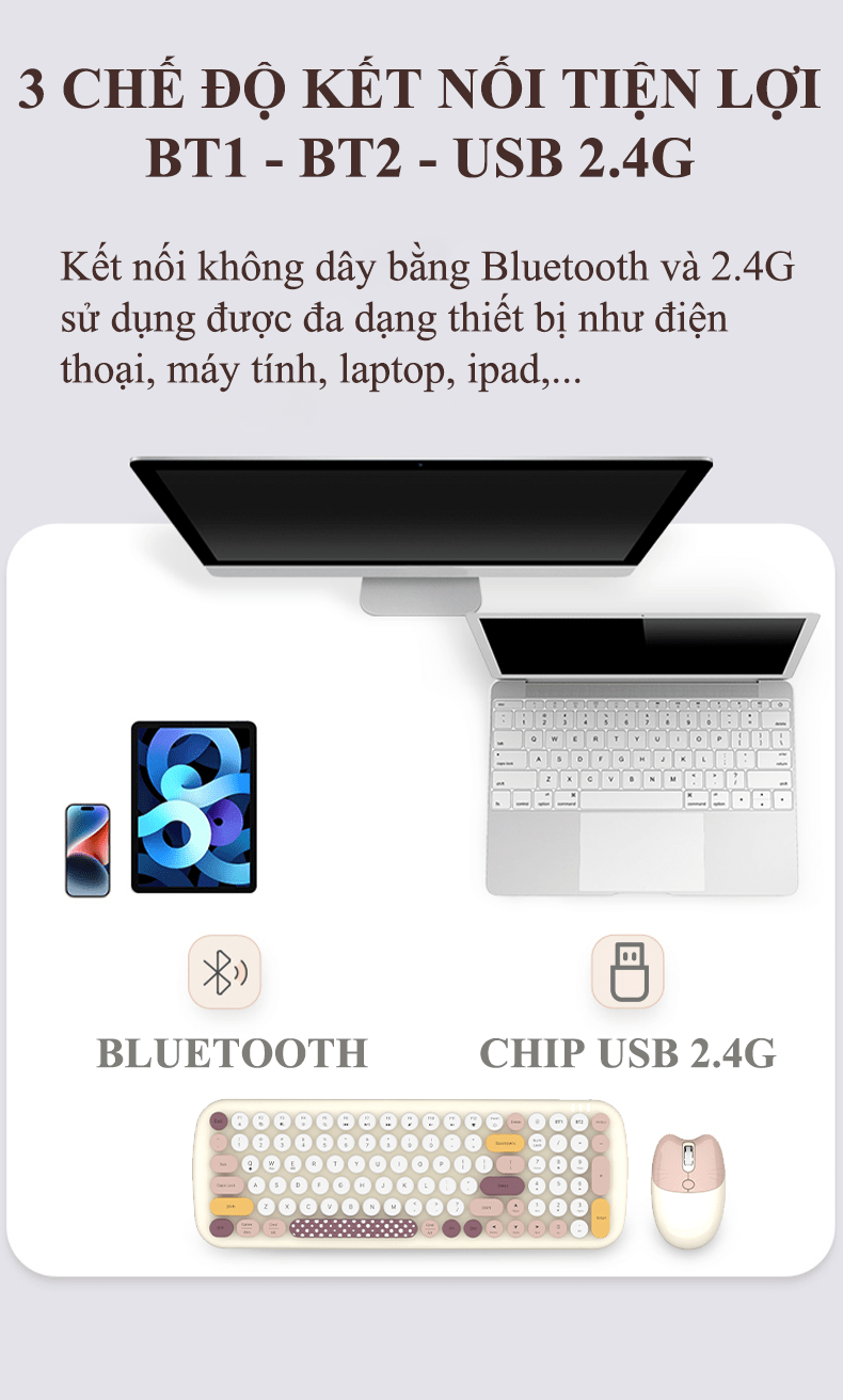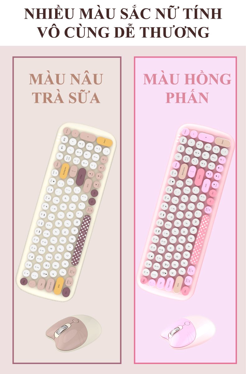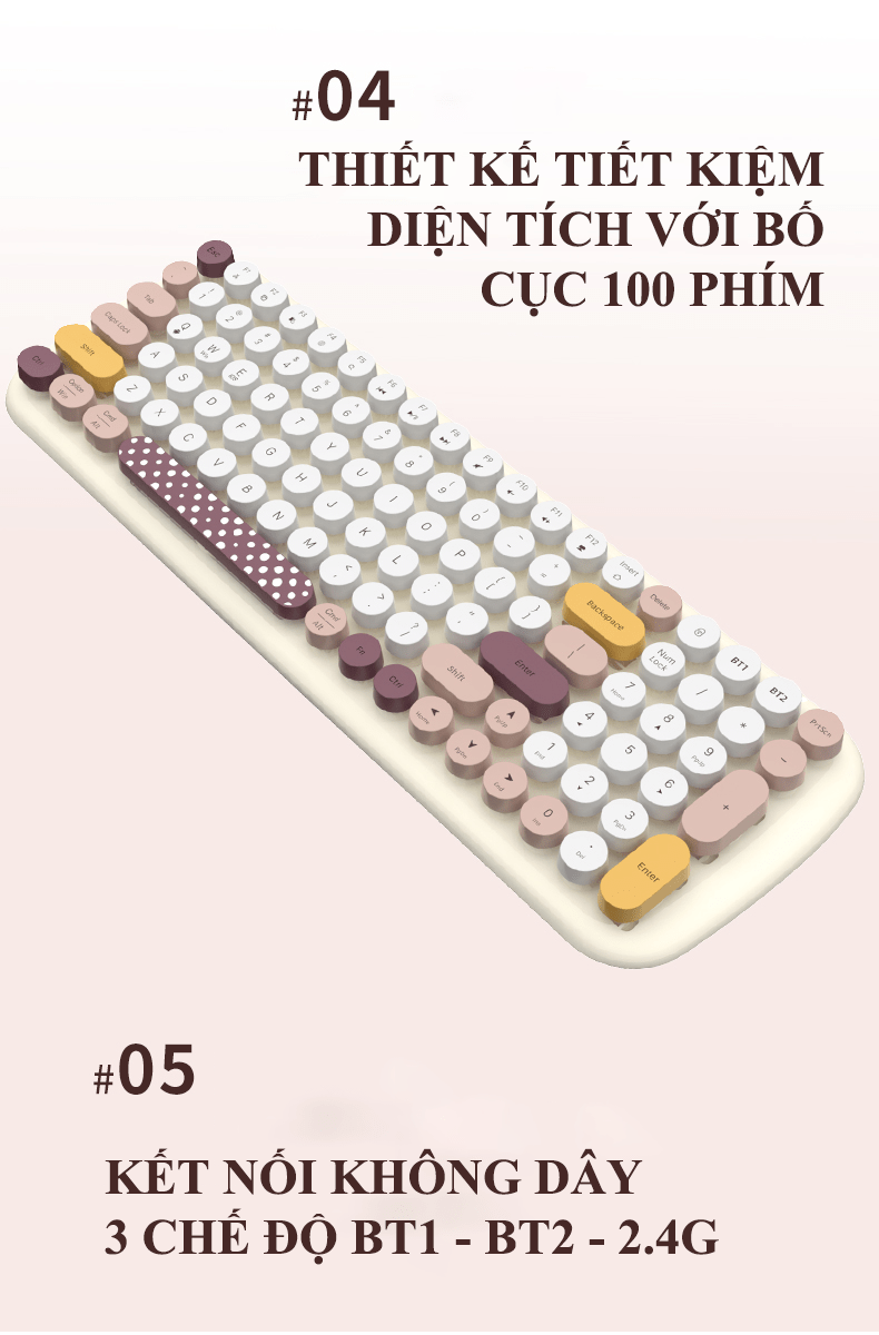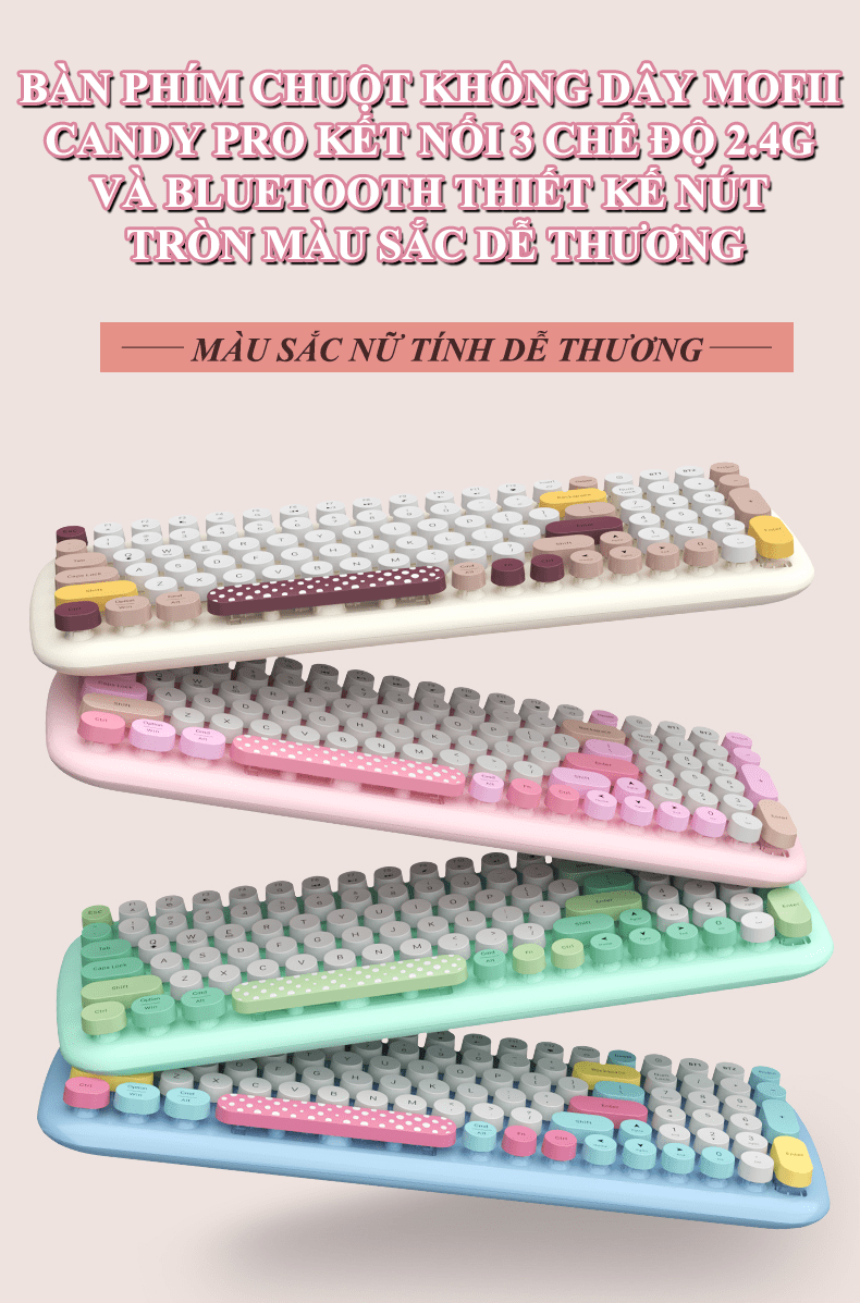 Bàn phím và chuột không dây CANDY PRO kết nối Bluetooth và USB 2.4G thiết kế 100 phím nút tròn màu sắc nữ tính dễ thương
