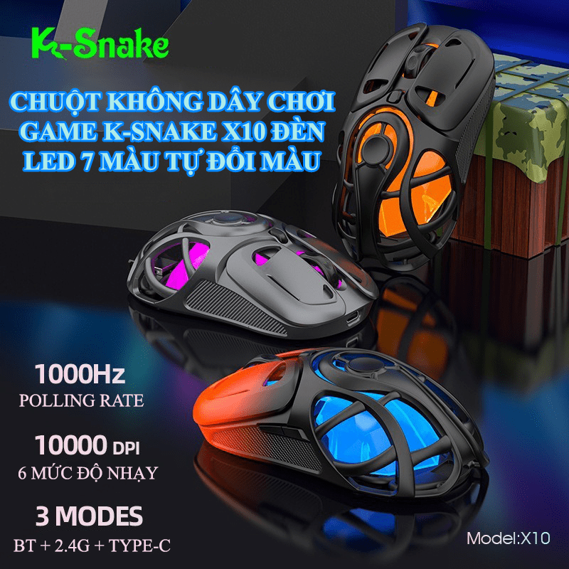 Chuột chuyên game K-SNAKE X10 kết nối 3 chế độ BT - 2.4G - TYPE-C độ nhạy lên đến 10000DPI có đèn led 7 màu cực đẹp kèm theo dung lượng pin lớn 400mAh