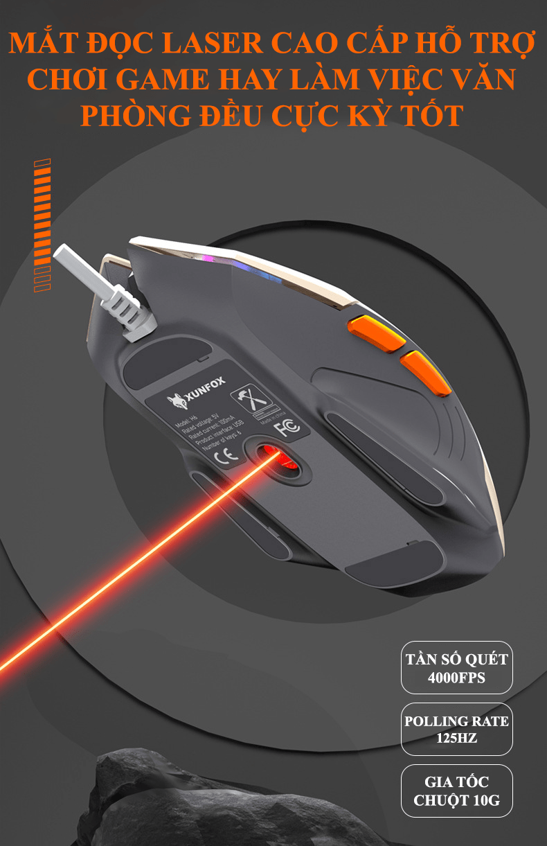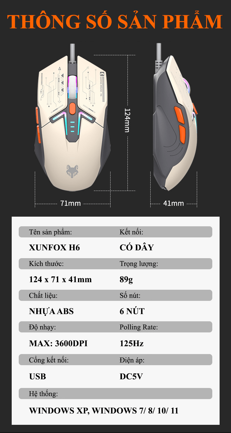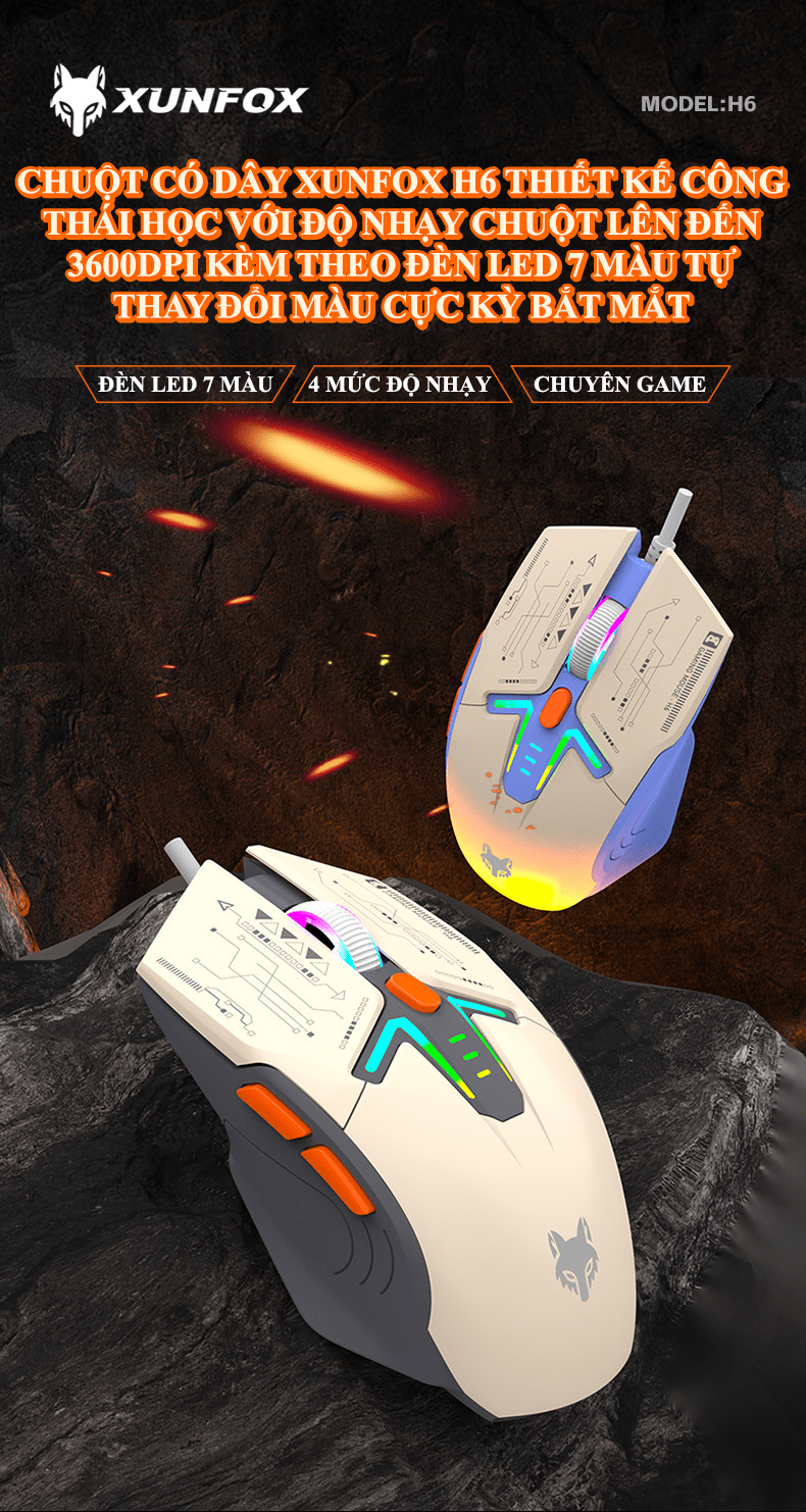 Chuột có dây chơi game XUNFOX H6 trang bị đèn led 7 màu tự thay đổi màu cực đẹp với độ nhạy lên đến 3600DPI