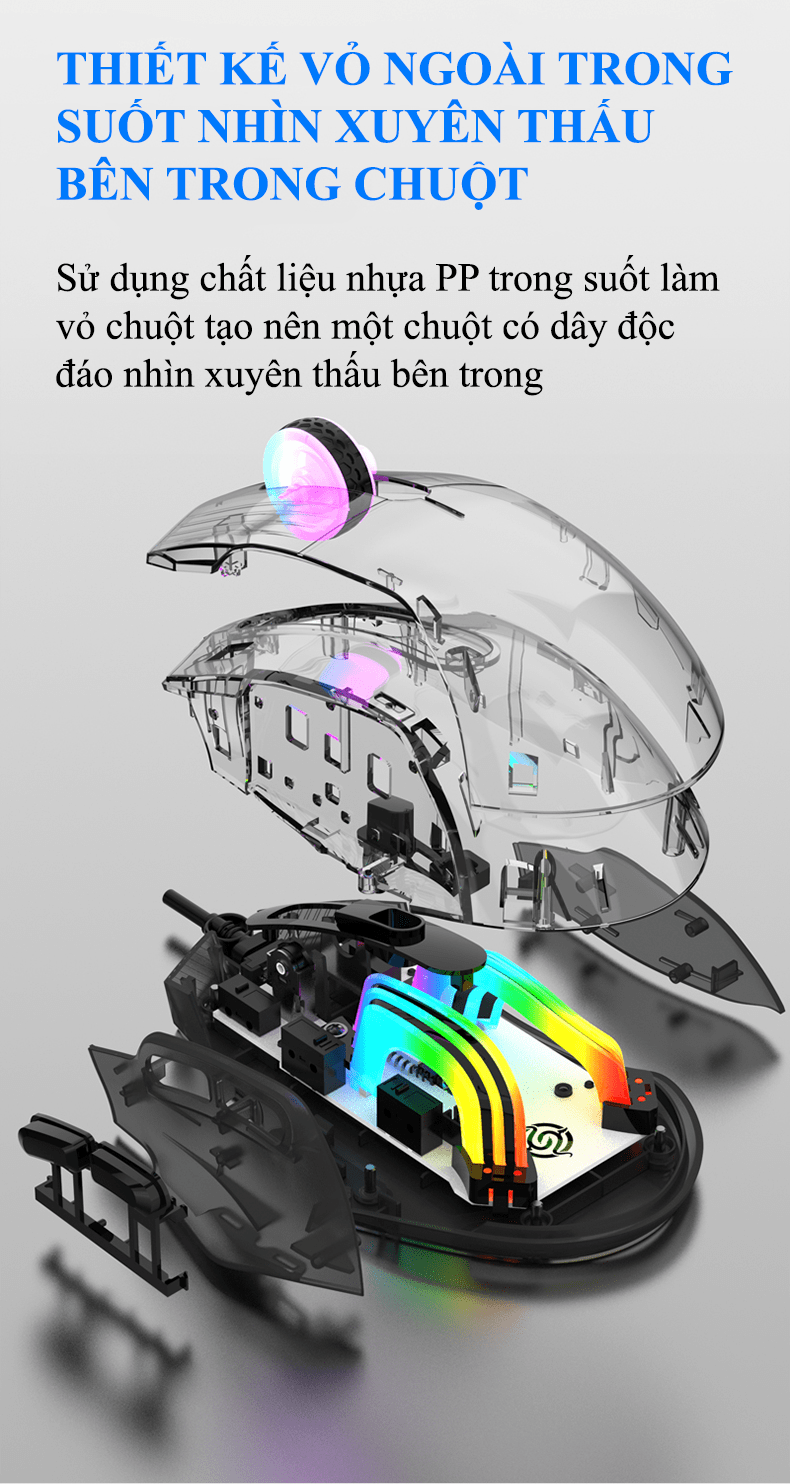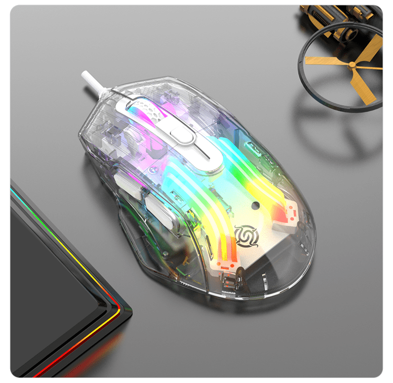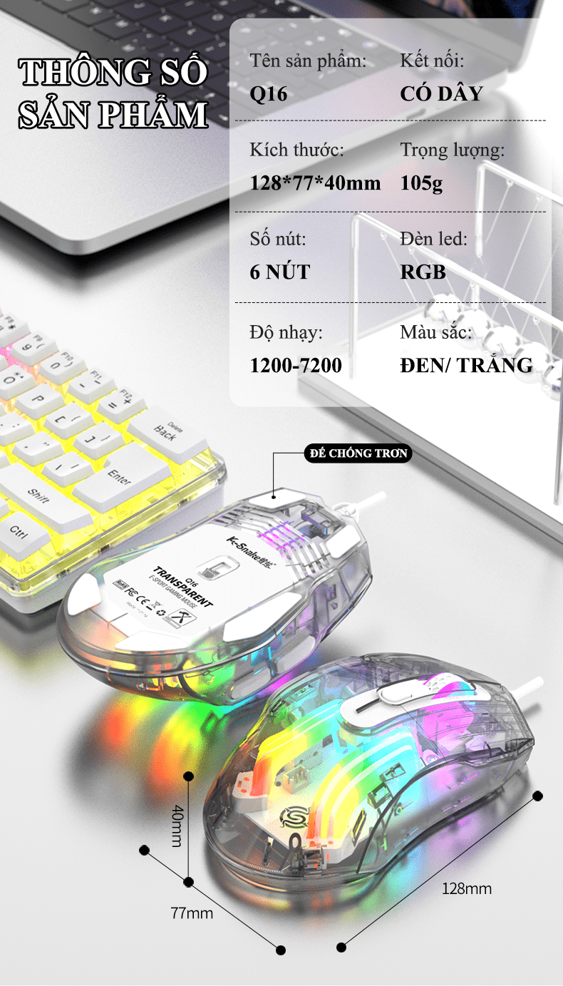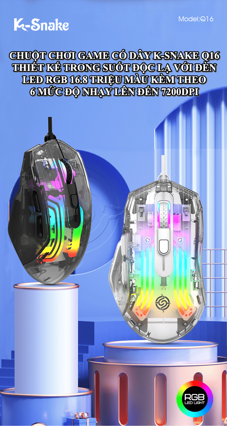 Chuột có dây chuyên game K-SNAKE Q16 thiết kế trong suốt độc lạ có đèn led RGB 16.8 triệu màu kèm theo 6 mức độ nhạy lên đến 7200DPI