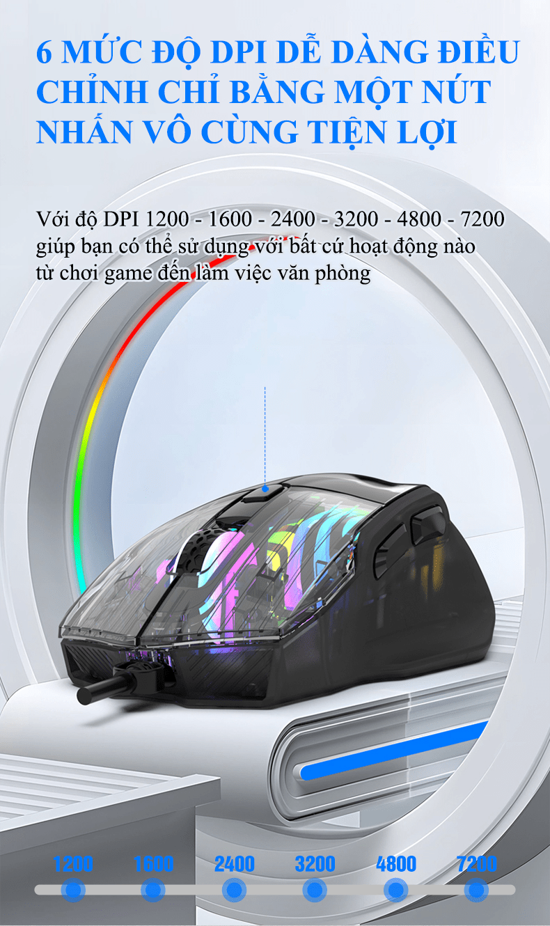 Chuột chơi game lấy độ chính xác cao cảm biến quang học, sở hữu 6 có thể điều chỉnh mức DPI (MAX 7200DPI)