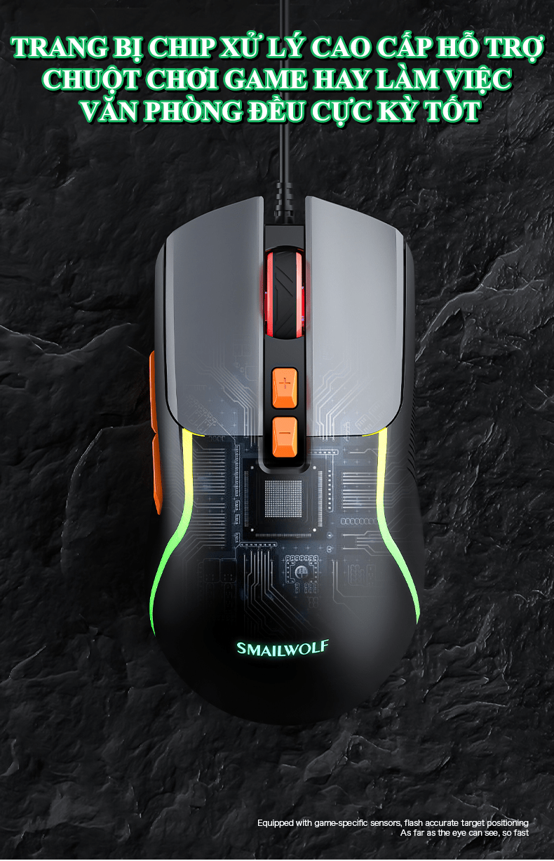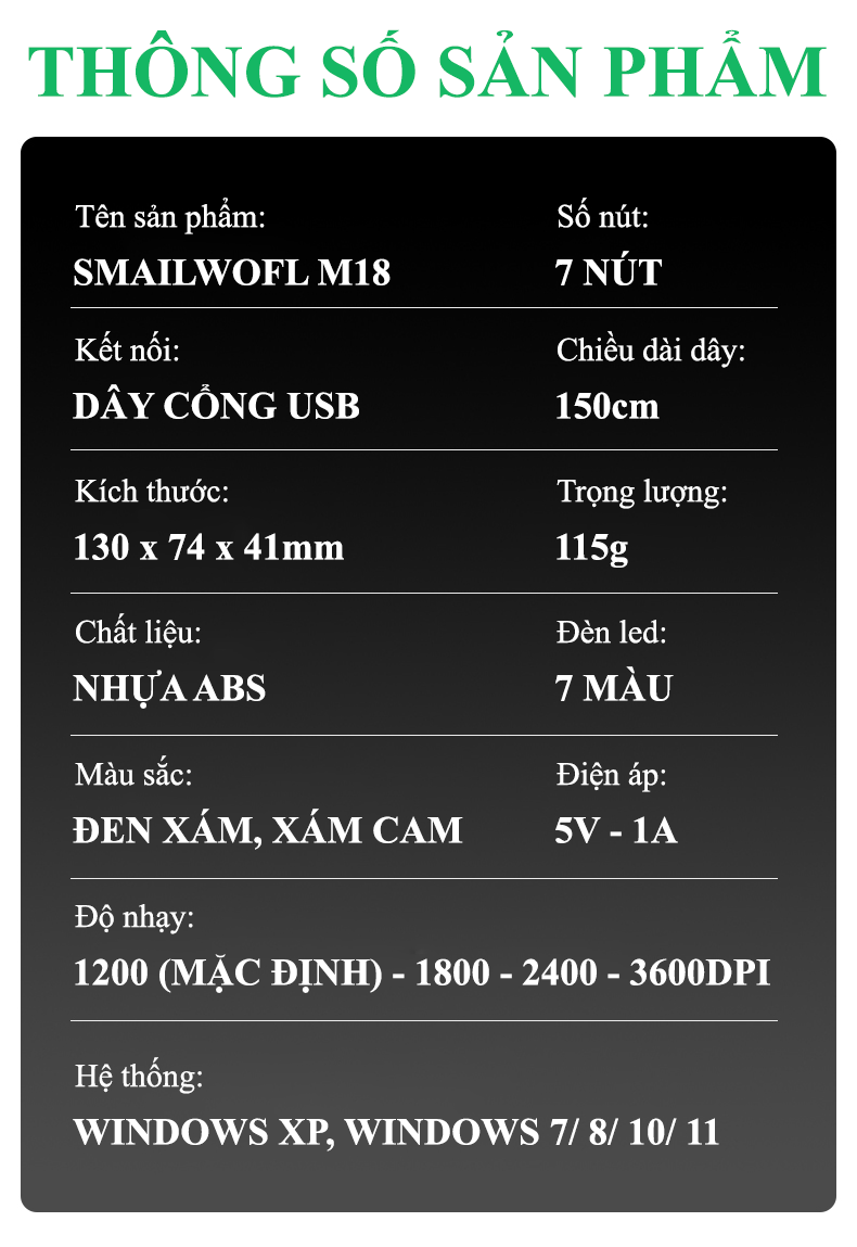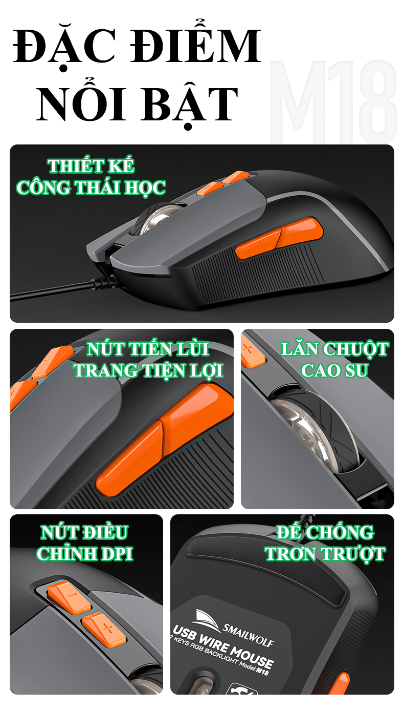 Chuột có dây SMAILWOLF M18 kết nối bằng dây cổng USB với thiết kế công thái học kèm theo độ nhạy lên đến 3600DPI
