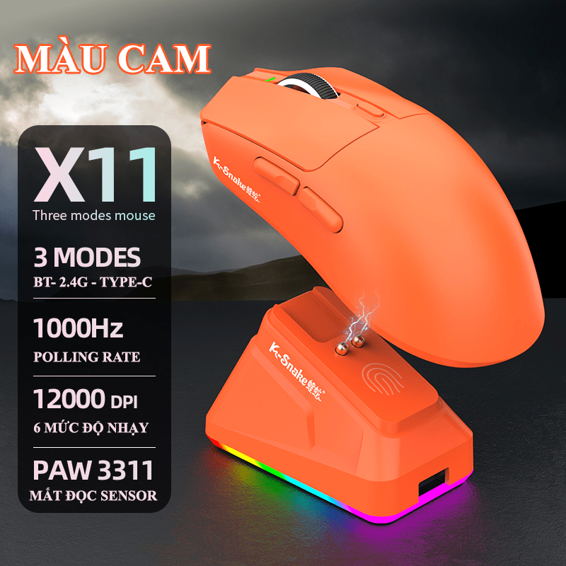 Chuột không dây chuyên game K-SNAKE X11 kết nối 3 chế độ BT - 2.4G - Type-C với mắt đọc sensor PAW3311 độ nhạy lên đến 12000DPI kèm theo đế sạc không dây led RGB