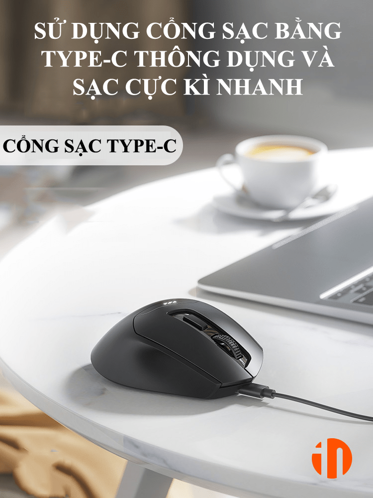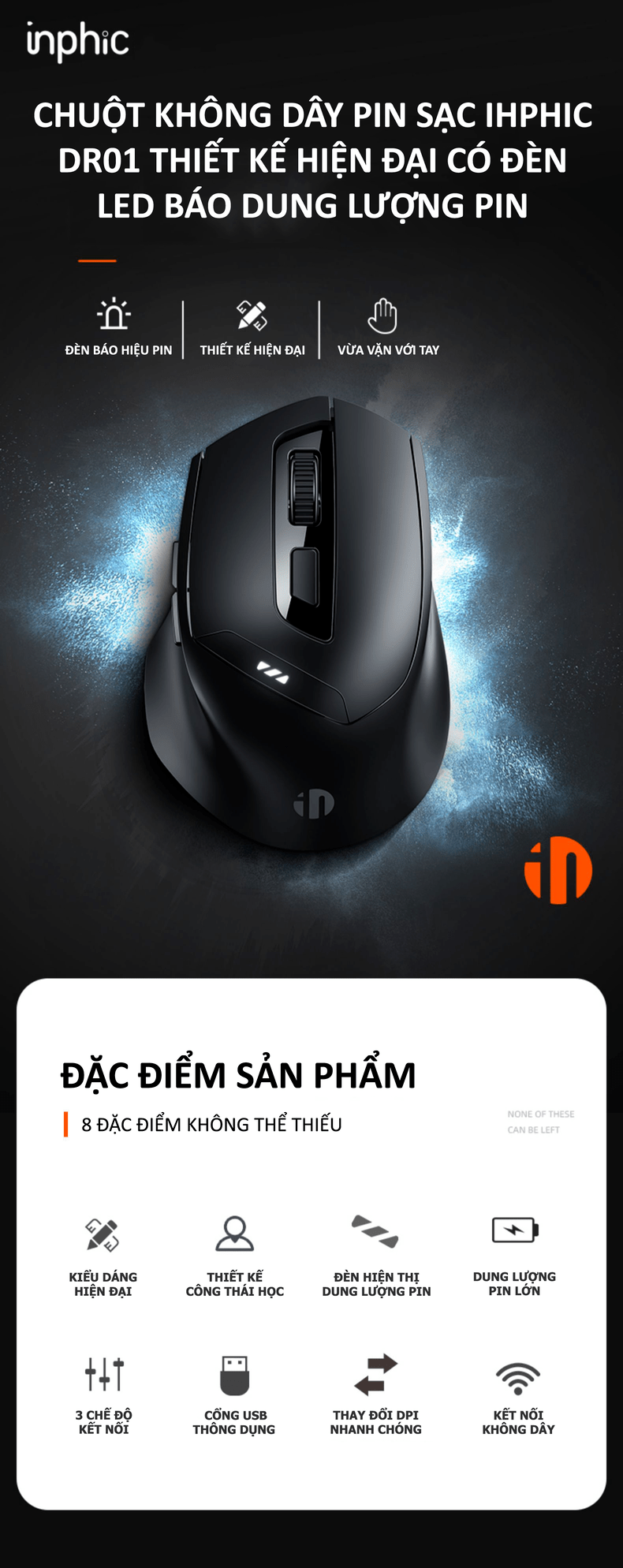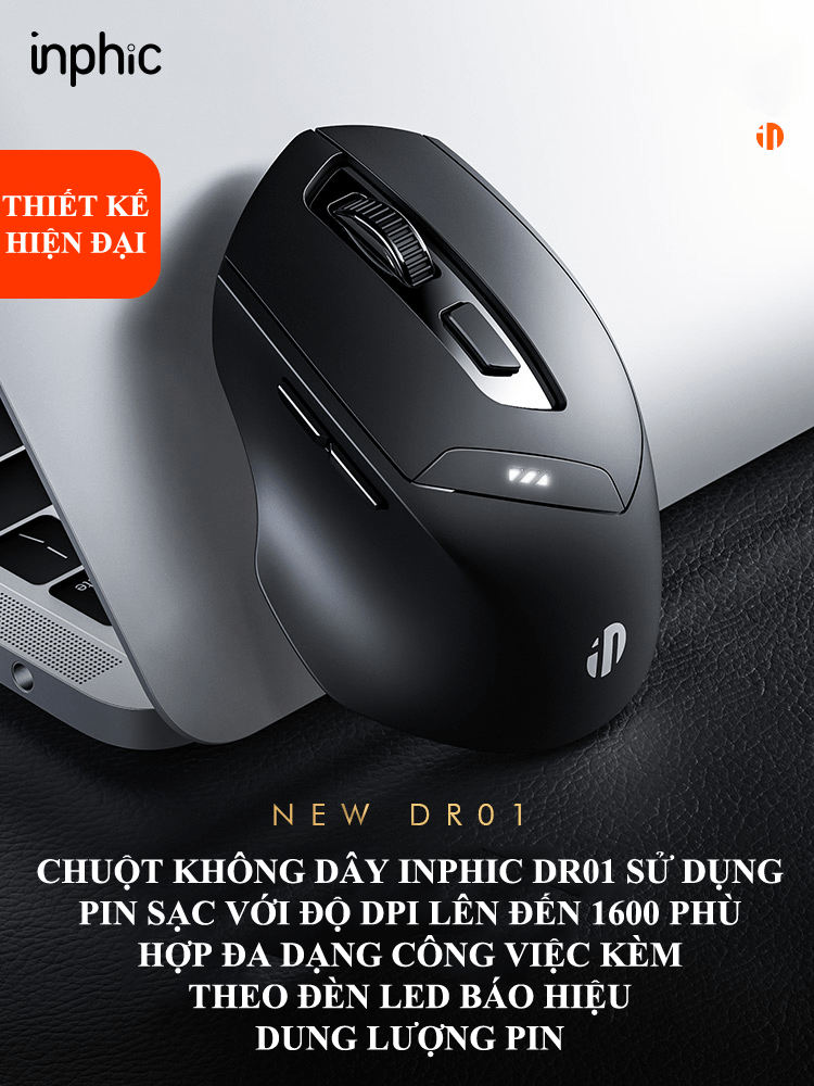 Chuột không dây INPHIC DR01 sử dụng pin sạc thiết kế hiện đại với độ DPI lên đến 1600 có đèn led báo hiệu dung lượng pin