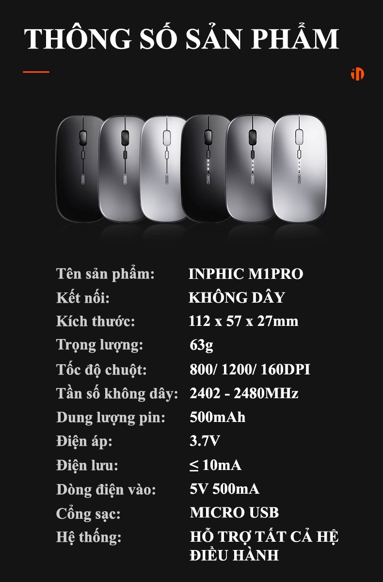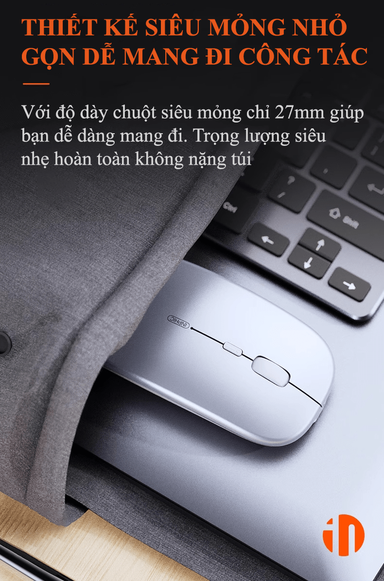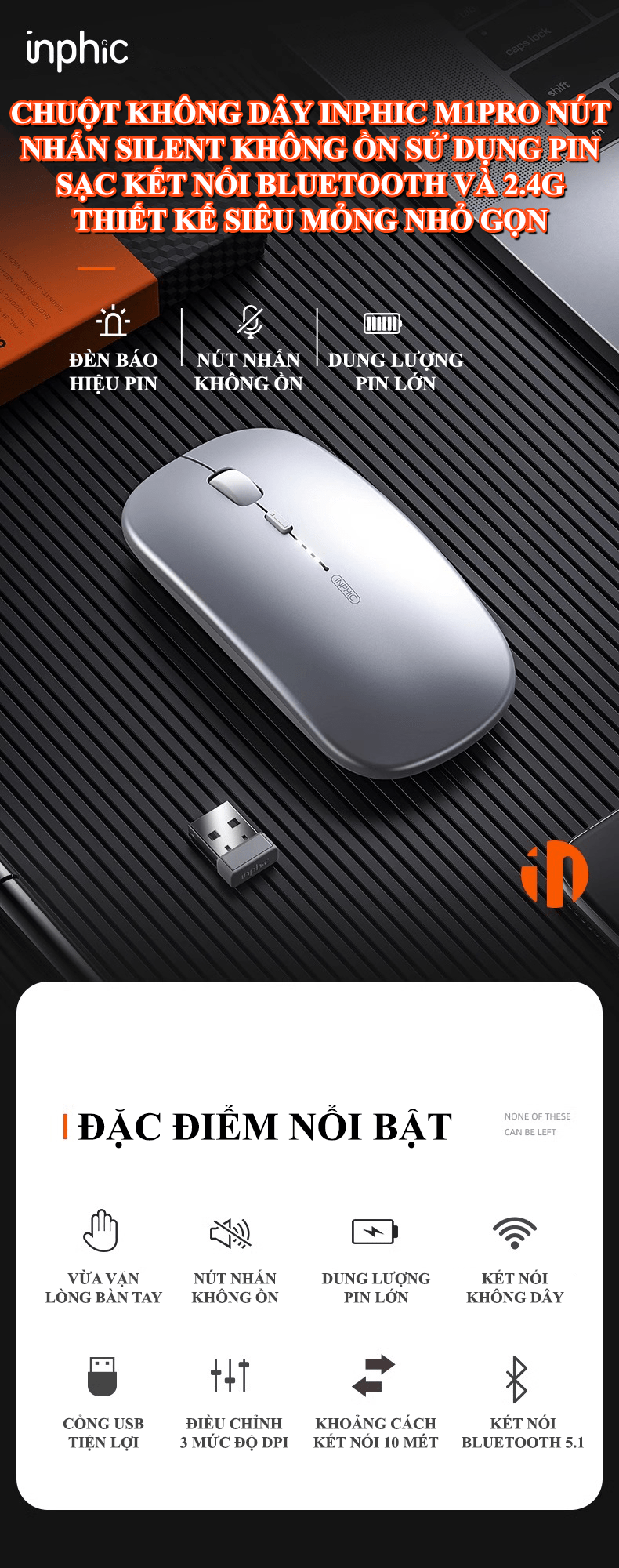Chuột không dây INPHIC M1PRO với nút nhấn silent không ồn kết nối bằng BLUETOOTH và CHIP USB 2.4G thiết kế siêu mỏng