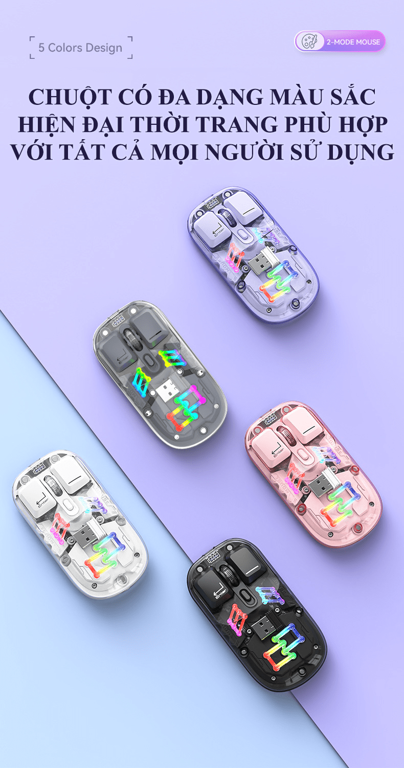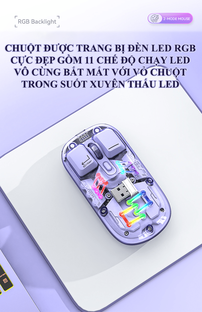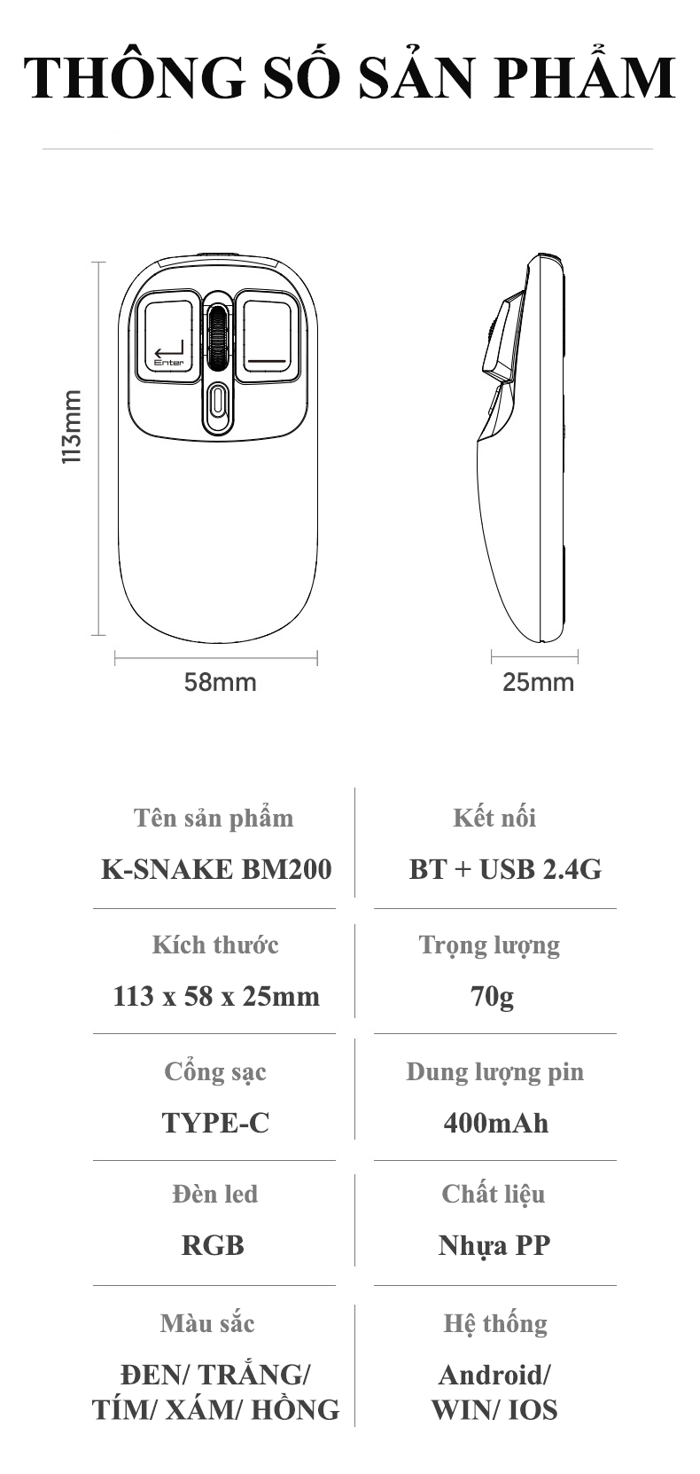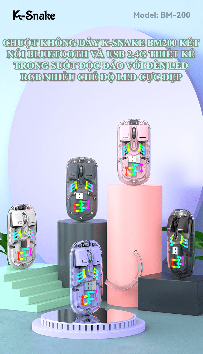 Chuột không dây K-SNAKE BM200 kết nối BLUETOOTH và USB 2.4G thiết kế trong suốt siêu mỏng với đèn led RGB cực đẹp