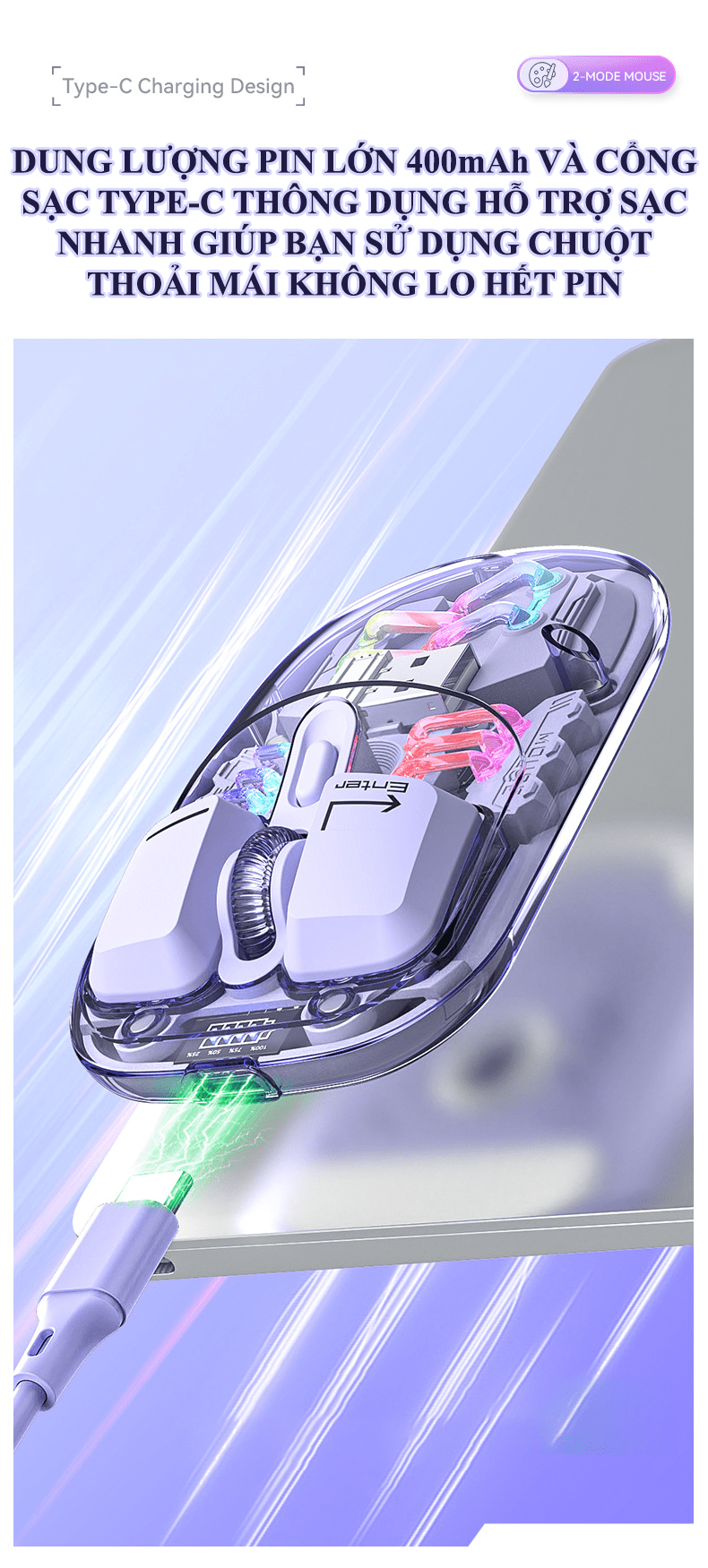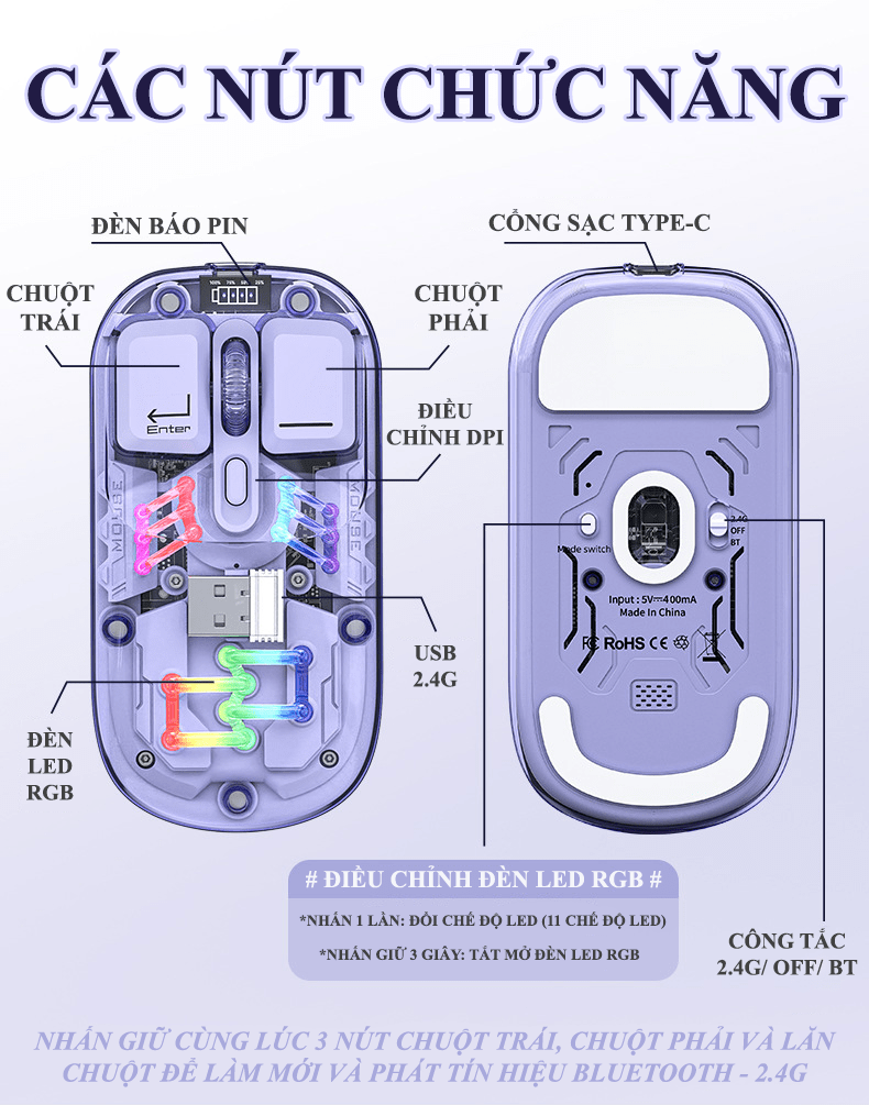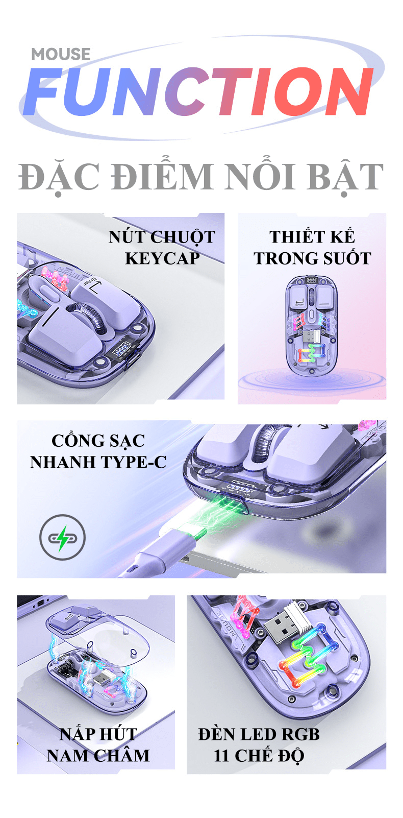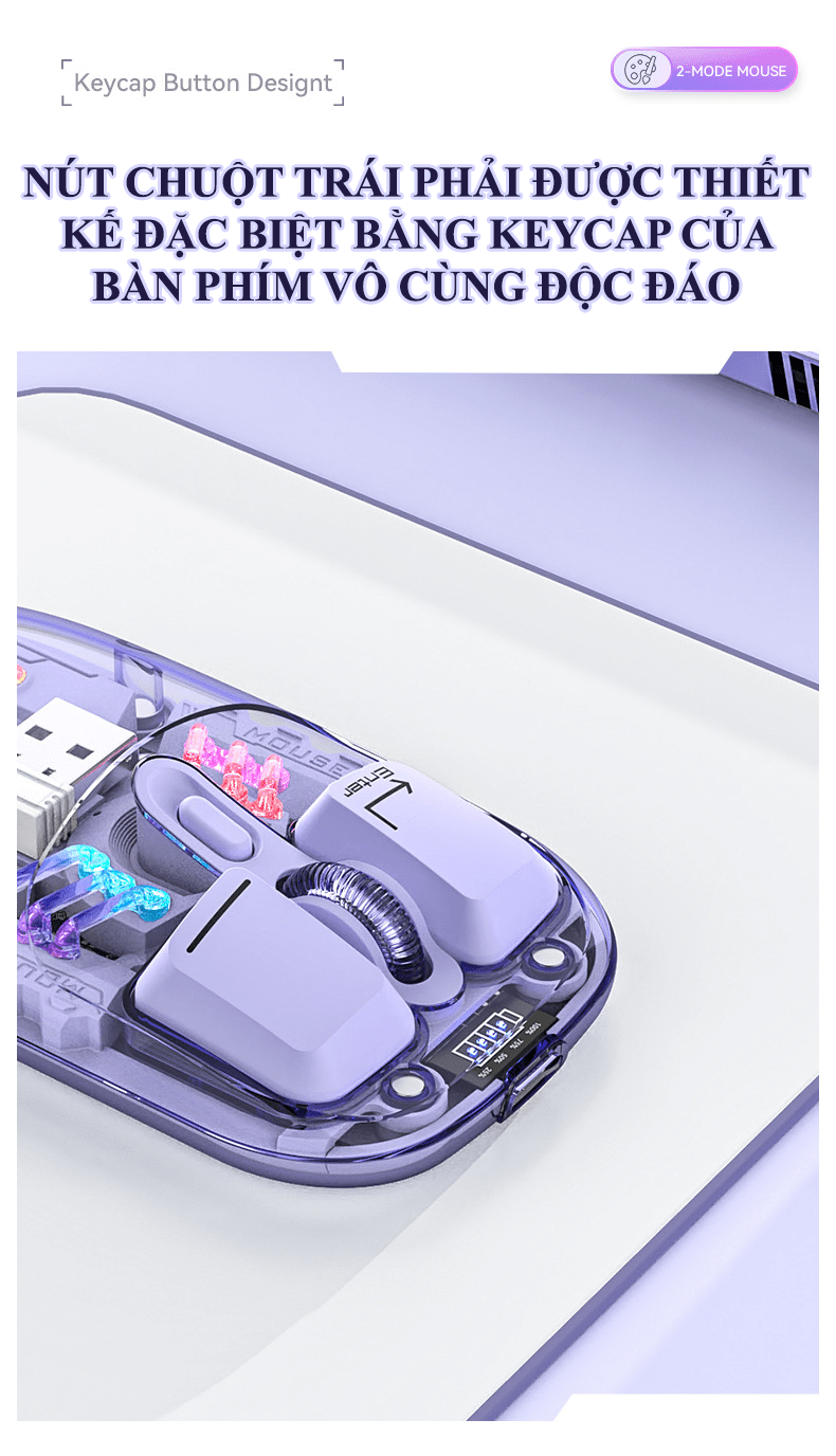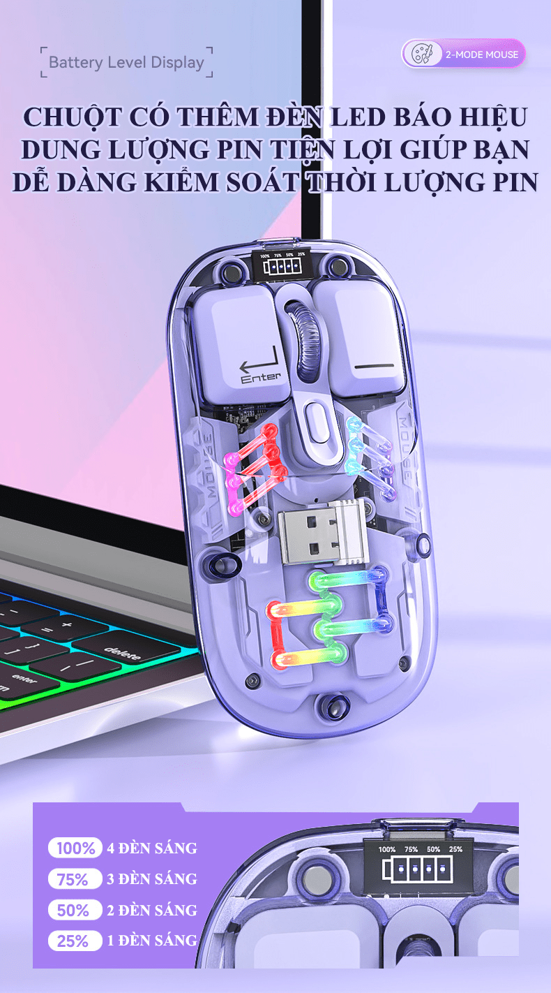Chuột không dây K-SNAKE BM200 kết nối BLUETOOTH và USB 2.4G thiết kế trong suốt siêu mỏng với đèn led RGB cực đẹp