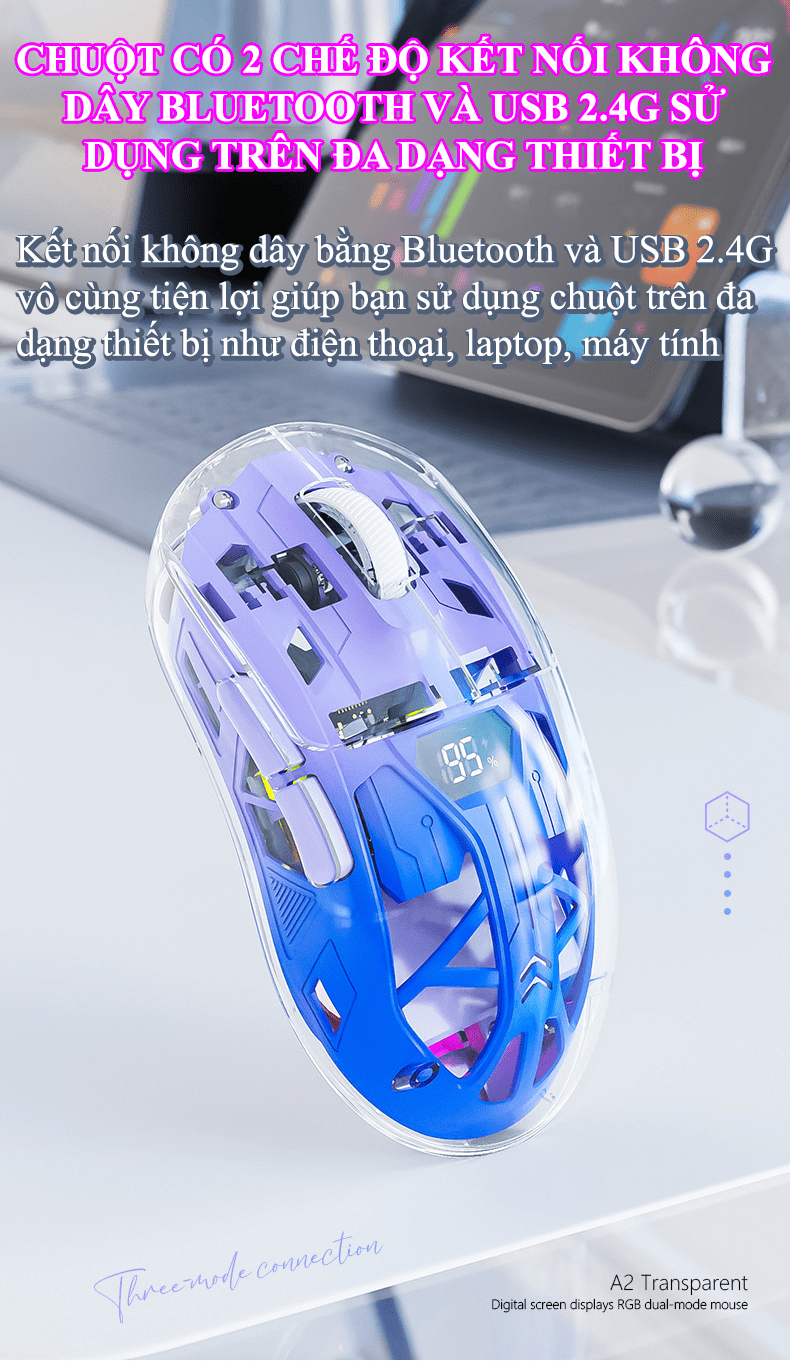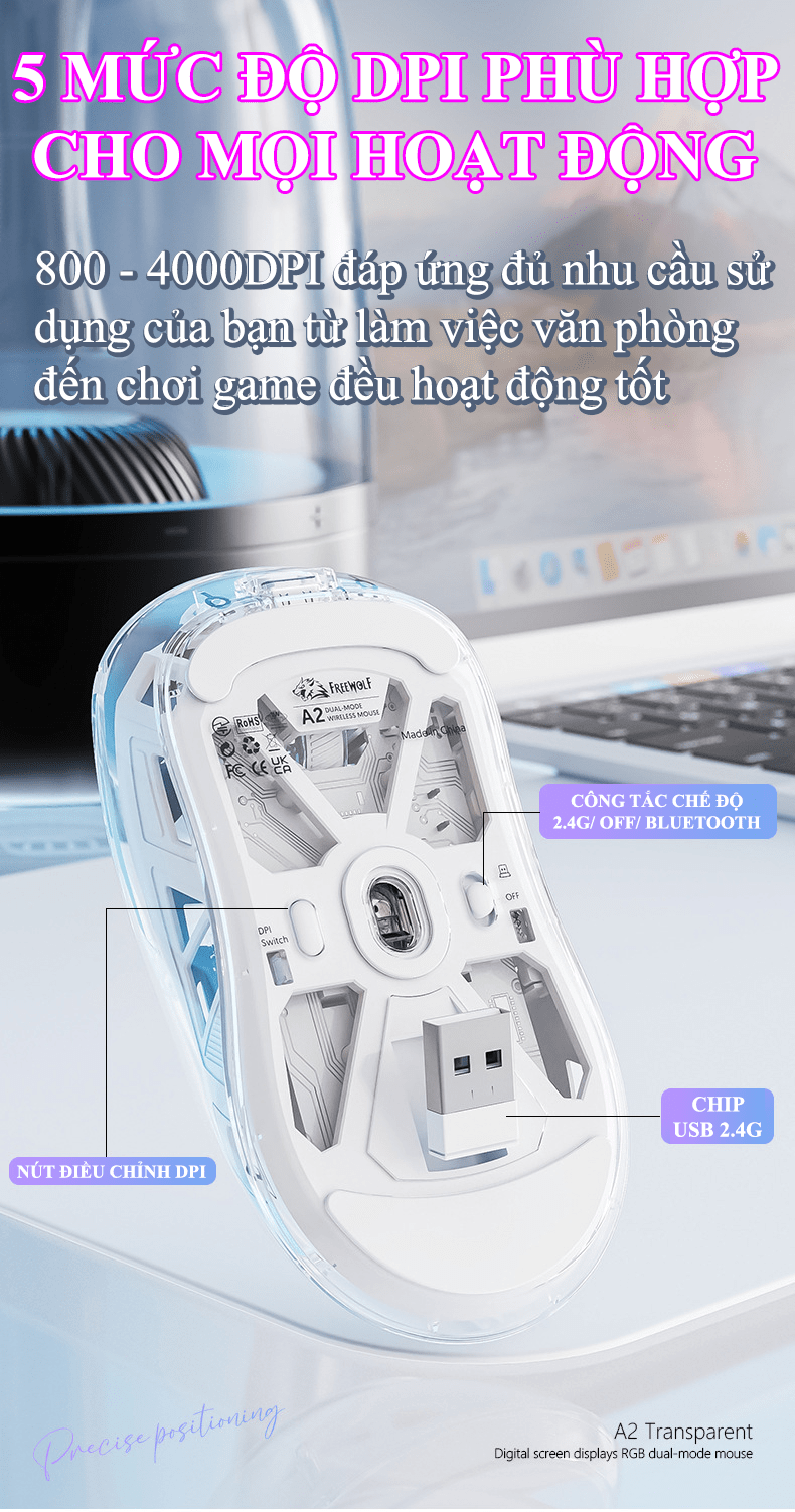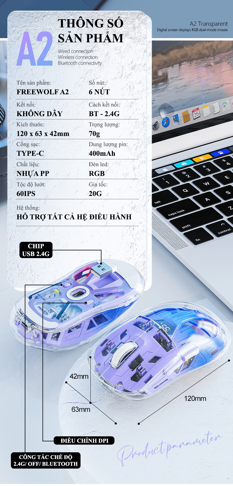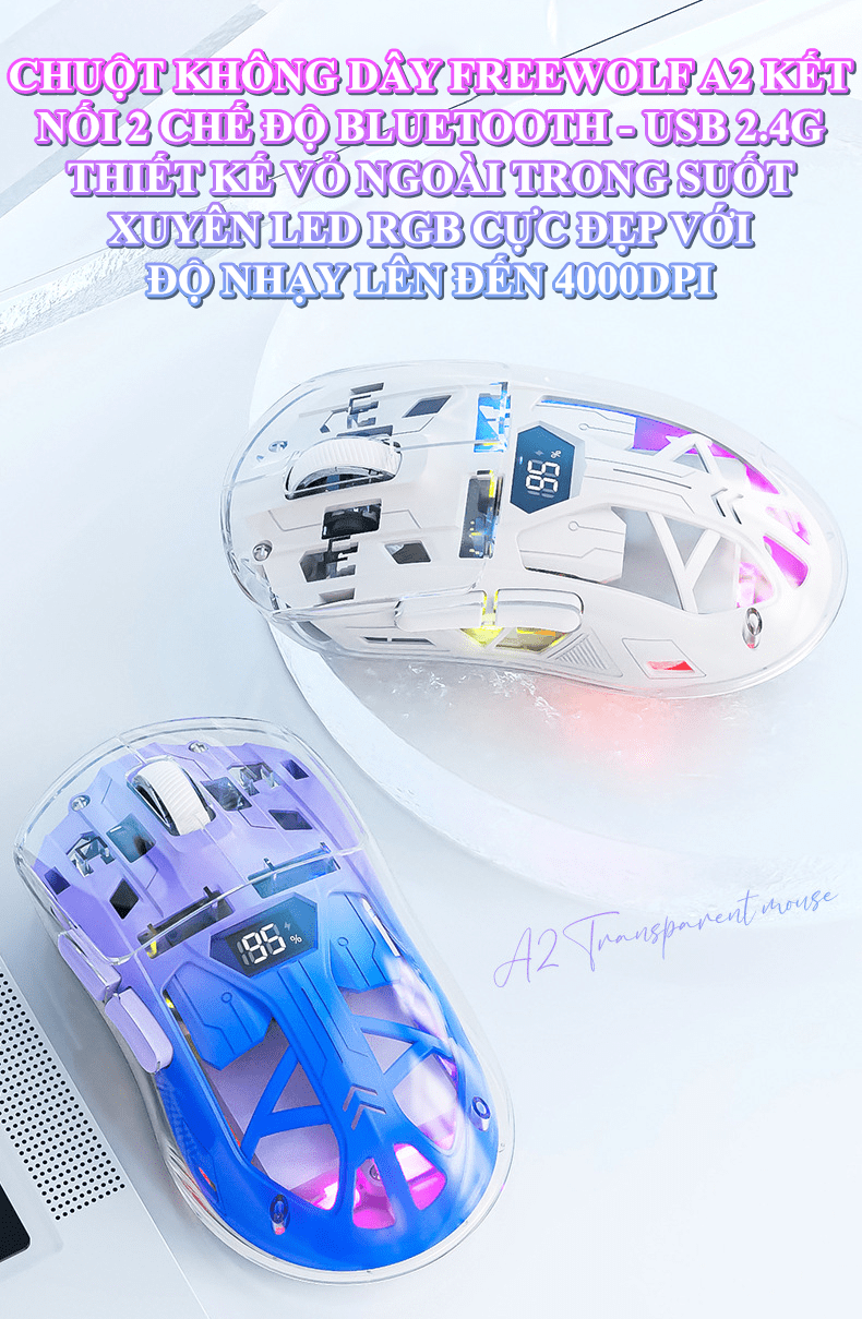 Chuột không dây trong suốt FREEWOLF A2 kết nối 2 chế độ BLUETOOTH và USB 2.4G có đèn led RGB cực đẹp