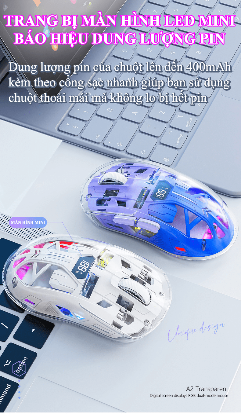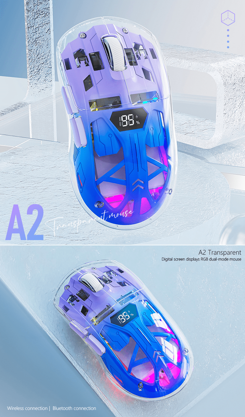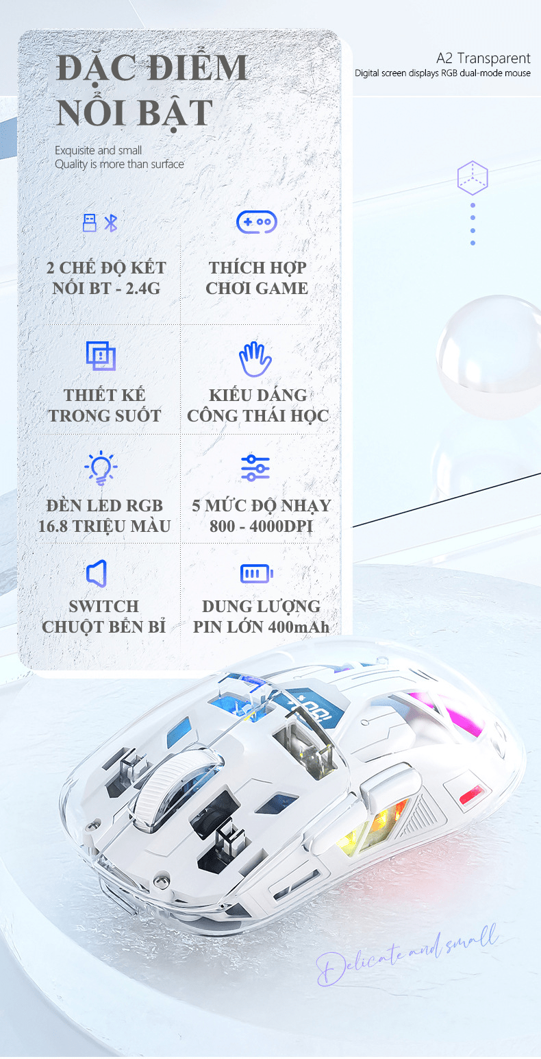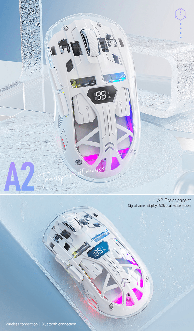 Chuột không dây trong suốt FREEWOLF A2 kết nối 2 chế độ BLUETOOTH và USB 2.4G có đèn led RGB cực đẹp