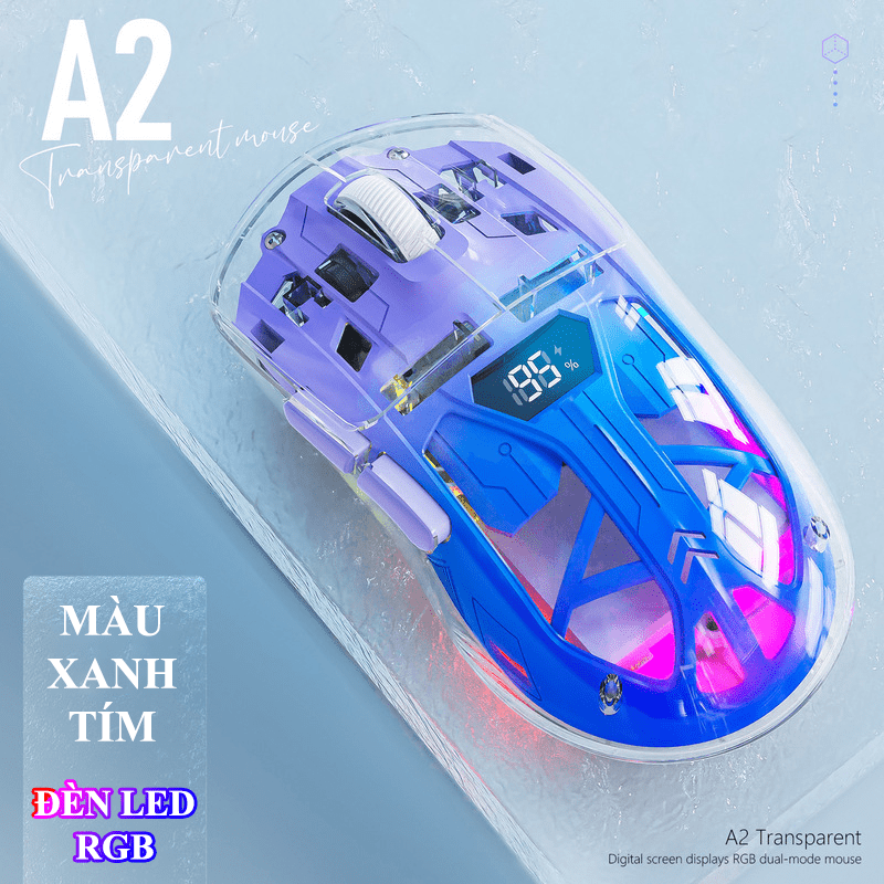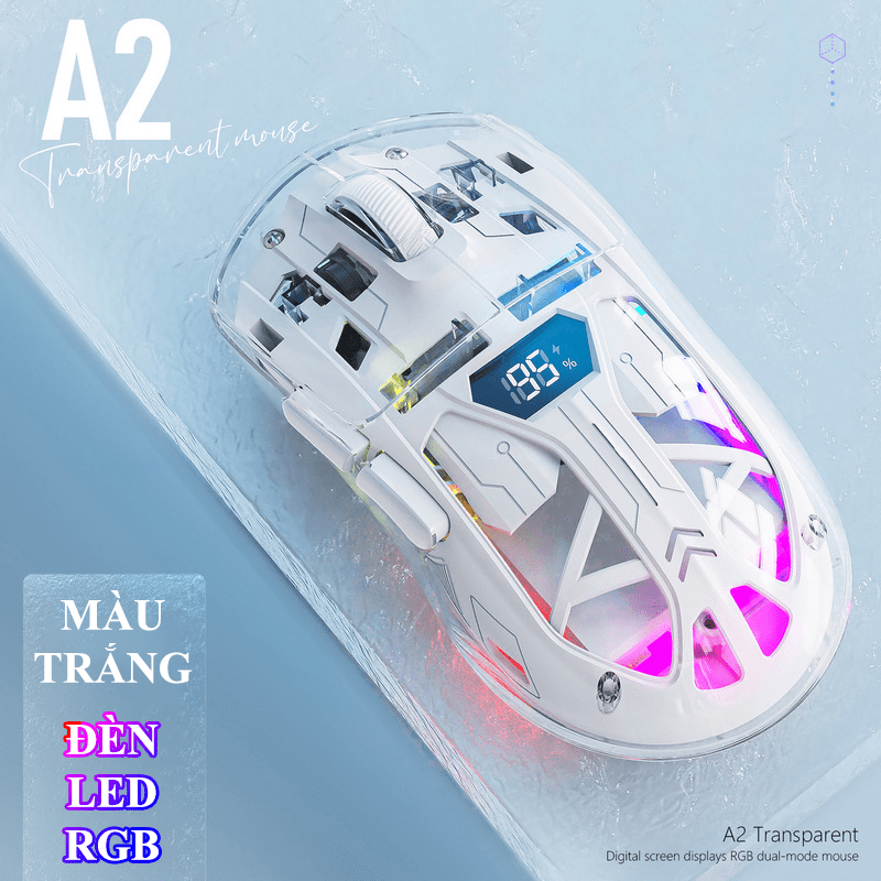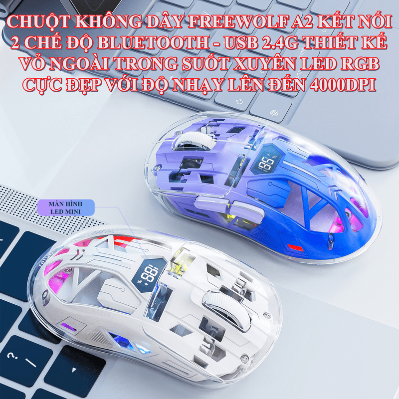 Chuột không dây trong suốt FREEWOLF A2 kết nối 2 chế độ BLUETOOTH và USB 2.4G có đèn led RGB cực đẹp