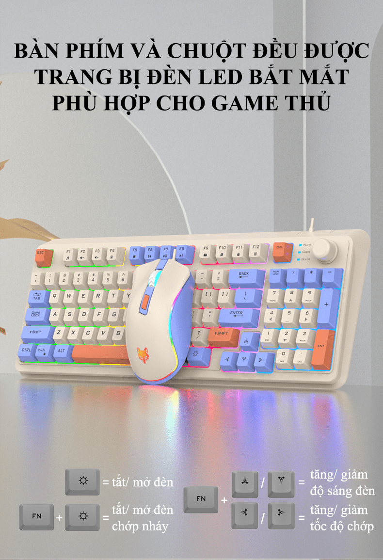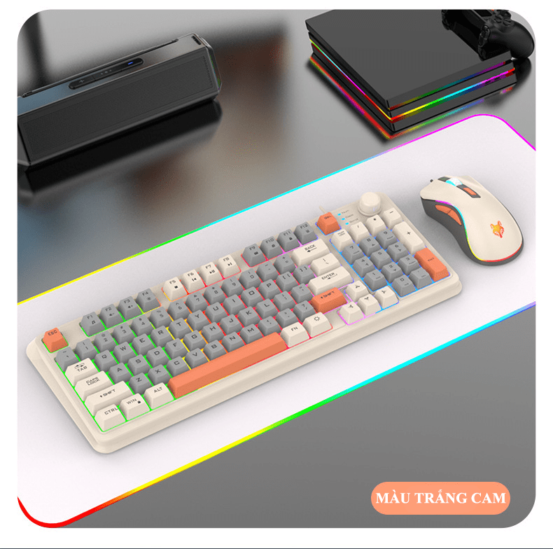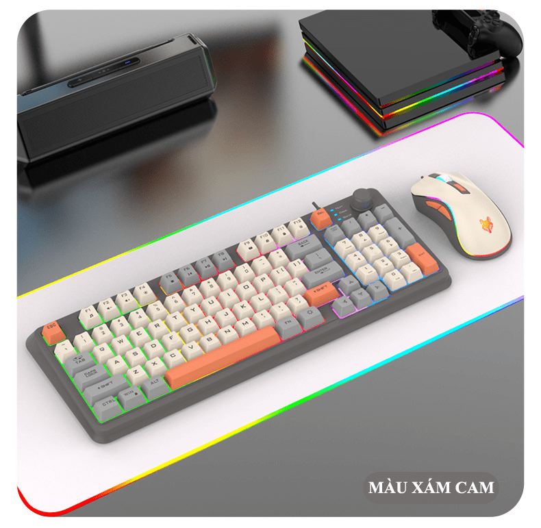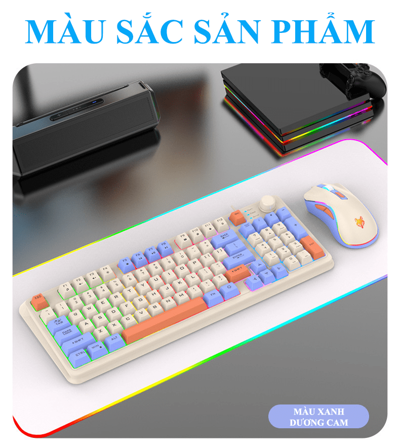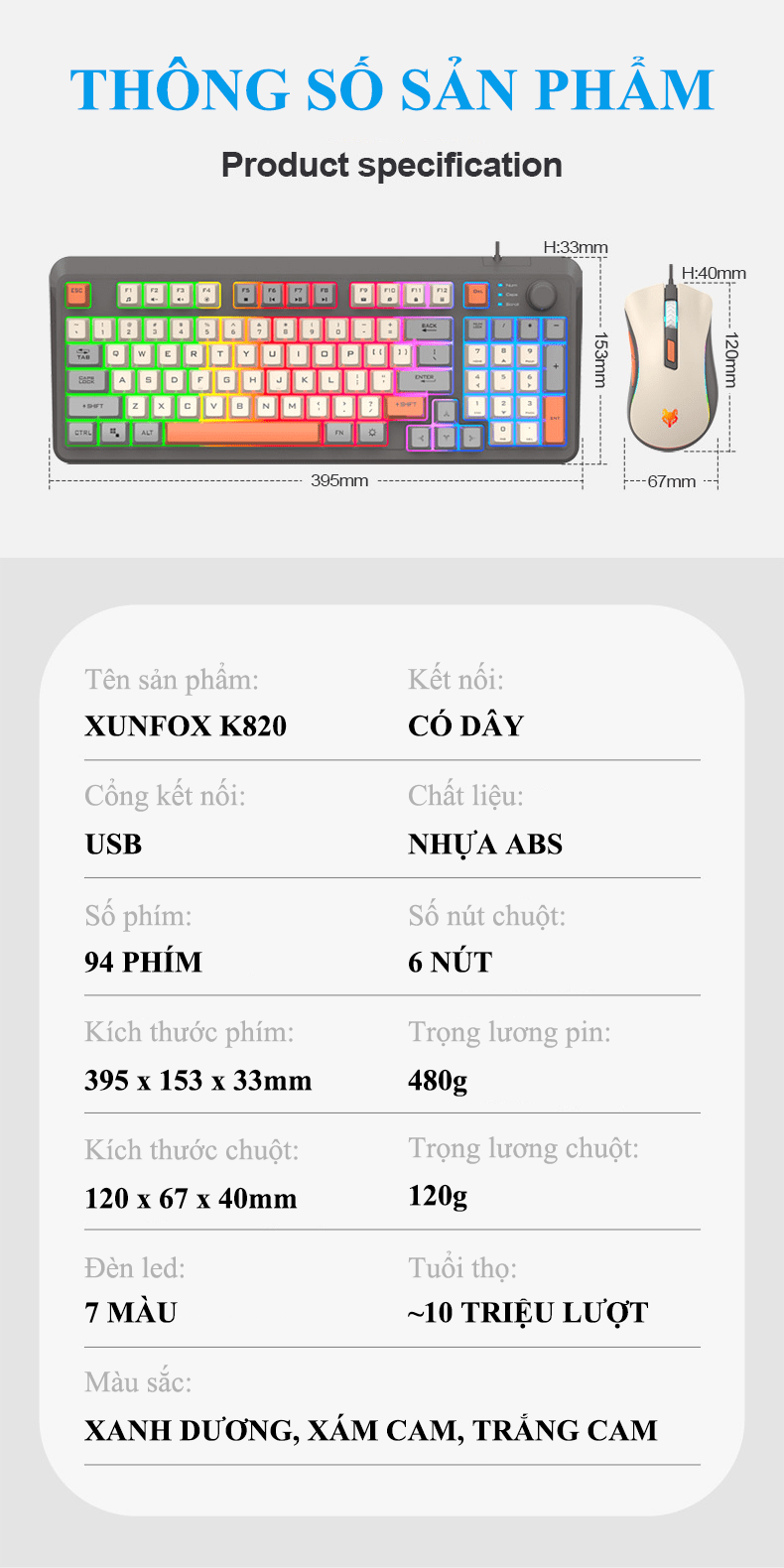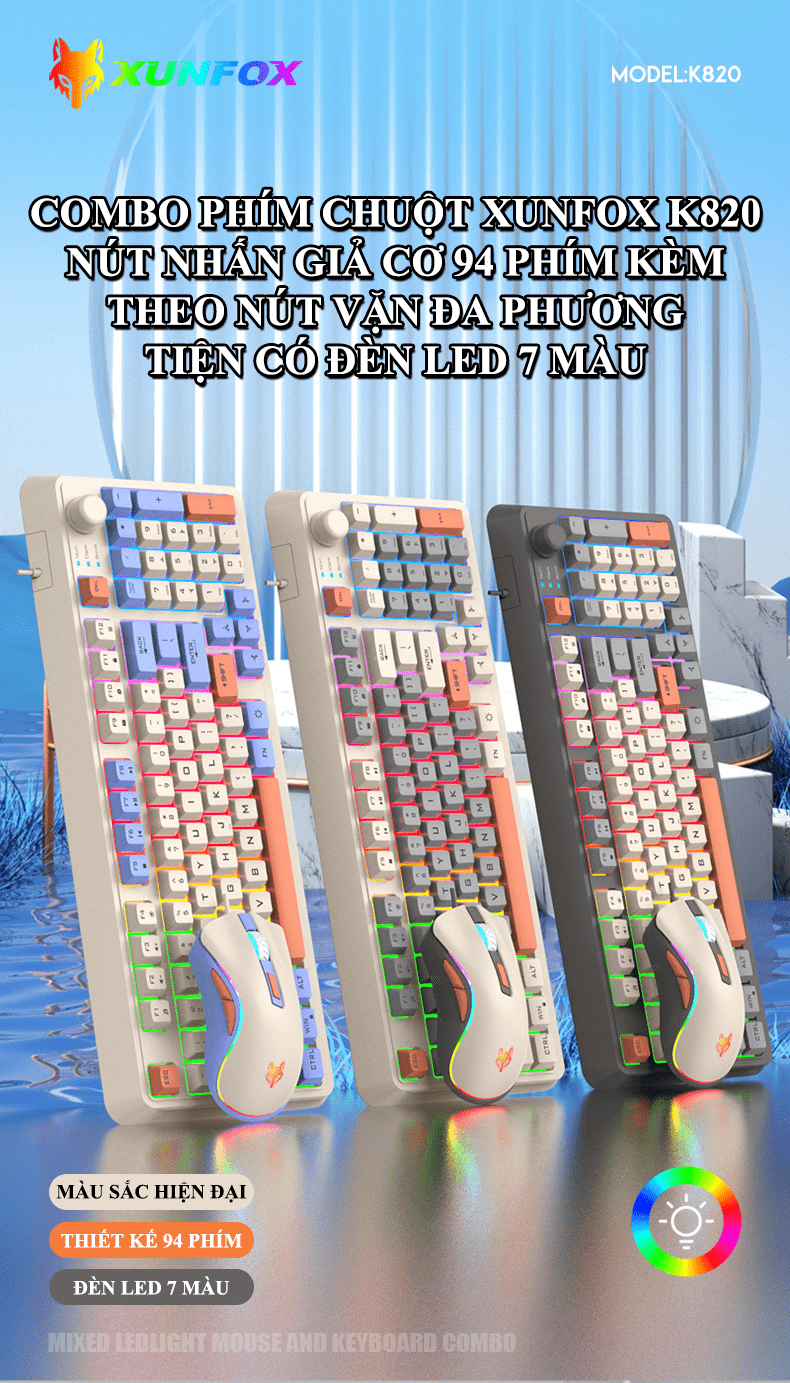 Combo phím chuột có dây XUNFOX K820 thiết kế 94 phím có nút vặn âm lượng tiện lợi kèm theo đèn led 7 màu cực đẹp