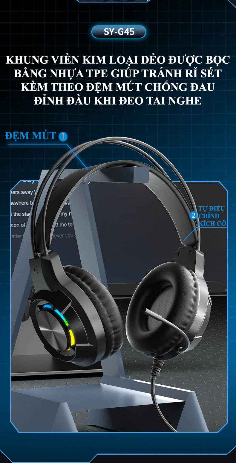 - Tai nghe có dây game thủ SY-G45 được thiết kế ôm khít mọi cỡ đầu và tạo được cảm giác dễ chịu trong một thời gian sử dụng dài.