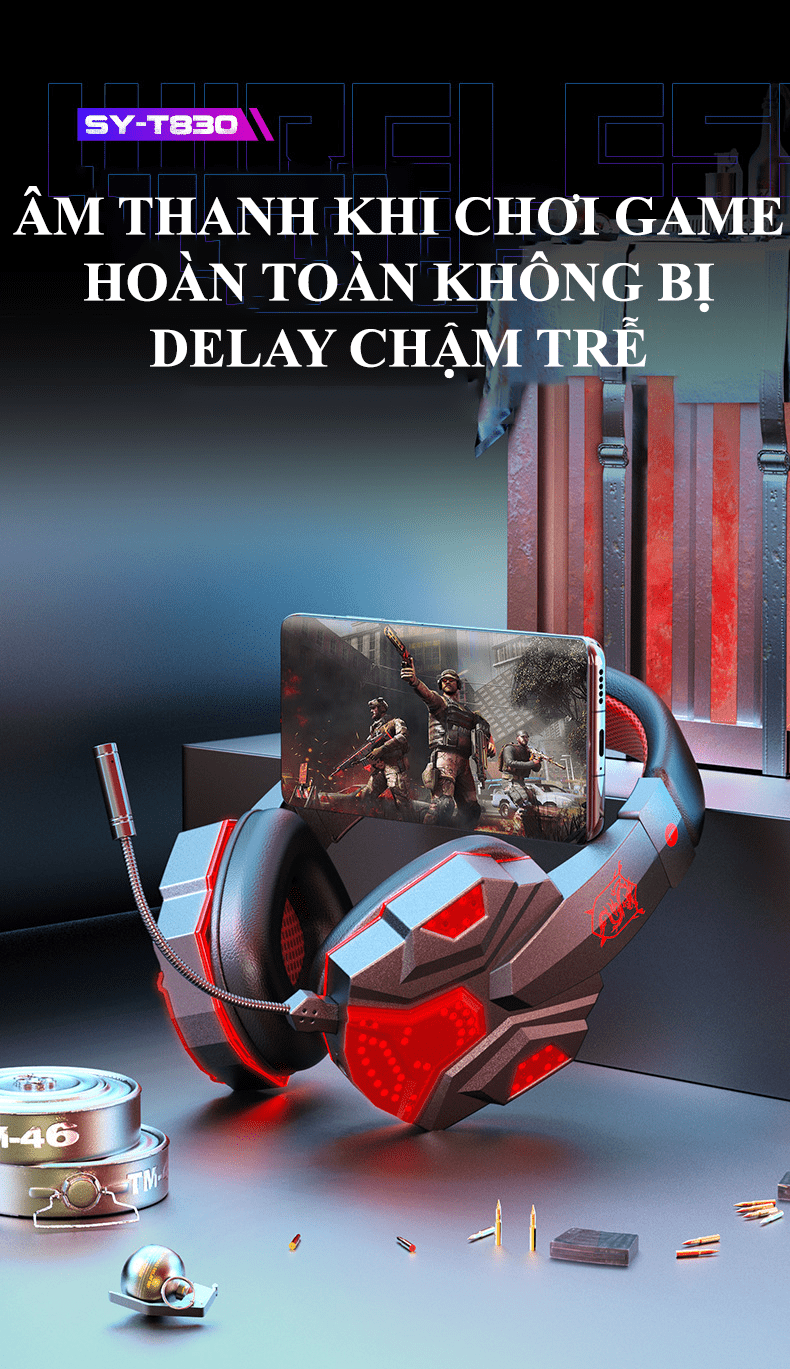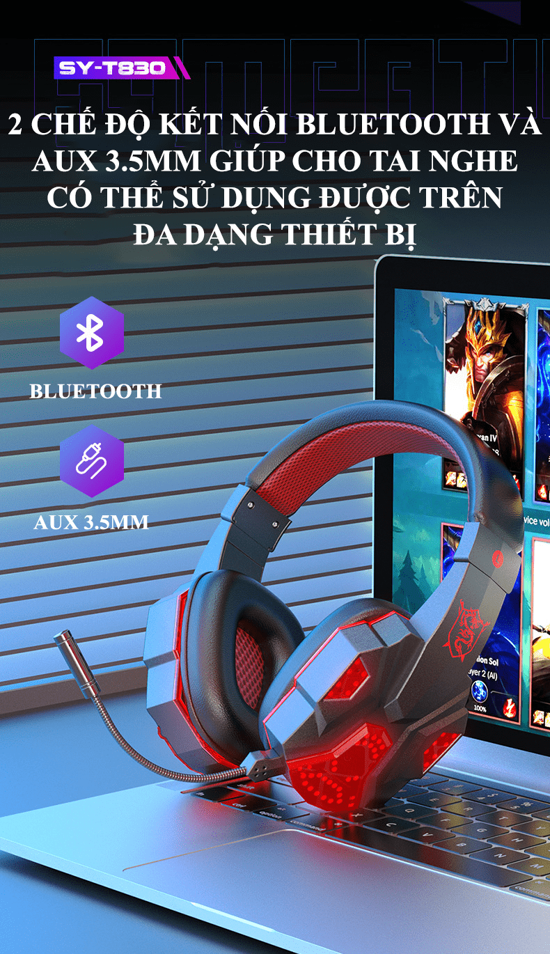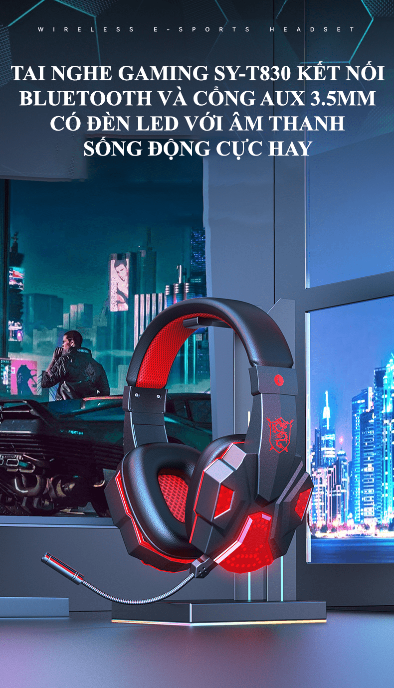 Tai nghe gaming SY-T830 kết nối bằng Bluetooth và cổng AUX 3.5mm có đèn led và âm thanh sống động phù hợp cho game thủ