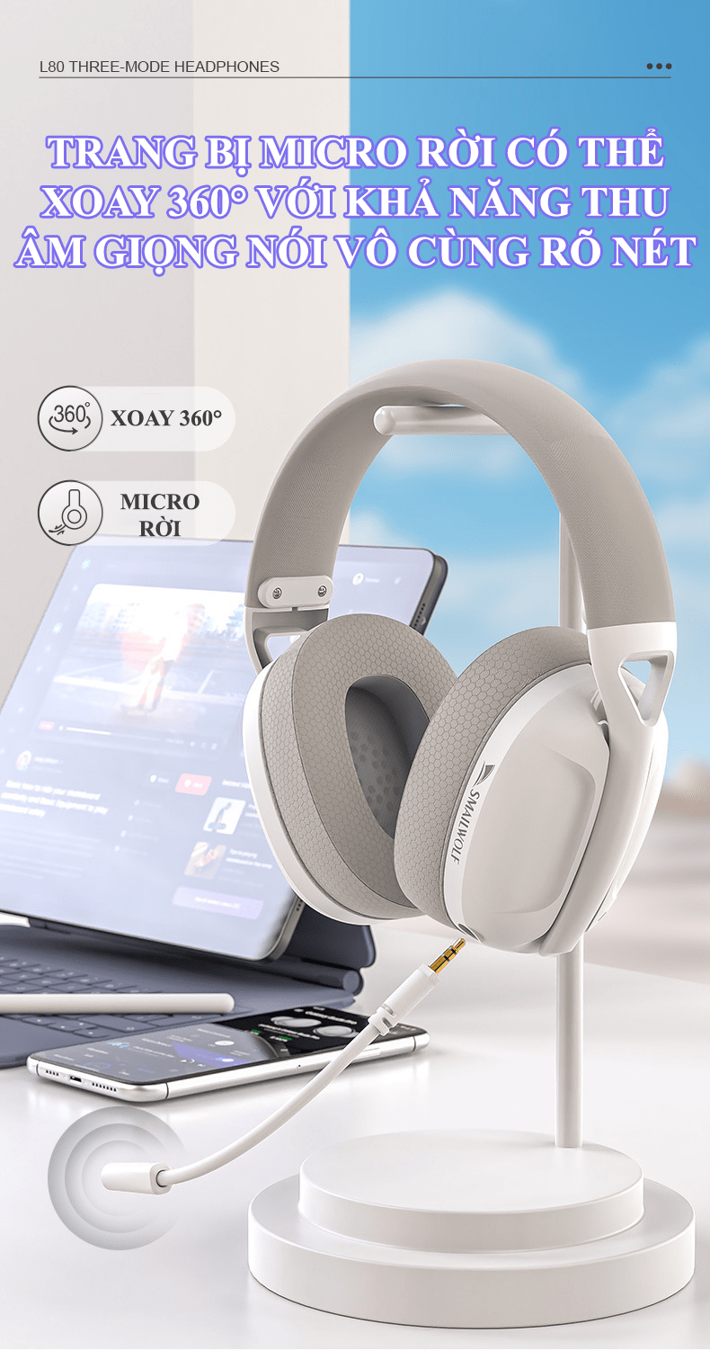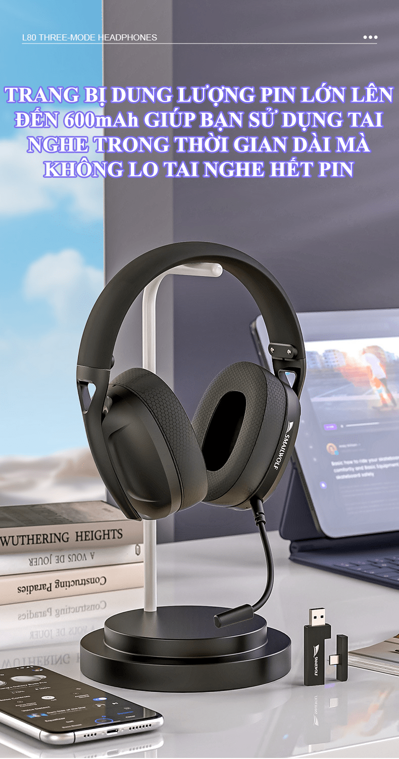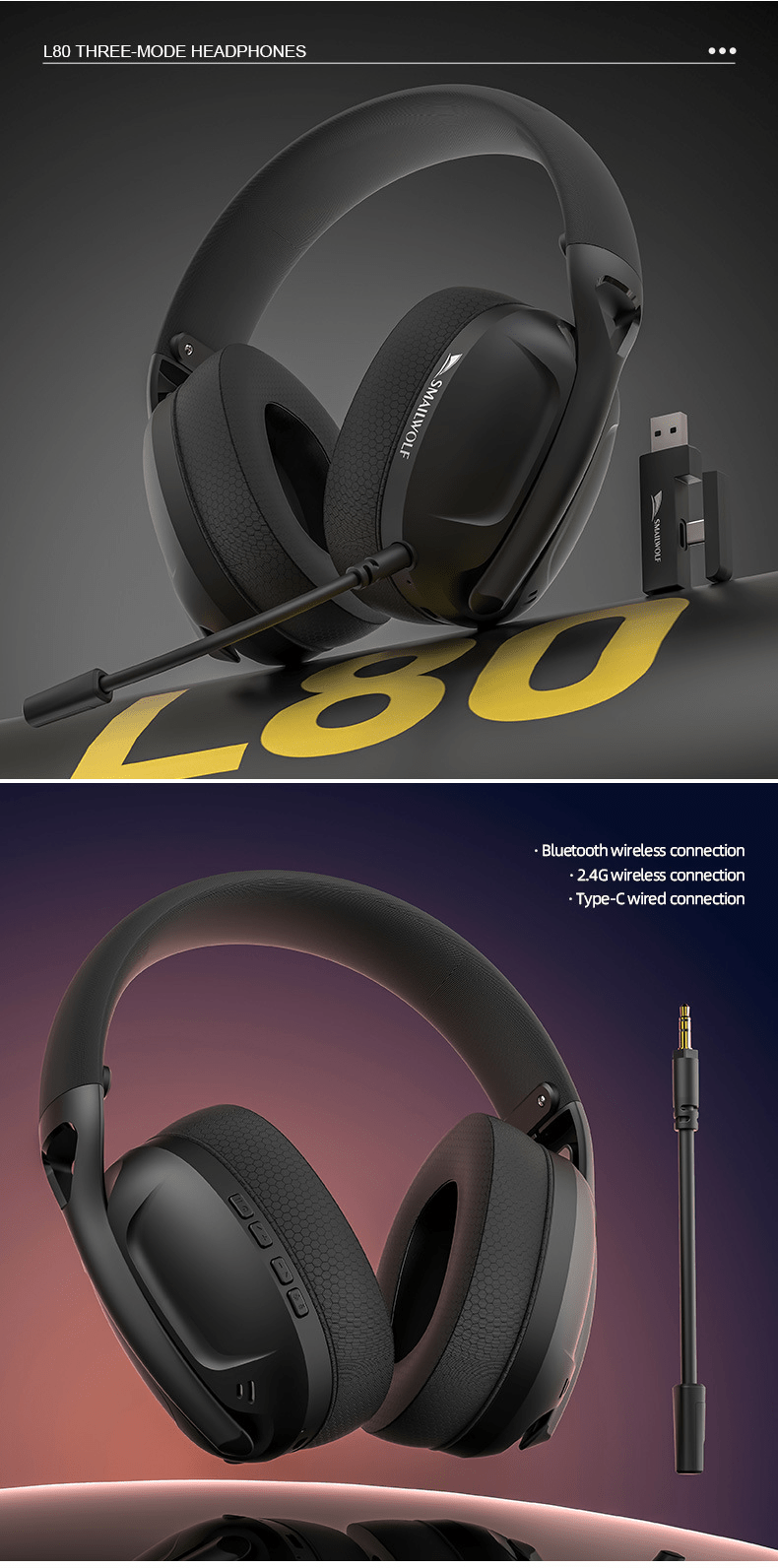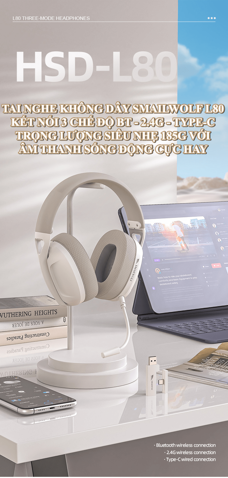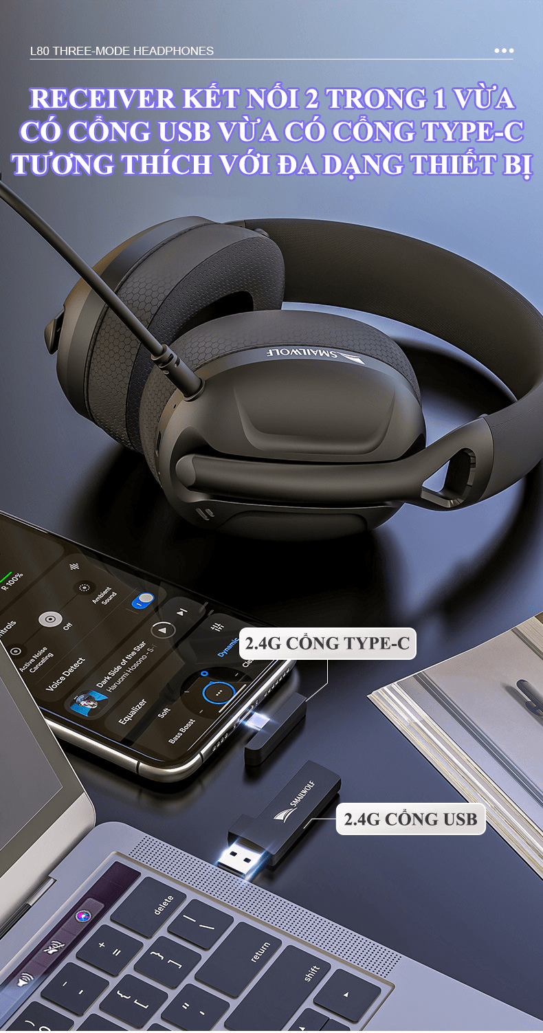 Tai nghe không dây SMAILWOLF L80 thế hệ mới kết nối 3 chế độ Bluetooth - 2.4G - Type-C với âm thanh 3D sống động kèm theo micro khử tiếng ồn hỗ trợ đàm thoại