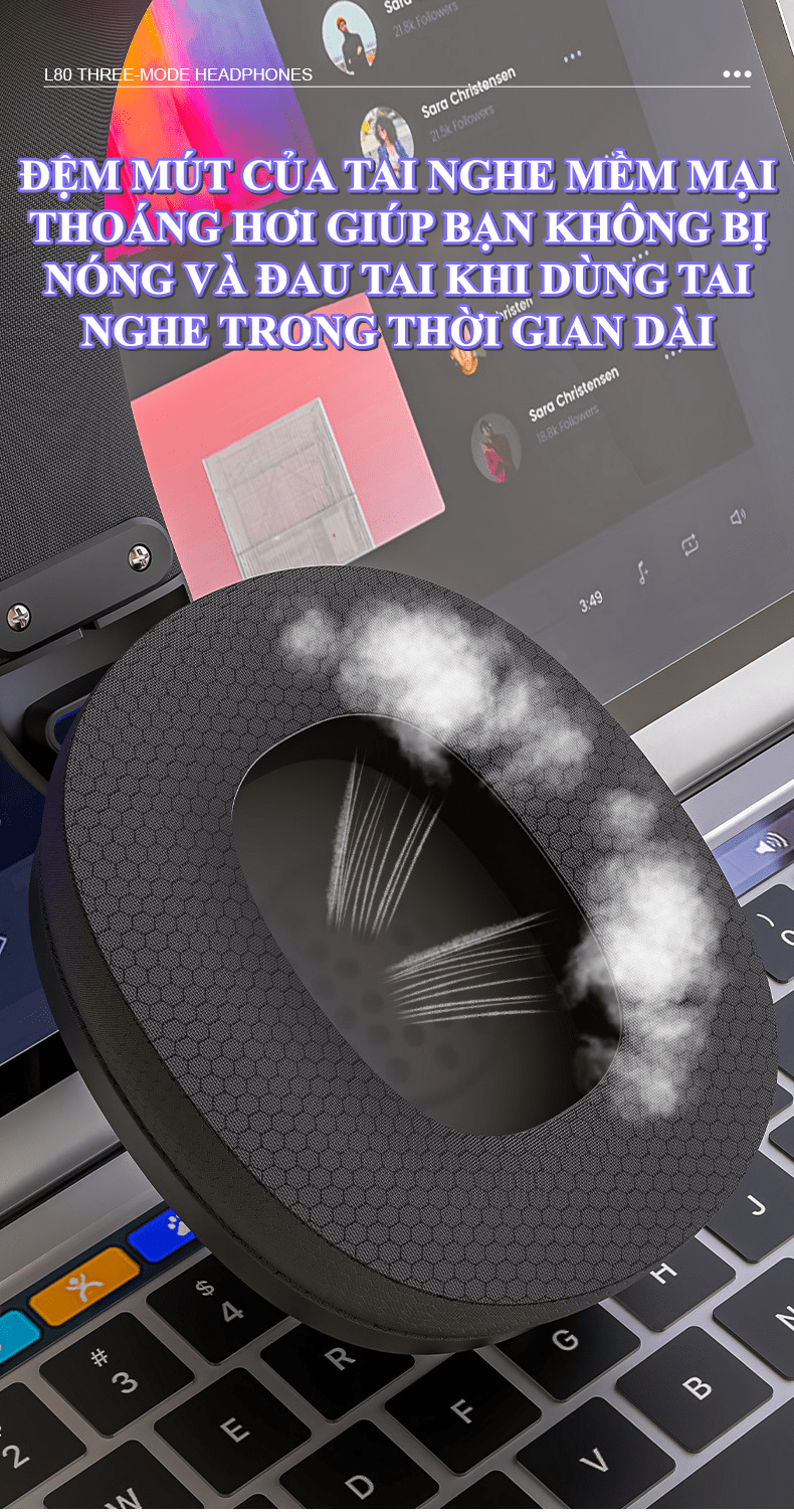 - Thiết kế thoải mái và siêu nhẹ: Tai nghe không dây được làm từ mút xốp nhớ siêu mềm thoáng khí với cốc tai dạng lưới và băng đô có thể điều chỉnh để phù hợp với nhiều hình dạng đầu khác nhau. Với thiết kế siêu nhẹ (185gram), bạn sẽ không cảm thấy áp lực ngay cả khi chơi game hoặc nghe nhạc trong thời gian dài. Tai nghe hoàn toàn bao trọn tai, cách ly tiếng ồn và mang lại cảm giác đeo cực kỳ thoải mái cho việc sử dụng lâu dài.