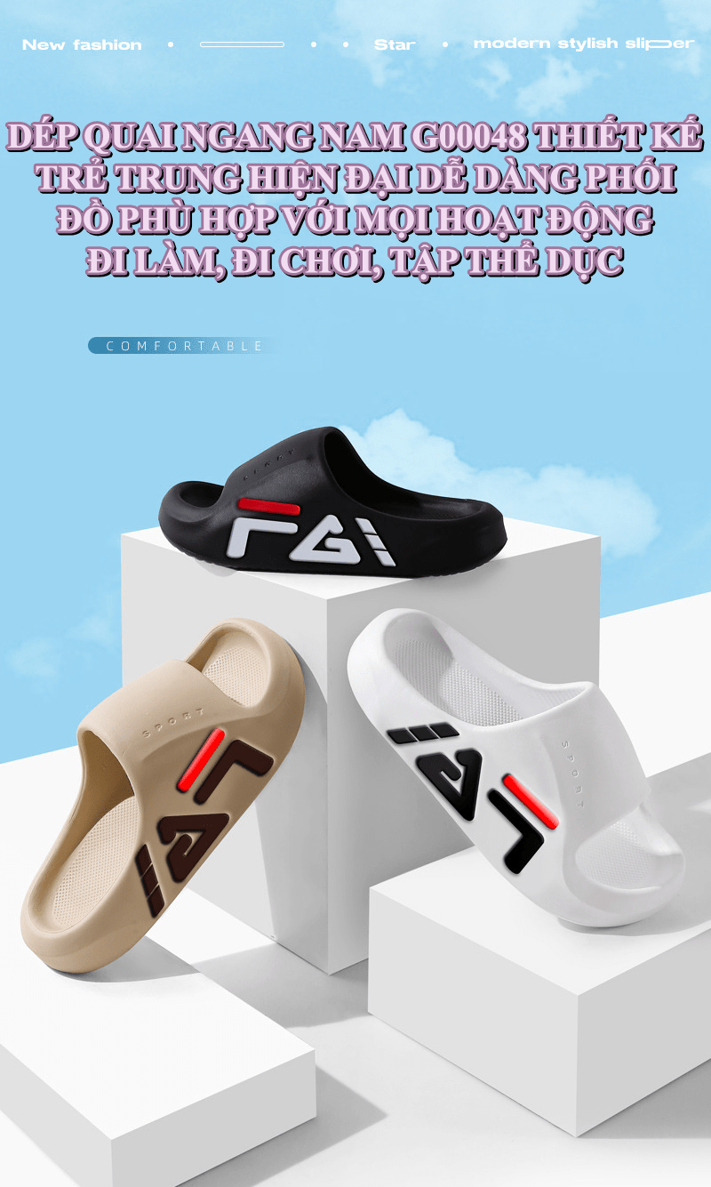 Dép quai ngang thời trang nam G00048 là mẫu dép được ưa chuộng nhờ thiết kế trẻ trung, chất liệu PVC mềm dẻo và đàn hồi tốt, mang lại cảm giác thoải mái khi sử dụng. Dòng sản phẩm này có nhiều màu sắc đa dạng, dễ dàng phối với nhiều loại trang phục từ casual đến thể thao.